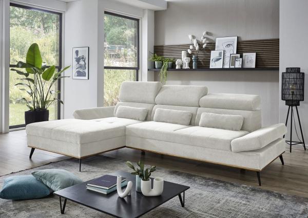 | Lieferumfang: | 1 Ecksofa mit linksseitig montierbarer Ottomane, 3 Kopfteilverstellungen, 2 verstellbare Armlehnen und 3 Nierenkissen |
