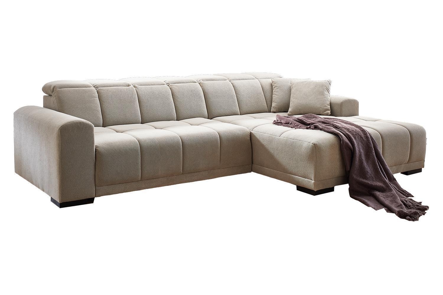 Im Lieferumfang enthalten ist ein Ecksofa mit rechtsseitig montierbarer Ottomane, elektrischer Sitztiefenverstellung, 3 Kopfteilverstellungen und 2 Zierkissen. Die Metallfüße setzen einen modernen Akzent und sorgen für Stabilität.