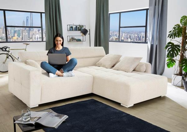 Das Ecksofa in Creme bietet mit seinen 2 verstellbaren Kopfstützen und der beidseitig montierbaren Ottomane höchsten Komfort und Flexibilität. Der Lieferumfang umfasst neben dem Sofa auch 2 Rollen-, 2 Wende- und 1 Zierkissen. Das großzügige Design mit einer Breite von 280 cm, einer Höhe von 96 cm und einer Tiefe von 231 cm sorgt für ausreichend Platz zum Entspannen. Der Cord-Bezug verleiht dem Sofa eine angenehme Haptik, während die Sitzhöhe von 47 cm ein bequemes Sitzen ermöglicht. Die Kopfteilverstellung bietet zusätzliche Funktionalität, und die mitgelieferten Kissen ergänzen das Sofa als stilvolle Extras.
