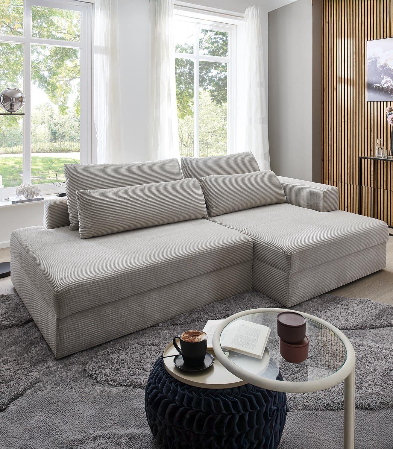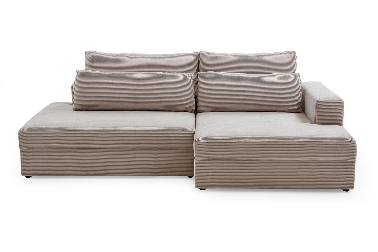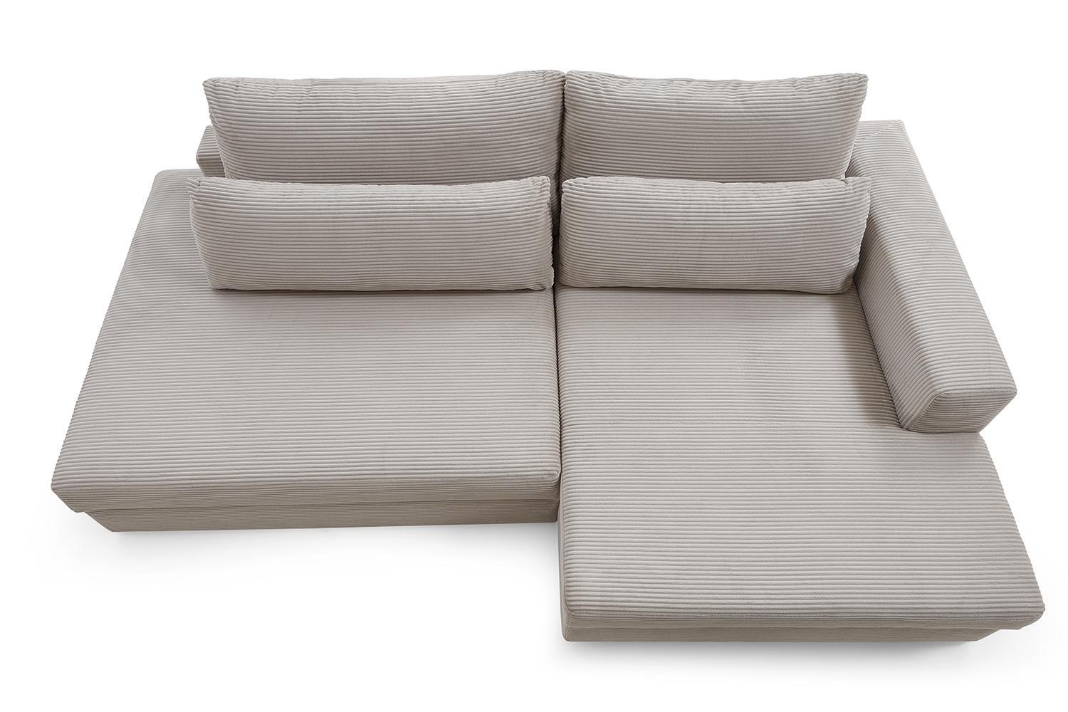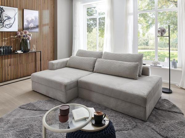 Das Ecksofa SEBO hat einen Cordbezug in der Farbe Greige. Es wird mit zwei mittelgroßen und zwei großen Rückenkissen geliefert. Die Ottomane ist rechtsseitig montierbar. Zusätzlich verfügt das Sofa über eine Ausziehfunktion und einen Bettkasten. Die Gesamtbreite beträgt 224 cm, die Tiefe 149 cm, und die Liegefläche hat die Maße 157 x 227 cm. Dieses Sofa bietet Funktionalität und flexible Nutzungsmöglichkeiten.