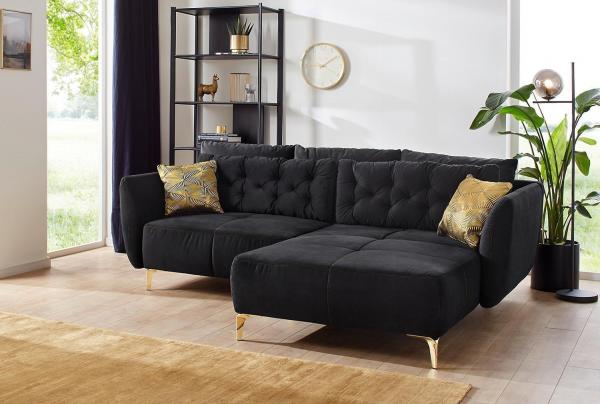 Das Ecksofa SELENE ist mit einem schwarzen Samtbezug ausgestattet. Die Stellfüße bestehen aus Metall in Goldgelb. Die Polsterung besteht aus Schaum und ist mit einer Nosagunterfederung versehen. Die Ottomane ist beidseitig montierbar. Zum Lieferumfang gehören fünf Rückenkissen und zwei Zierkissen. Die Gesamtbreite beträgt 251 cm, die Tiefe 186 cm. Die Liegefläche misst 100 x 210 cm.