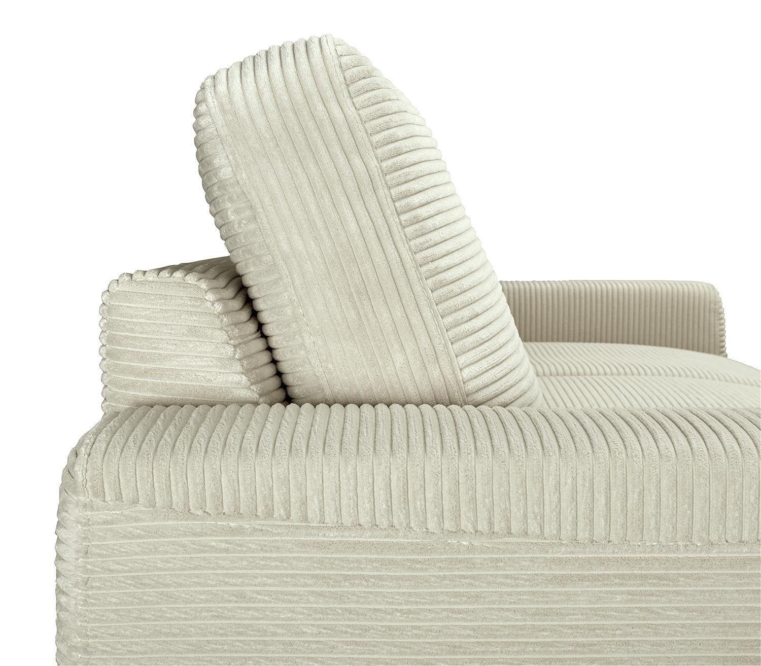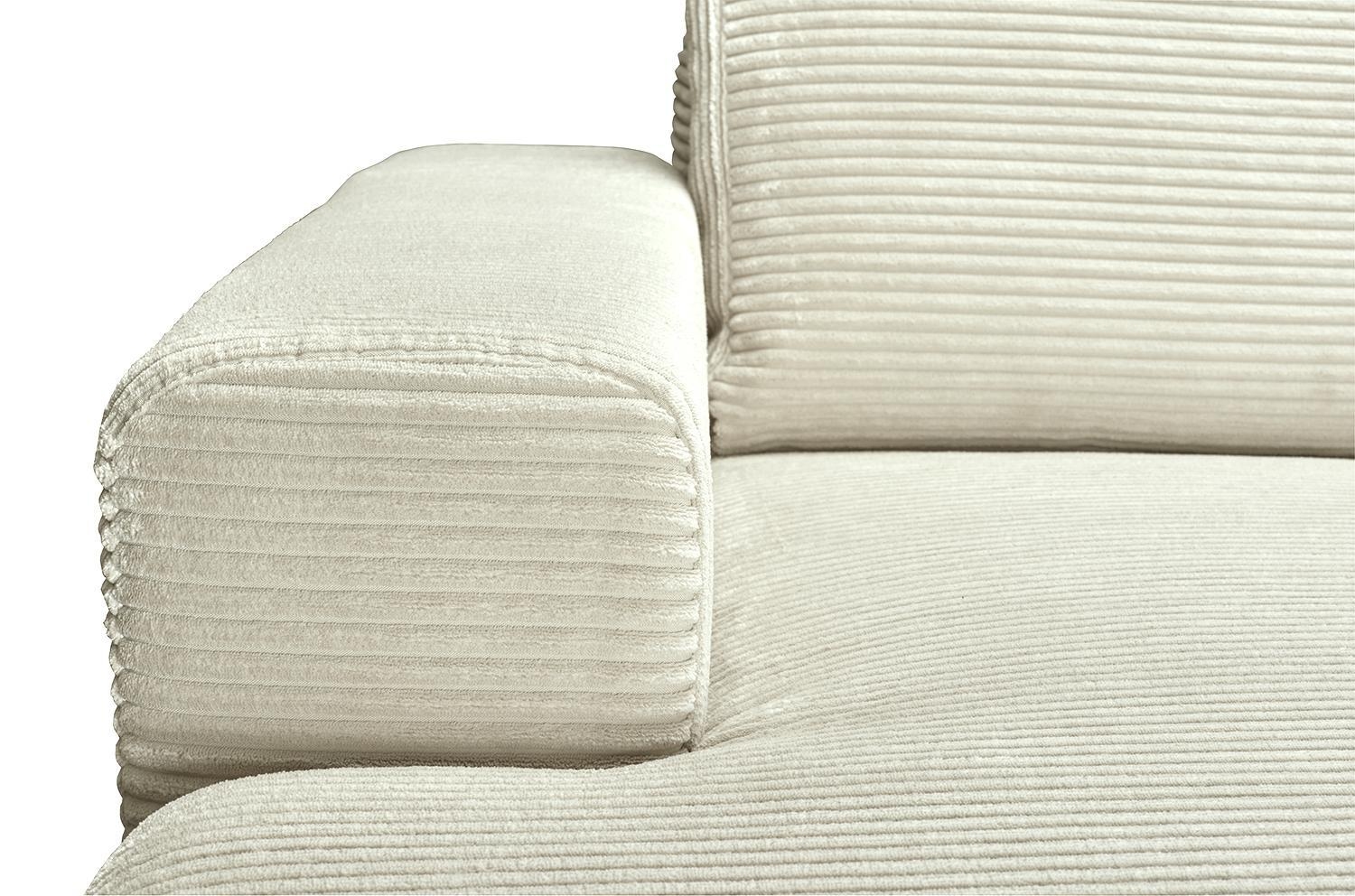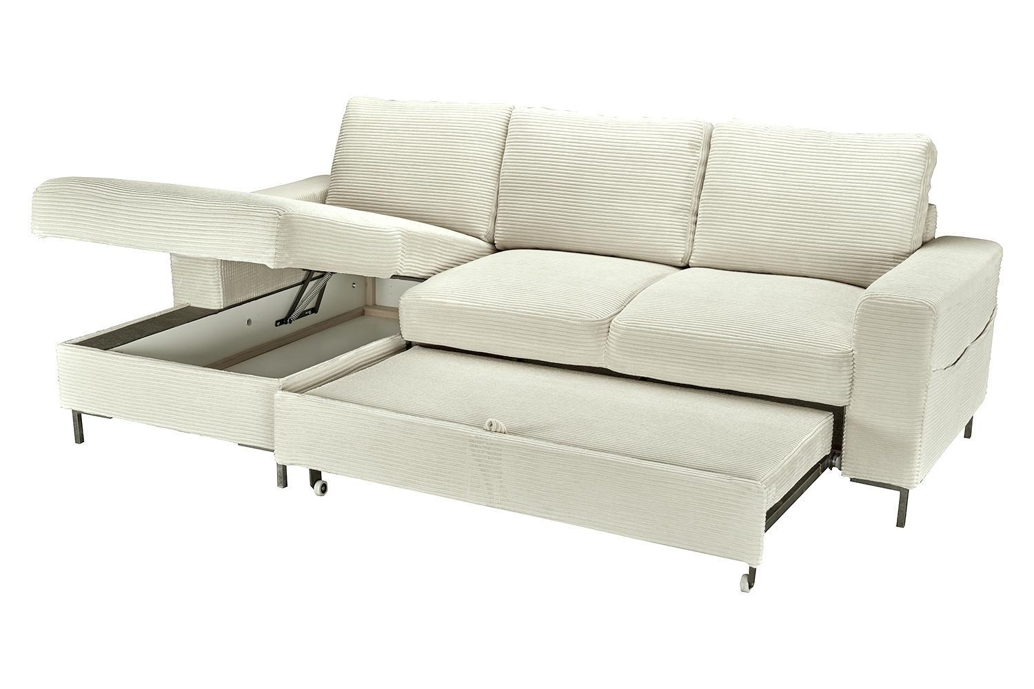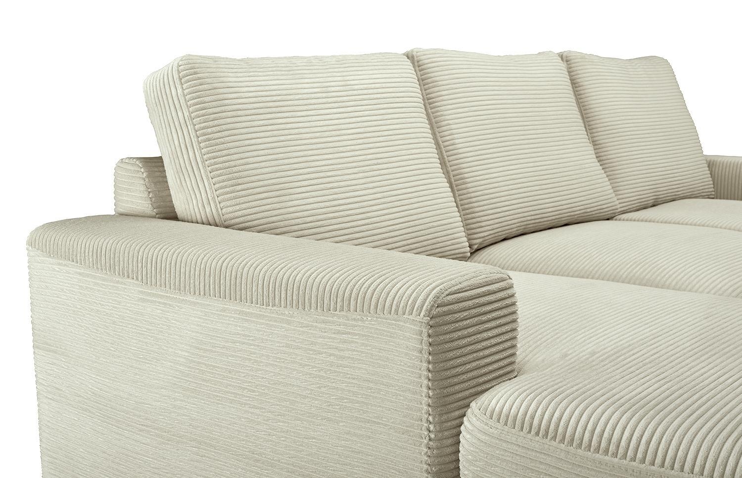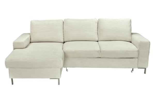 Das Ecksofa ULBERT ist mit einem Cordbezug in Beige ausgestattet und kombiniert eine Schaumstoffpolsterung mit Nosagunterfederung. Neben einer Ausziehfunktion bietet es auch einen praktischen Bettkasten. Für zusätzlichen Komfort liegen drei Rückenkissen bei. Die Ottomane ist linksseitig montierbar, während das Sofa auf schwarzen Metallfüßen steht. In der Breite misst das Modell 240 cm, die Höhe beträgt 70 cm, und die Tiefe liegt bei 150 cm. Die Liegefläche weist eine Größe von 135 x 200 cm auf.