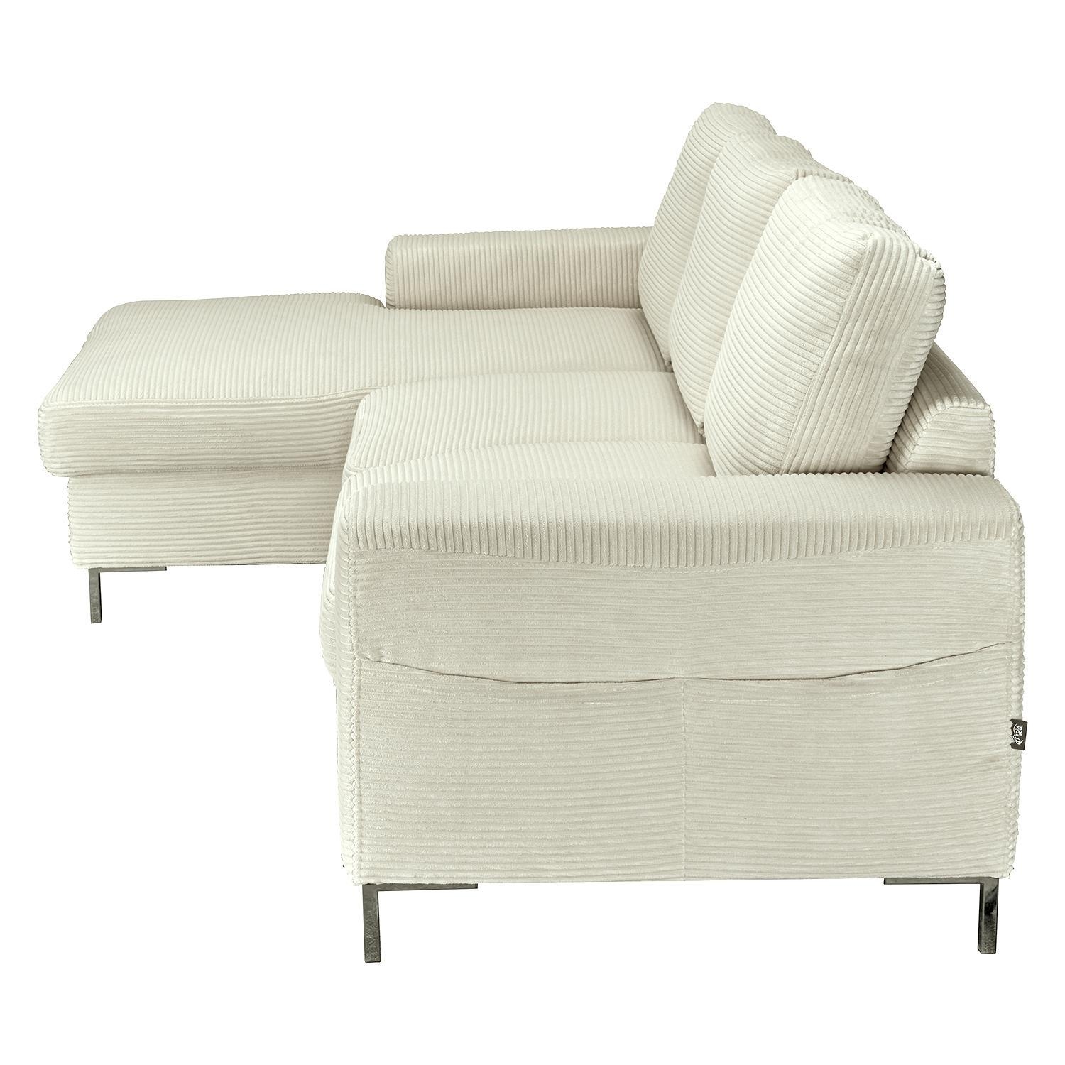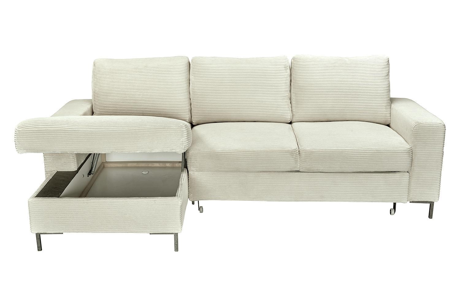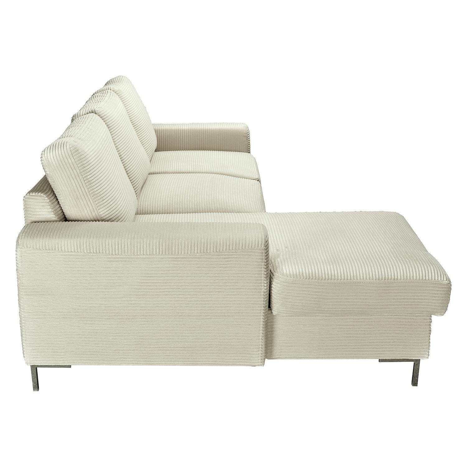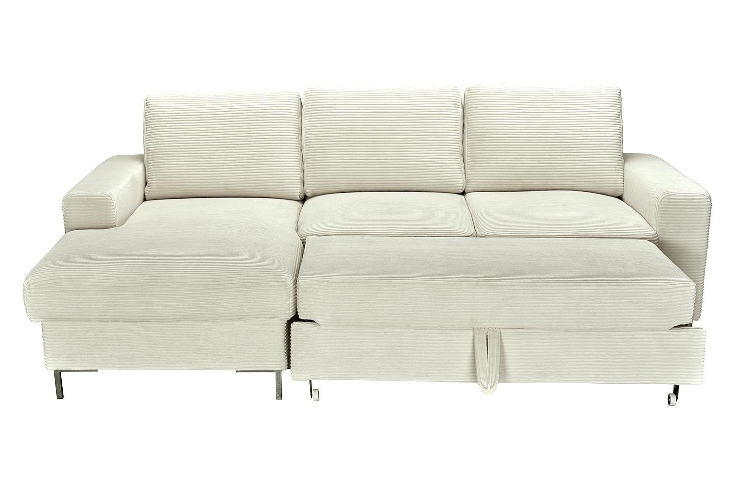 Das Ecksofa ULBERT ist mit einem Cordbezug in Beige ausgestattet und kombiniert eine Schaumstoffpolsterung mit Nosagunterfederung. Neben einer Ausziehfunktion bietet es auch einen praktischen Bettkasten. Für zusätzlichen Komfort liegen drei Rückenkissen bei. Die Ottomane ist linksseitig montierbar, während das Sofa auf schwarzen Metallfüßen steht. In der Breite misst das Modell 240 cm, die Höhe beträgt 70 cm, und die Tiefe liegt bei 150 cm. Die Liegefläche weist eine Größe von 135 x 200 cm auf.