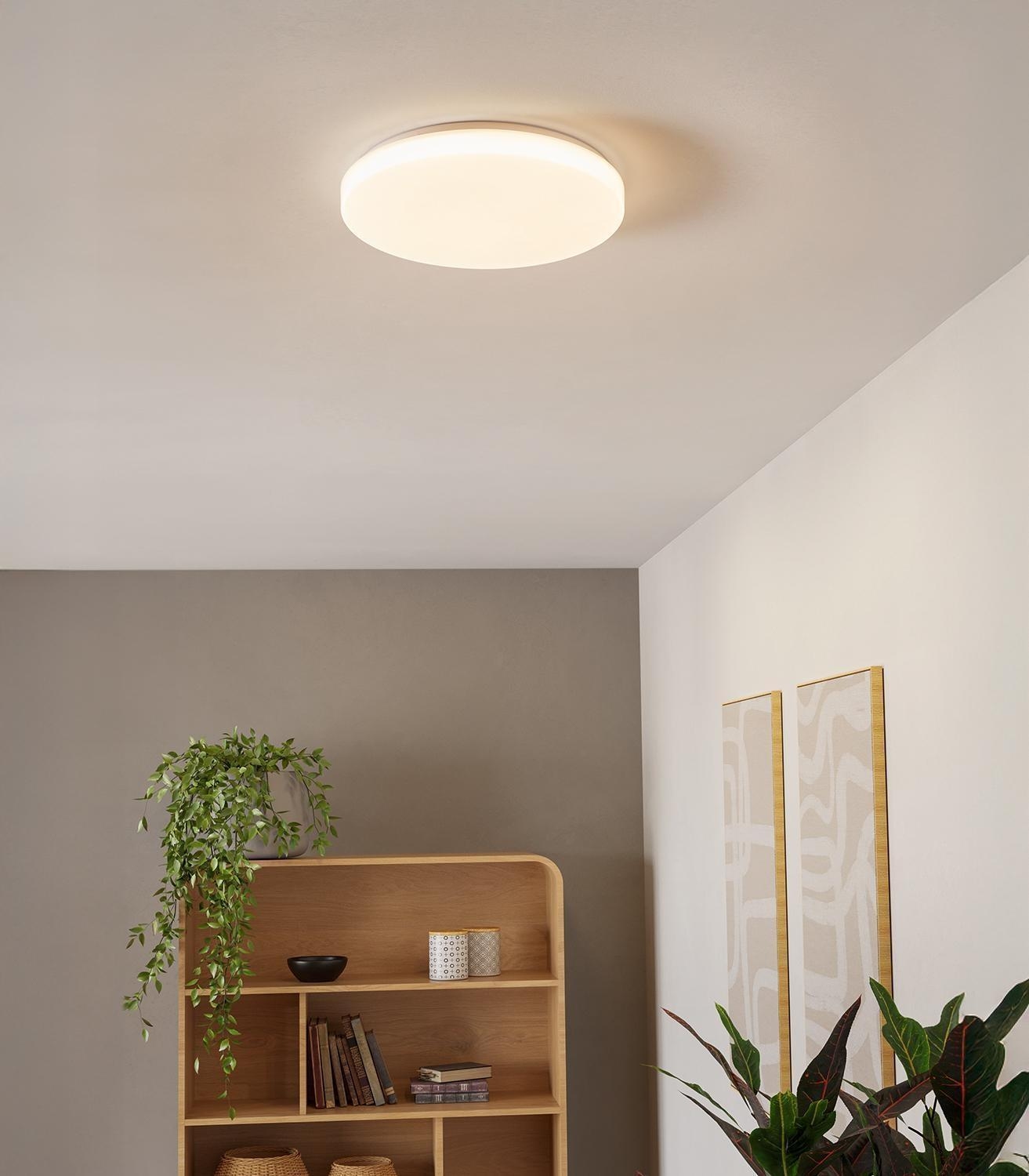 Die LED-Deckenleuchte POGLIOLA der Marke EGLO besteht aus weißem Kunststoff und verfügt über eine Deckenhalterung aus weiß lackiertem Stahl. Sie hat einen Durchmesser von 31 cm und eine Höhe von 5,5 cm. Das fest verbaute LED-Leuchtmittel ist im Lieferumfang enthalten und nicht austauschbar. Mit einer Leistung von 15,5 Watt erzeugt die Leuchte ein warmweißes Licht von 3000 Kelvin und erreicht eine Helligkeit von 1900 Lumen.