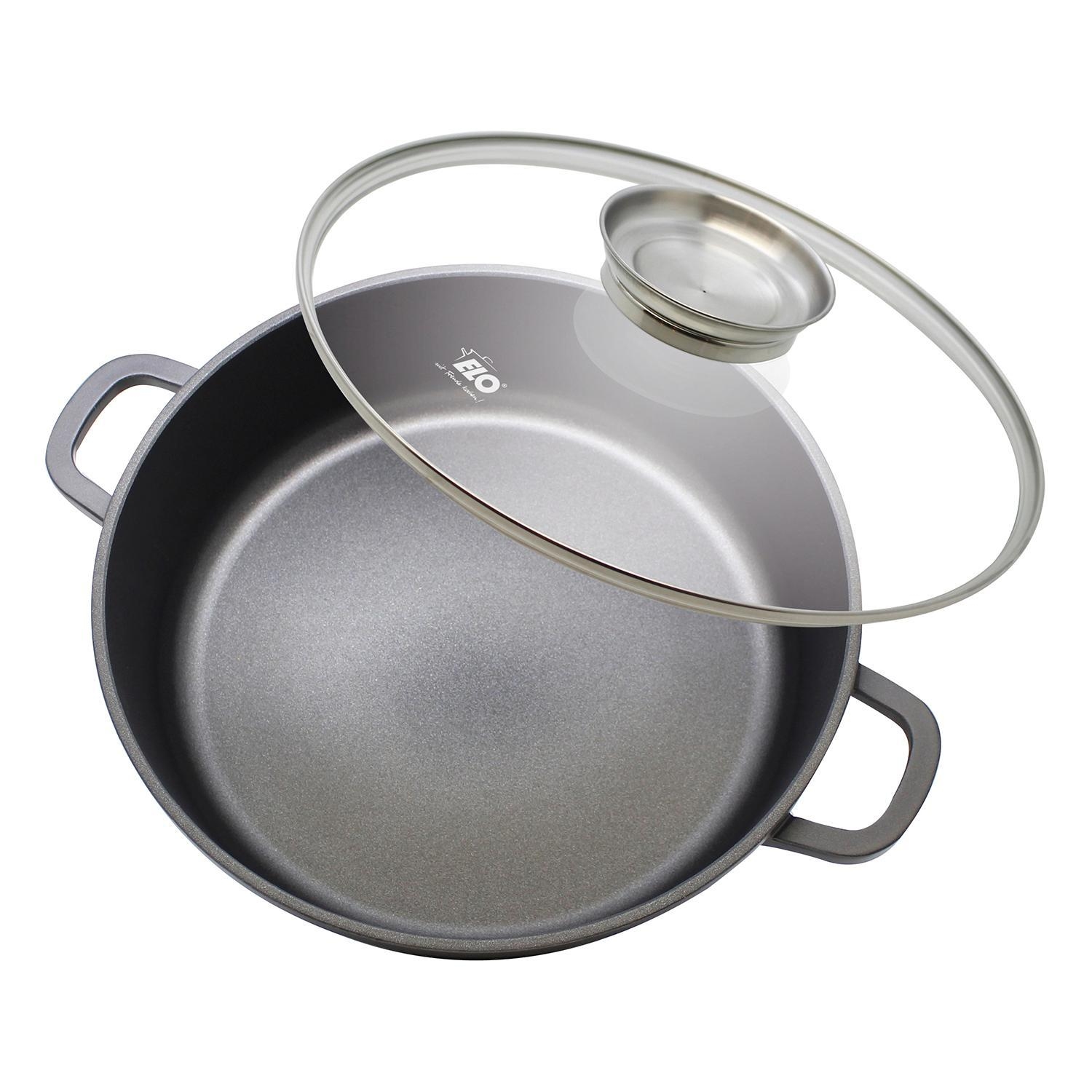 Die schwarze Servierpfanne ALUCAST von Elo mit 32 cm Durchmesser überzeugt durch ihren langlebigen Aluminiumguss und eine Antihaftveredelung. Der passende Glasdeckel ermöglicht präzises Garen, während die Pfanne auf allen Herdarten, auch Induktion, verwendet werden kann.