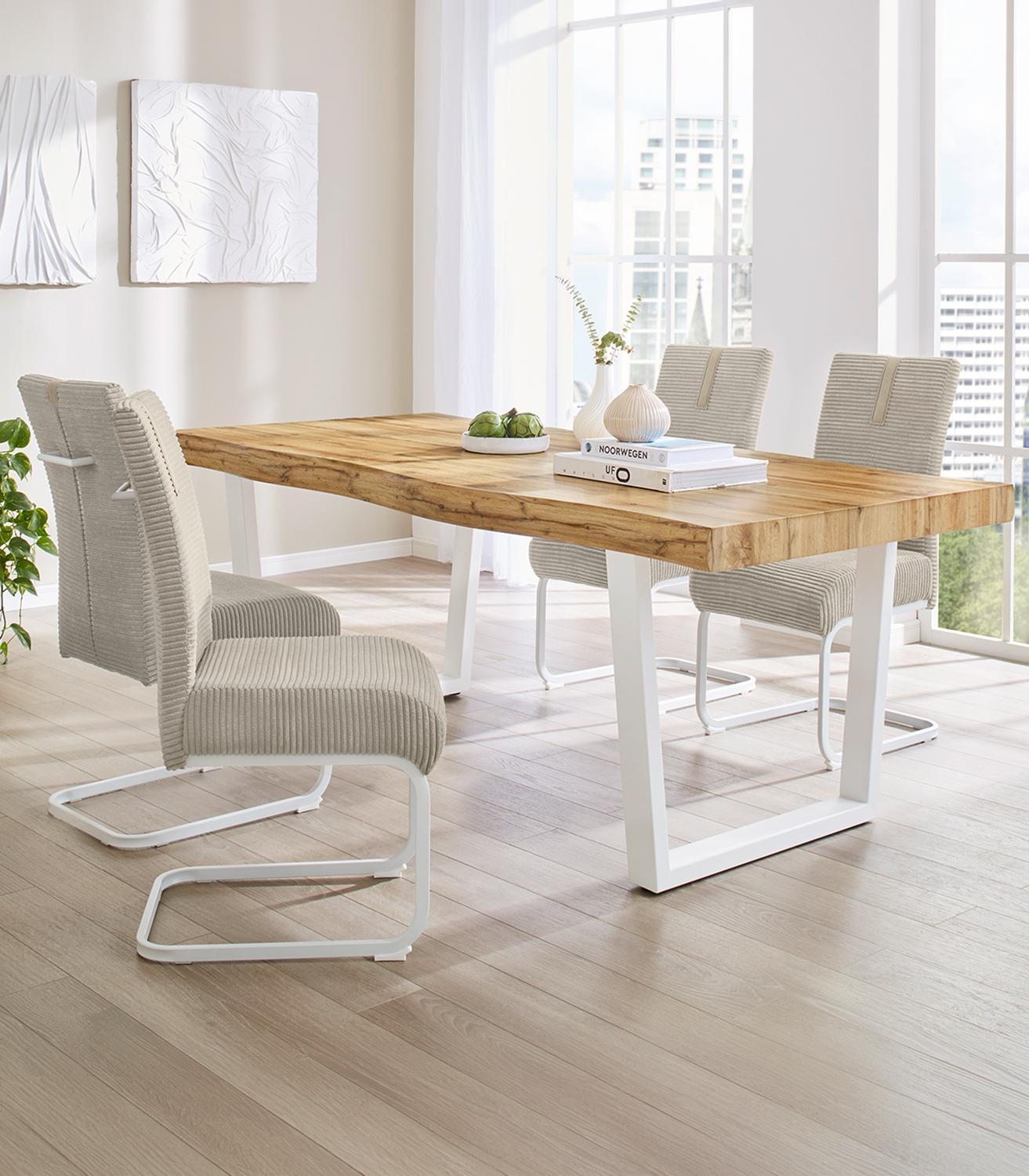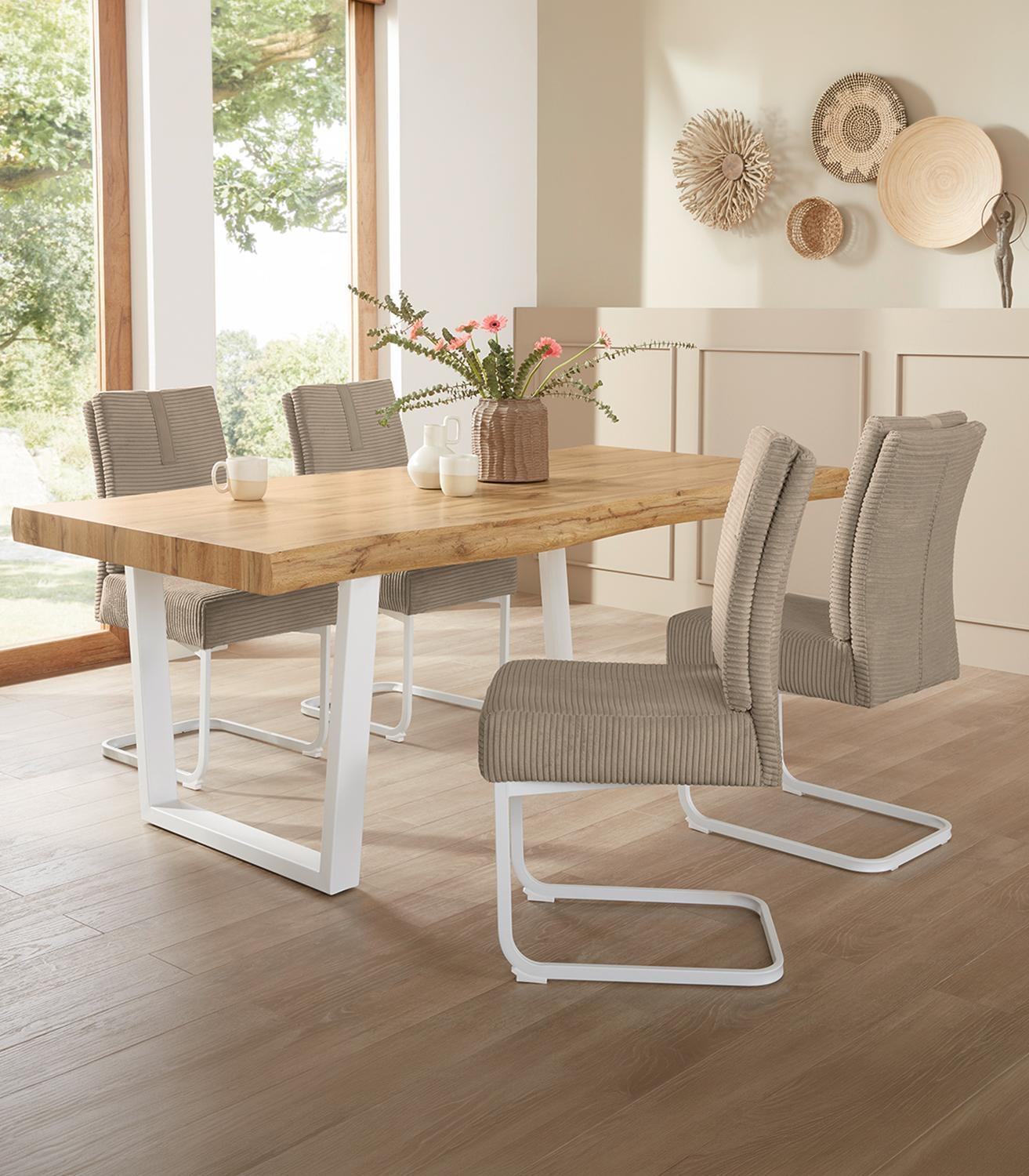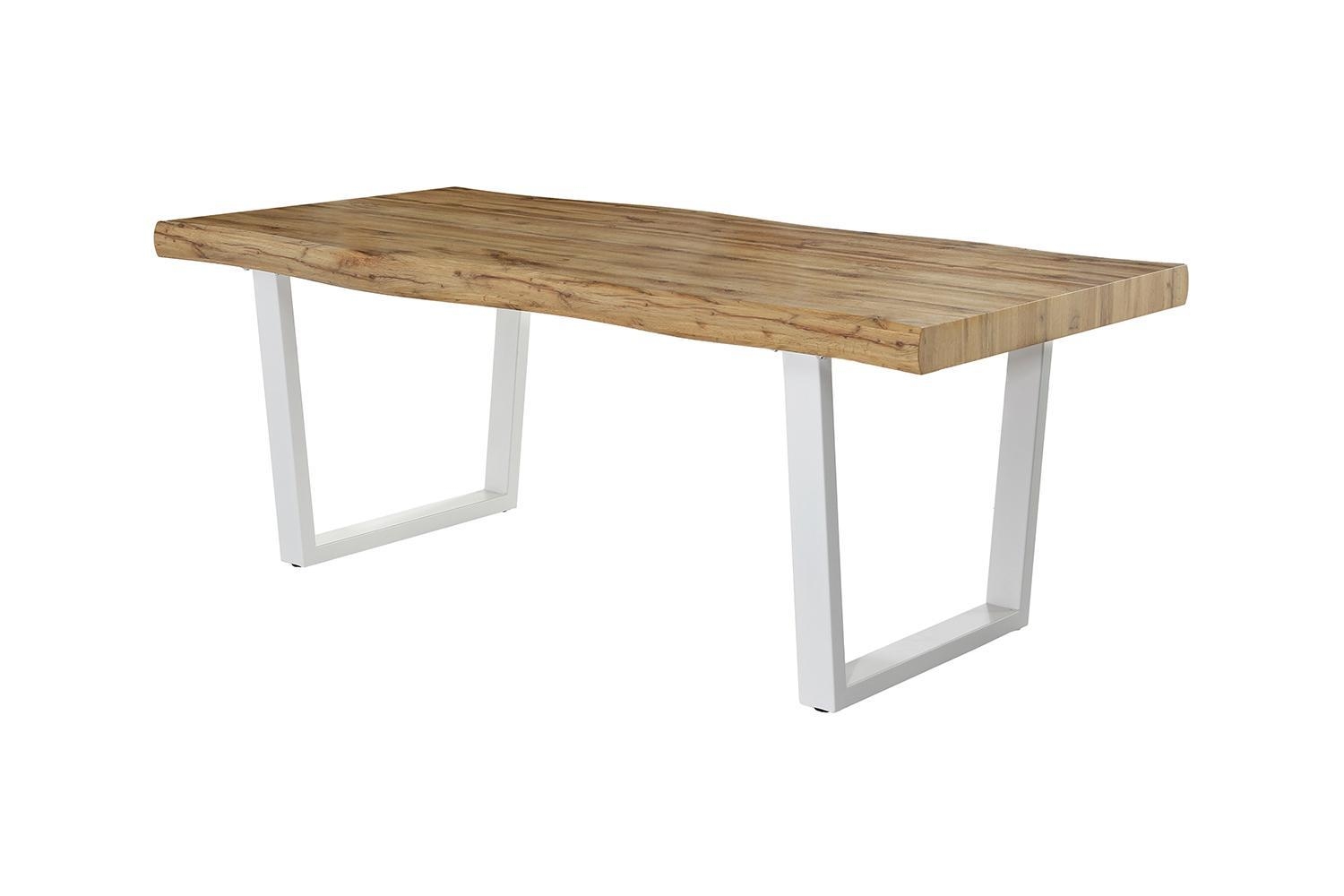Der Esstisch DAVINA verfügt über eine Tischplatte in Wildeiche Dekor und ein Gestell aus Metall in Perlweiß. Die Baumkantenoptik ist beidseitig ausgeführt und unterstreicht die Linienführung des Esszimmertischs. Darüber hinaus ist der Diningtisch mit Höhenausgleichsfüßen versehen. Mit einer Breite von 200 cm, einer Höhe von 76 cm und einer Tiefe von 100 cm bietet der Tisch großzügige Maße für den Essbereich.