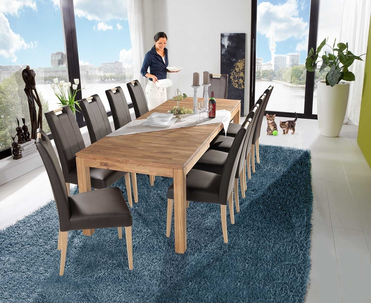 Der Esstisch kann mithilfe von zwei Platten auf eine Gesamtlänge von 240 cm erweitert werden. So finden an Festen und Feiern bis zu zehn Personen einen bequemen Sitzplatz. Der Tisch wird dafür mittig auseinandergezogen und je nach Platzbedarf eine oder beide Platten eingelegt. Die Einlegeplatten können bei Nichtbenutzung einfach unter der Tischplatte verstaut werden. Die Stärke der Tischplatte beträgt 2 cm.
