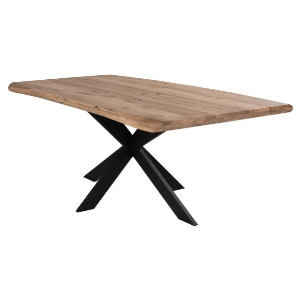 Der Esstisch LENDRO verfügt über eine Tischplatte aus massivem Eichenholz. Die Oberfläche ist geölt, was die natürliche Holzstruktur zur Geltung bringt und pflegeleicht macht. Charakteristisch für das Modell sind die beidseitig gearbeiteten Baumkanten. Das sternförmige Gestell besteht aus schwarzem Metall und verleiht dem Tisch eine stabile Basis. Die Breite des Tisches beträgt 200 cm, die Tiefe 100 cm.