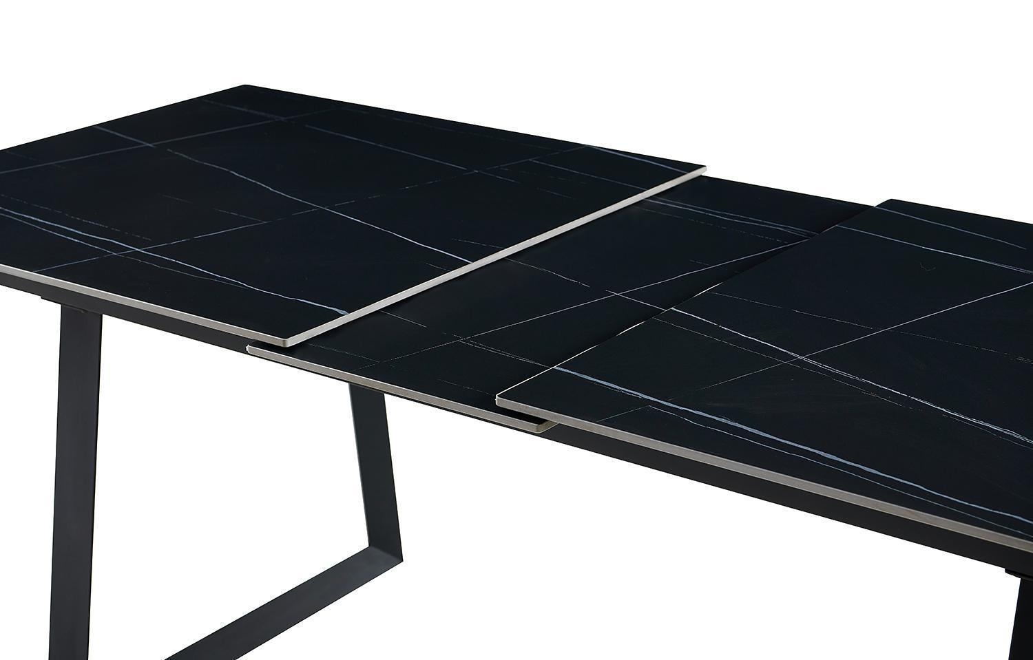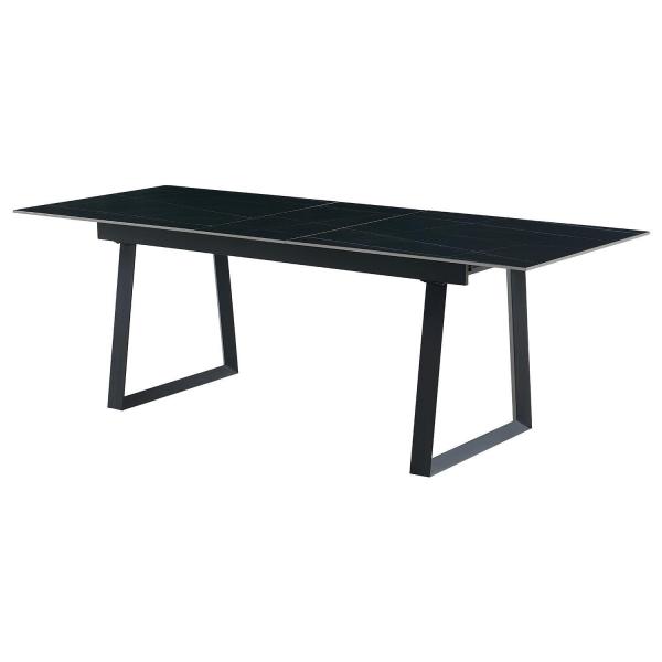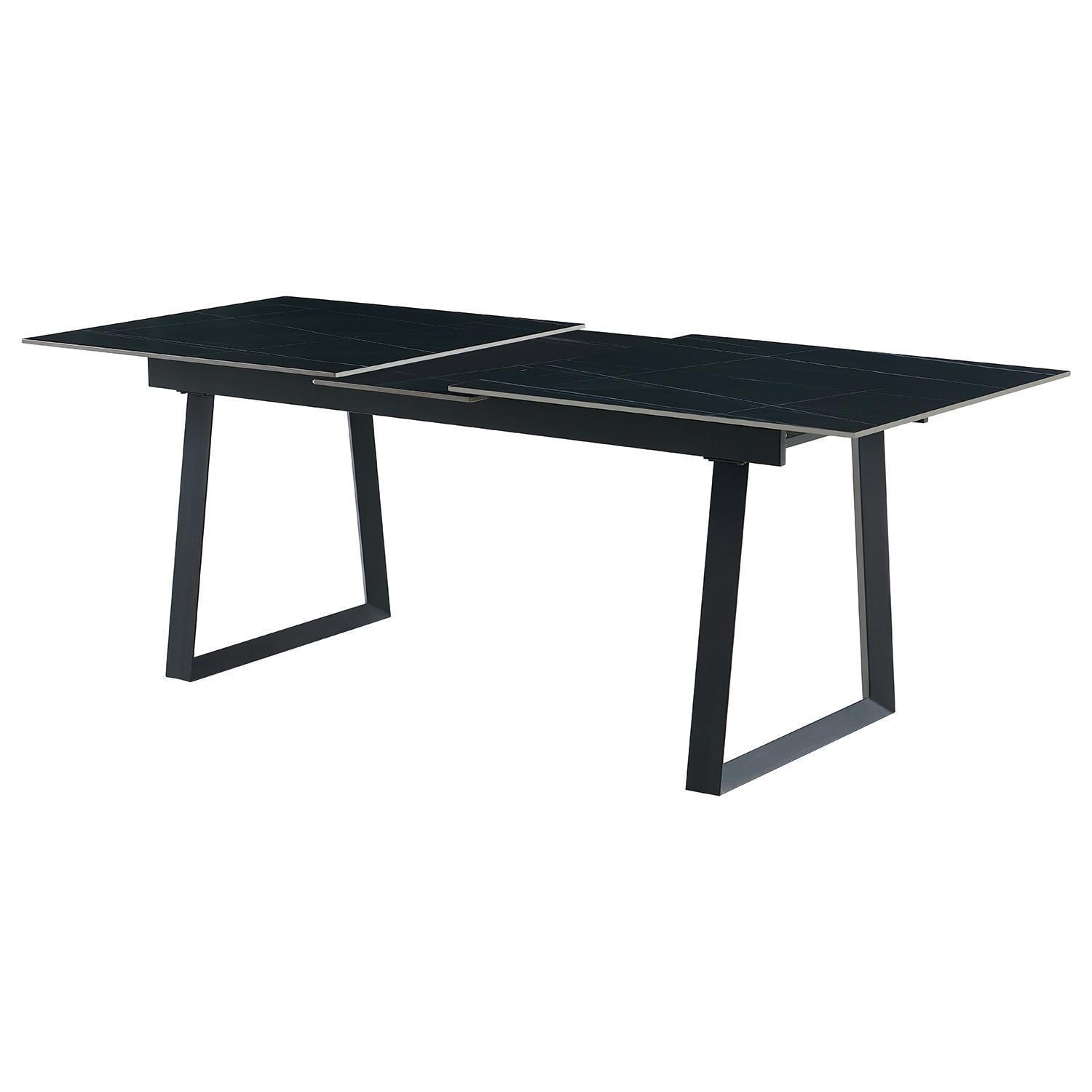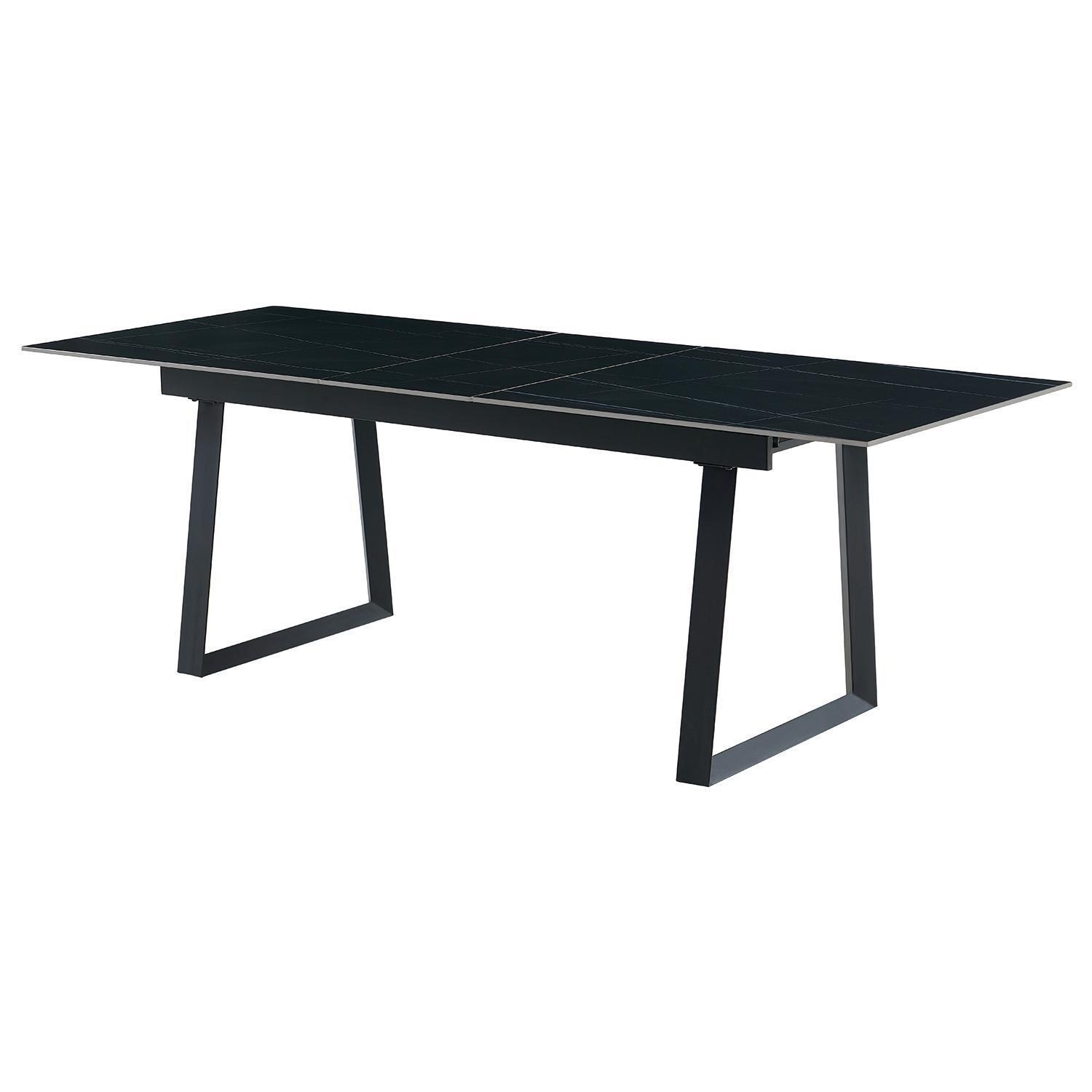 Der Esstisch REBA ist mit einer Tischplatte aus gesintertem Stein in Schwarz ausgestattet und steht auf einem Metallgestell in gleicher Farbgebung. Über den Mittelauszug mit einem Einlegeboden und Liftautomatik lässt sich die Tischbreite von 180 cm auf bis zu 220 cm erweitern. Die Tiefe beträgt 90 cm.