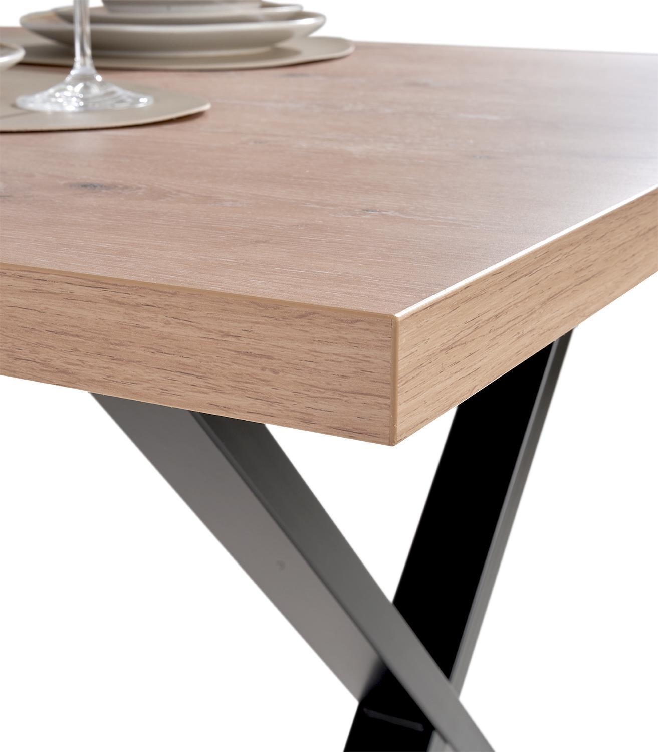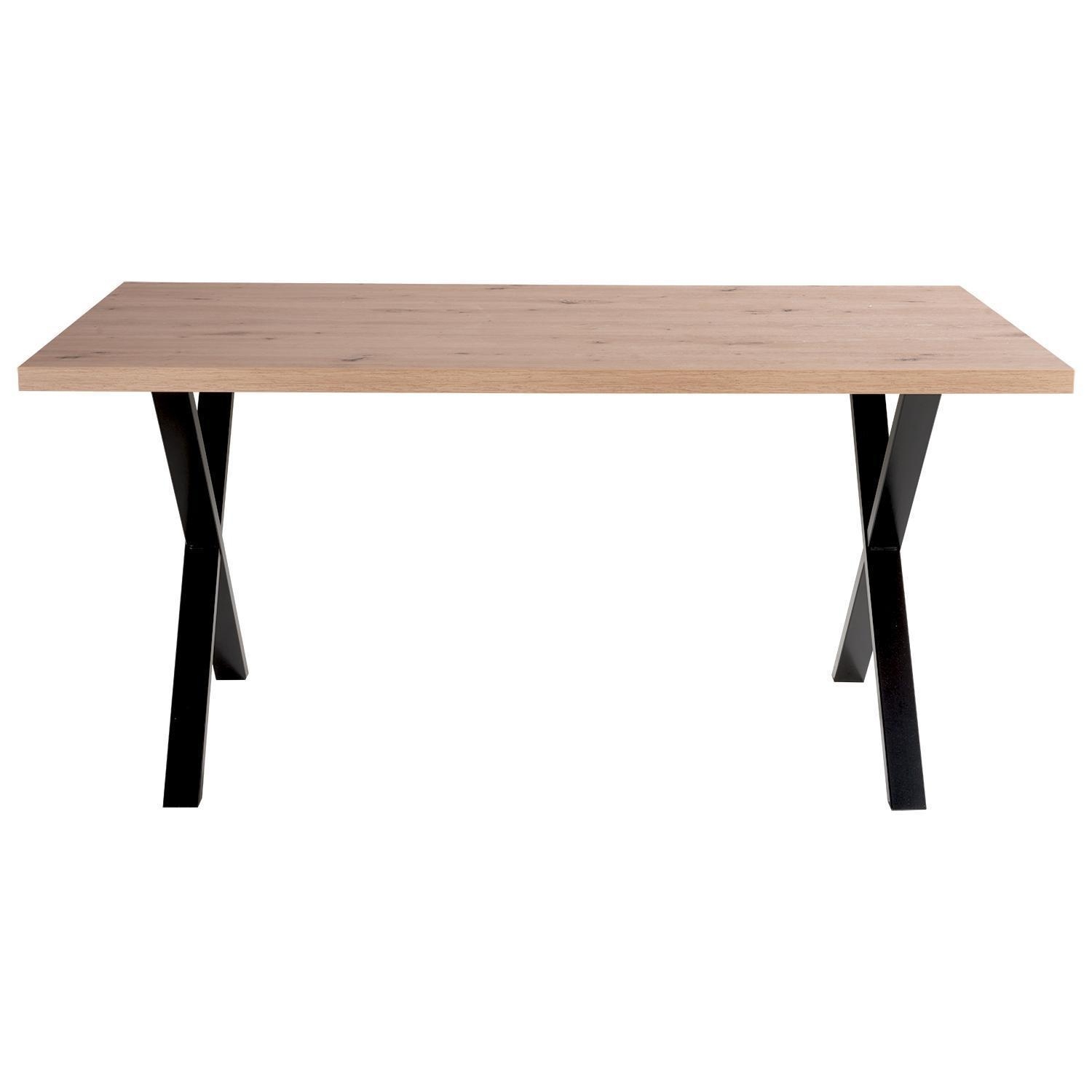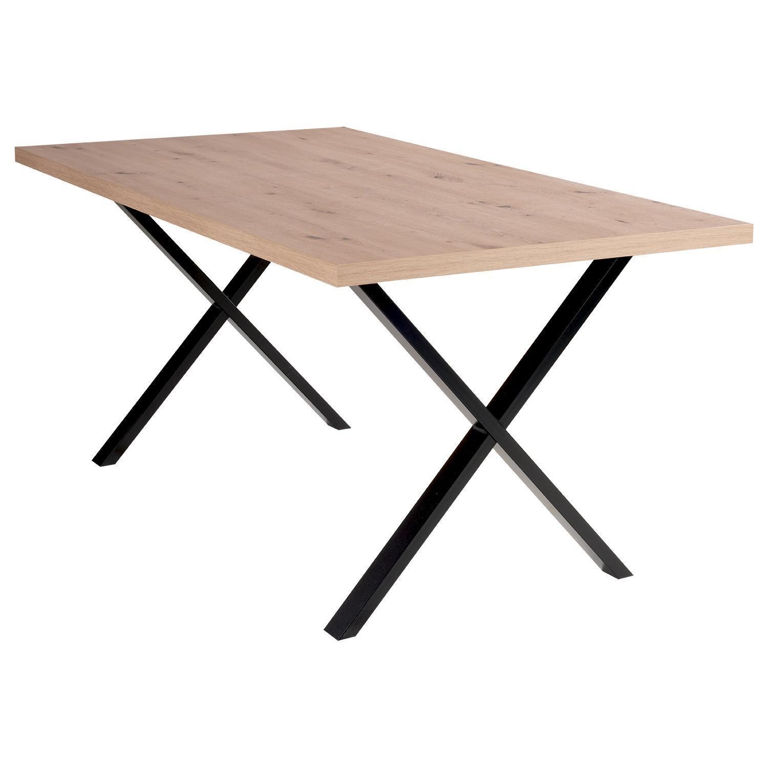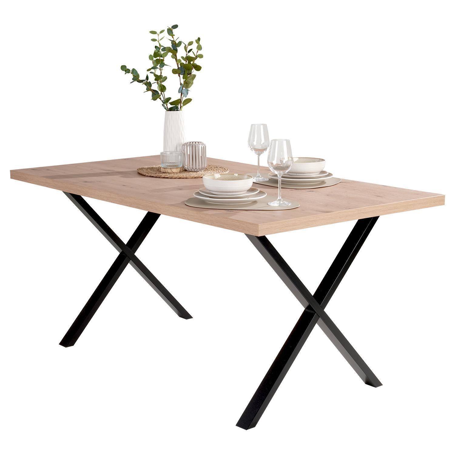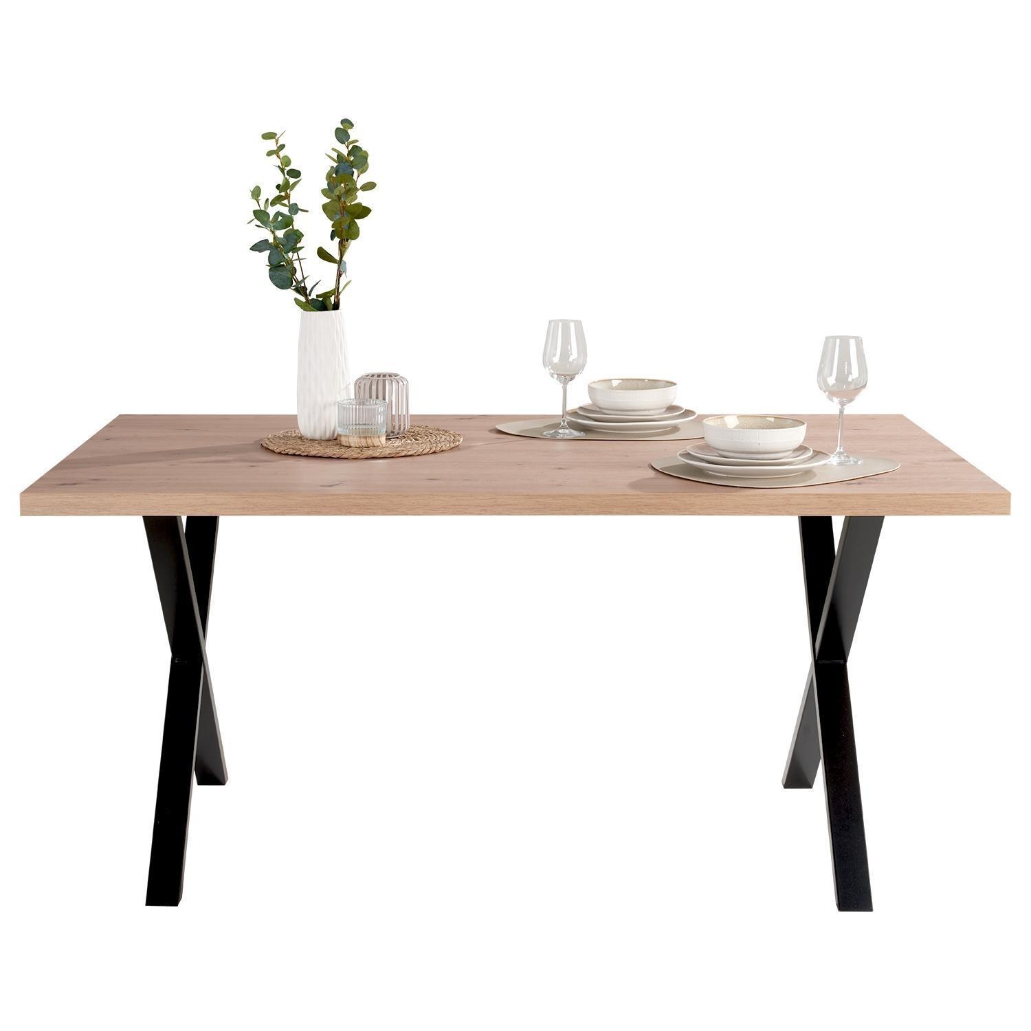 Der Esstisch TAMMI ist mit einer Tischplatte im Artisan Eiche Dekor ausgestattet und wird von einem Gestell aus Metall in Schwarz getragen. Die Platte verfügt über gerade Tischkanten und ist bis zu maximal 60 kg belastbar. Der Tisch misst 160 cm in der Breite, 75,2 cm in der Höhe und 90 cm in der Tiefe.