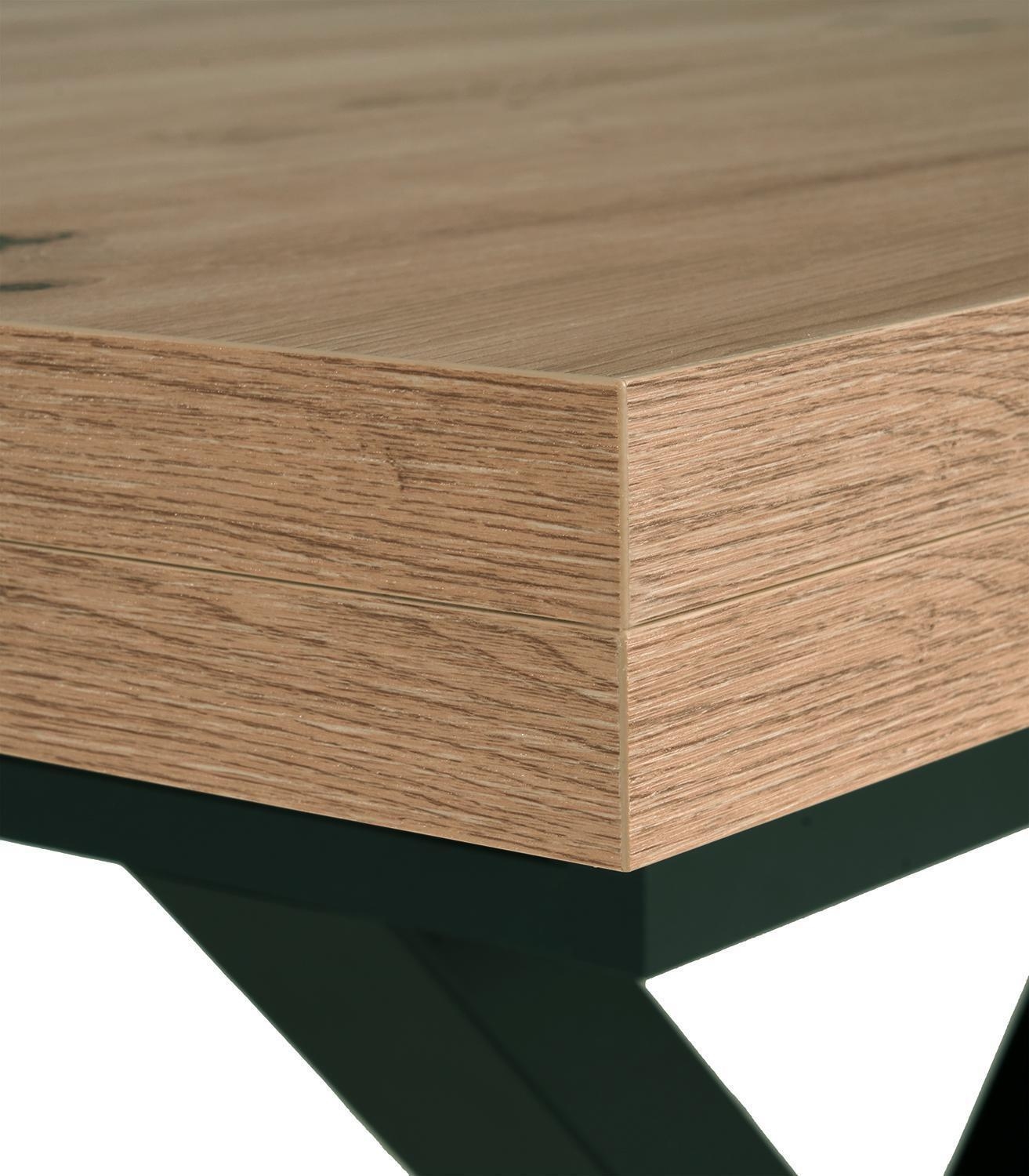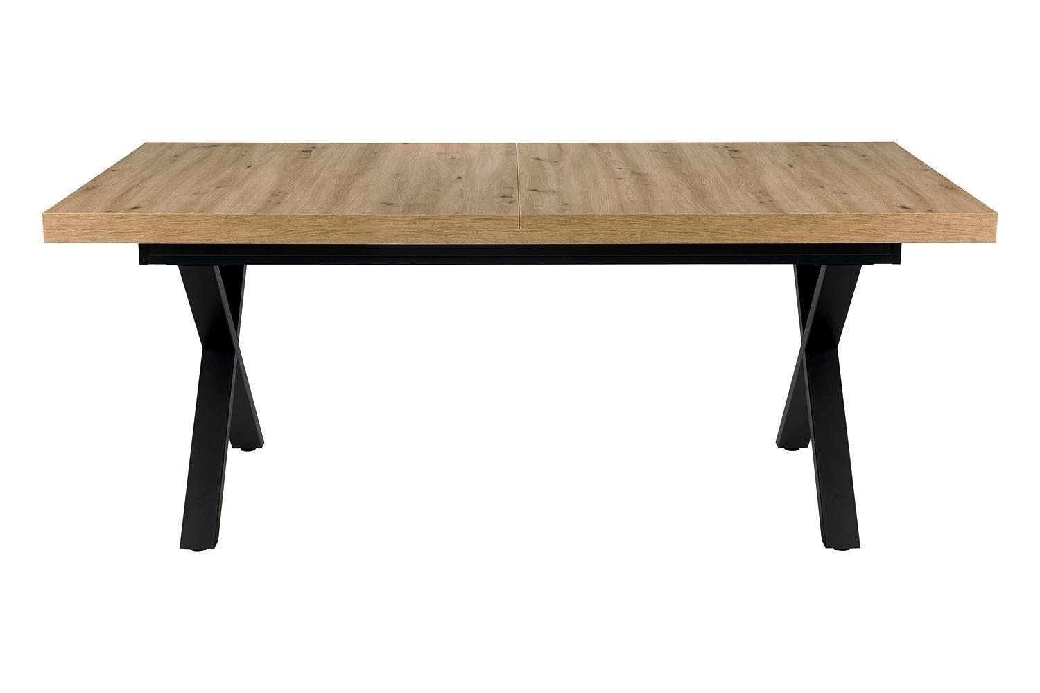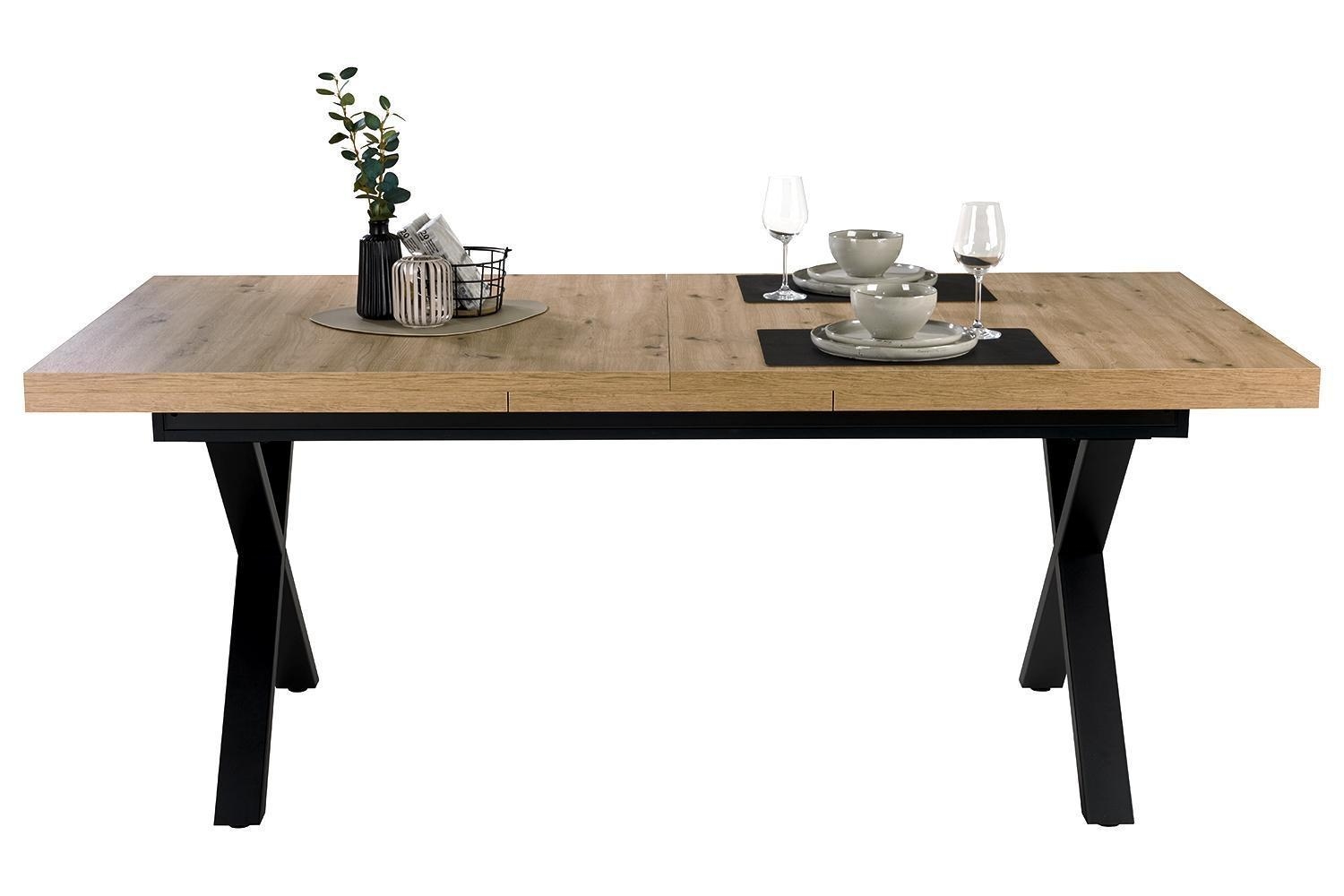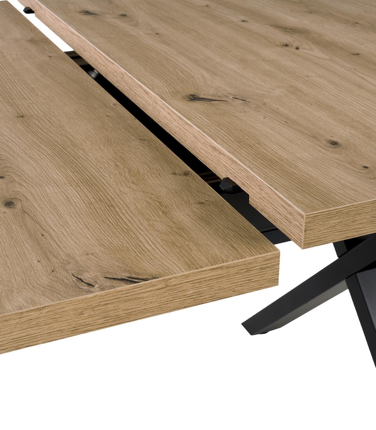 Der Esstisch TUANA verfügt über eine Tischplatte in Asteiche Dekor sowie ein schwarzes Metallgestell. Dieses Esszimmermöbel weist eine Breite von 200 cm, eine Höhe von 79,5 cm und eine Tiefe von 100 cm auf. Mithilfe eines Mittelauszugs mit Lift-Funktion lässt sich dieser Küchentisch im ausgezogenen Zustand auf eine Gesamtlänge von 250 cm erweitern.