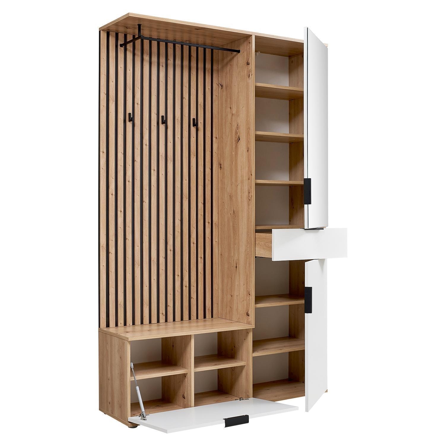 Die dreiteilige Garderobenkombination MALTE ist in Artisan Eiche Dekor gefertigt und mit Fronten in Weiß matt versehen. Das Set besteht aus einem Garderobenpaneel, einem Garderobenschrank und einer Garderobenbank. Das Paneel ist mit einer Kleiderstange und drei Haken ausgestattet. Der Schrank verfügt über eine Schublade, zwei Türen sowie fünf Einlegeböden. Die Bank ist mit einer Klappe und zwei Einlegeböden versehen. Die Garderobenkombination hat eine Breite von 122 cm, eine Höhe von 195 cm und eine Tiefe von 35 cm.