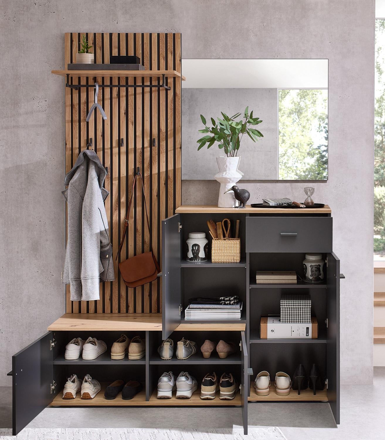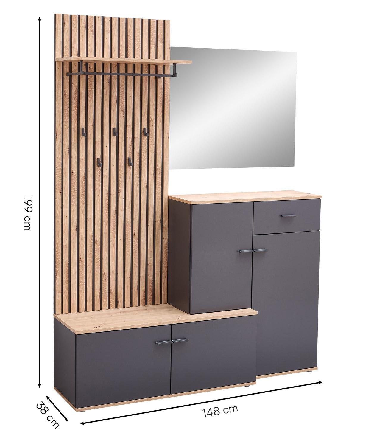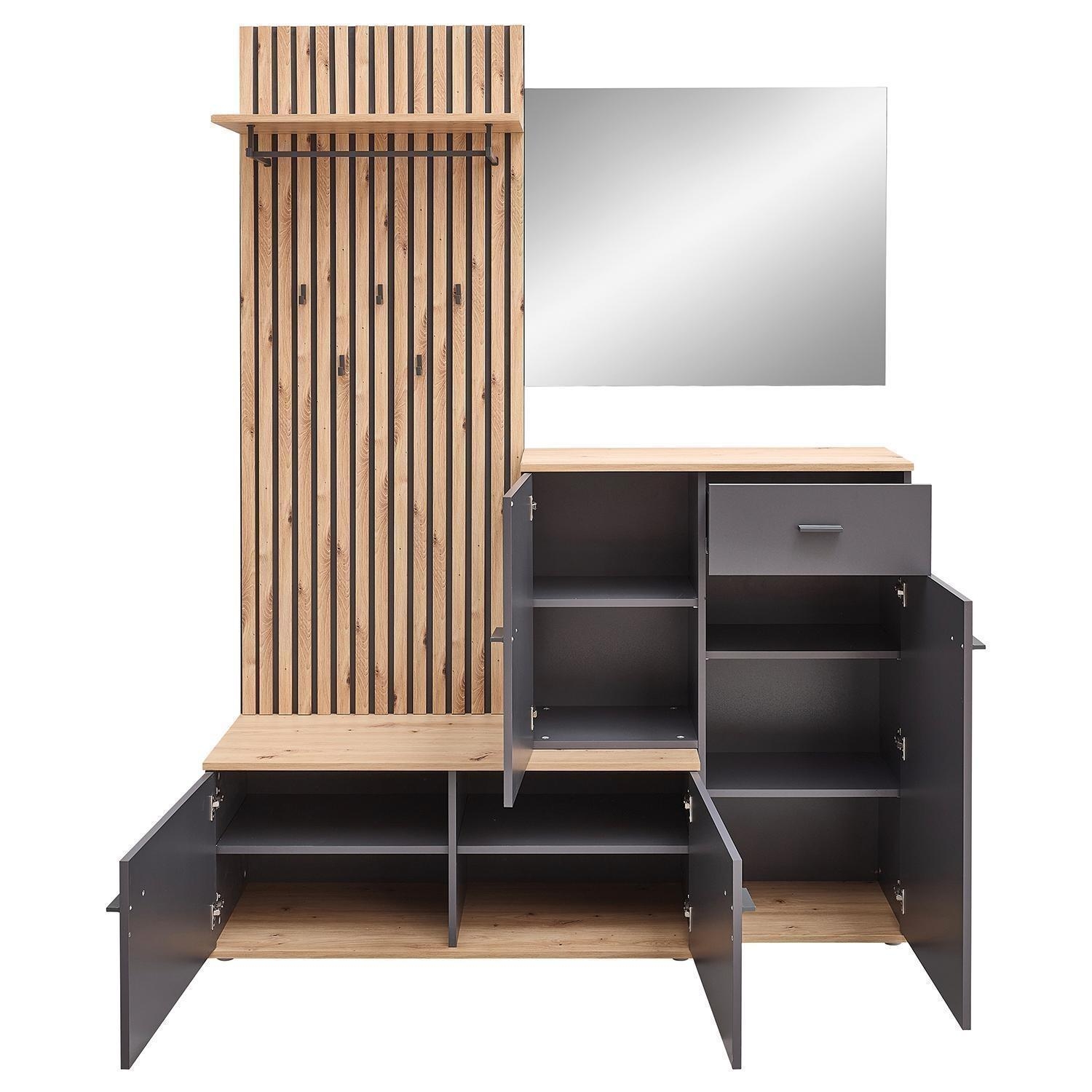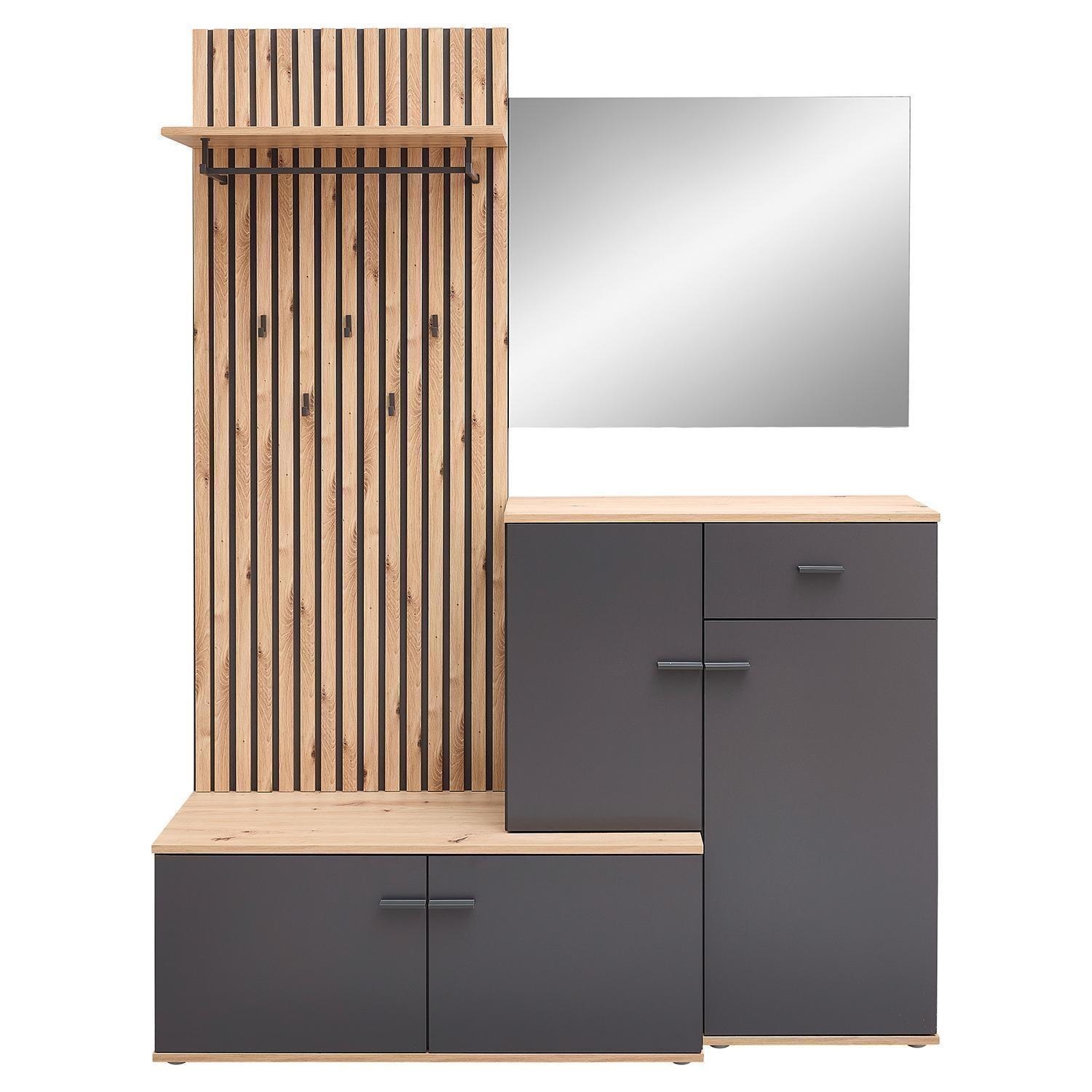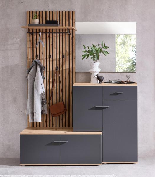 Die Garderobenkombination FENYA ist in Anthrazit matt gehalten und mit Absetzungen in Artisan Eiche Dekor versehen. Sie besteht aus einem Garderobenpaneel, einer Schuhkommode, einer Garderobenbank und einem Garderobenspiegel.