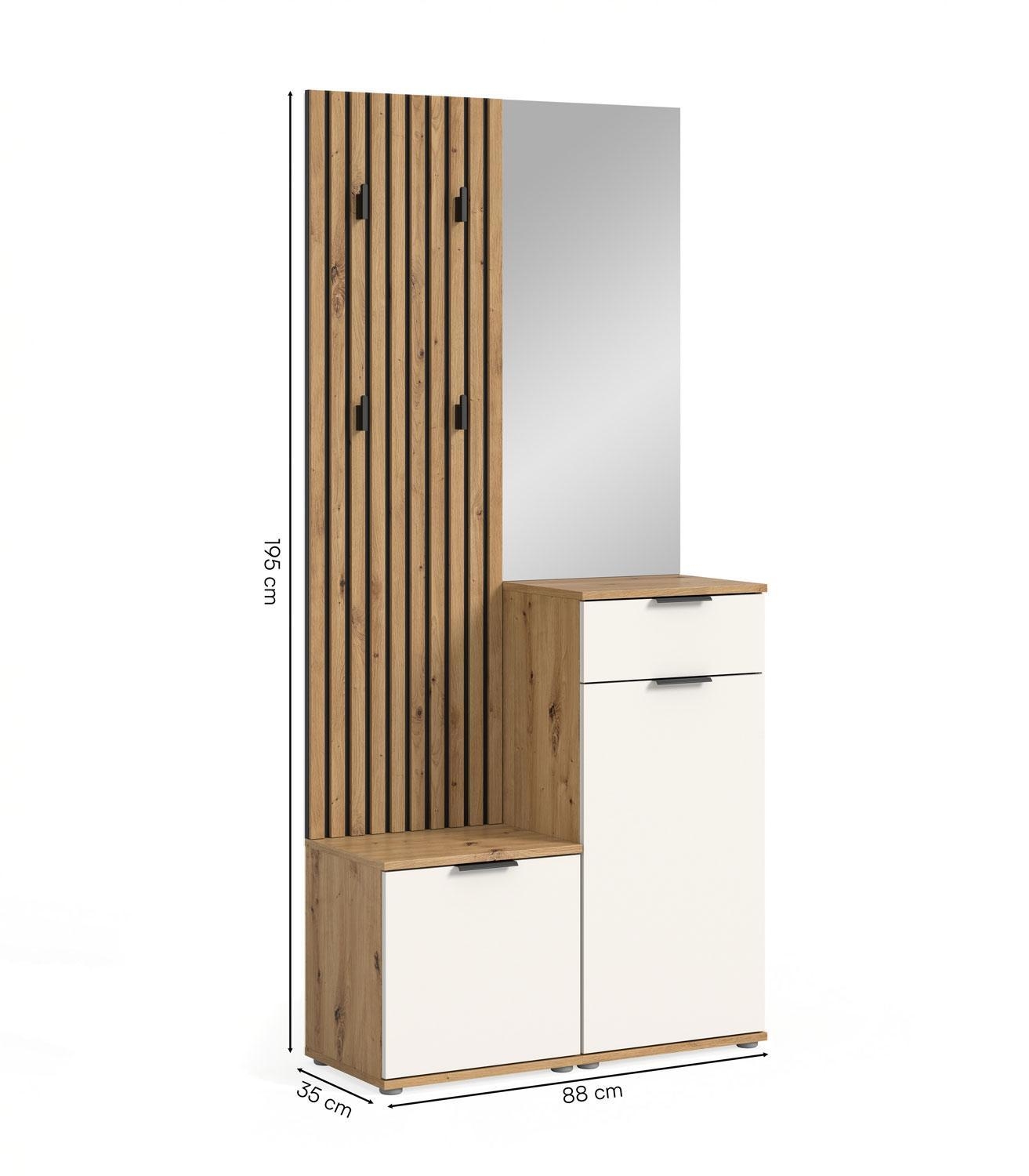 Die Garderobenkombination SANDOR besteht aus Elementen in Artisan Eiche Dekor mit Fronten in Weiß matt. Sie setzt sich aus einem Spiegel, einem Garderobenpaneel mit vier Haken, einer Schuhkommode und einer Garderobenbank zusammen. Die Schuhkommode verfügt über eine Schublade, eine Tür und zwei Einlegeböden. Die Garderobenbank ist mit einer Tür und einem Einlegeboden ausgestattet. Die Maße betragen 88 cm in der Breite, 195 cm in der Höhe und 35 cm in der Tiefe.