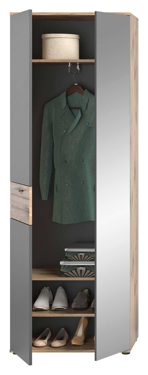 | Lieferumfang: | 1 Garderobenschrank mit 1 Tür, 1 Spiegeltür, 1 ausziehbaren Kleiderstange und 8 Einlegeböden |