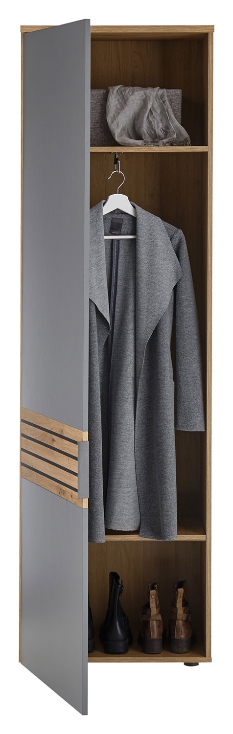 Lieferumfang: 1 Garderobenschrank mit 1 Tür, 1 ausziehbaren Kleiderstange und 2 Einlegeböden. Der Türanschlag kann nur auf der linken Seite montiert werden