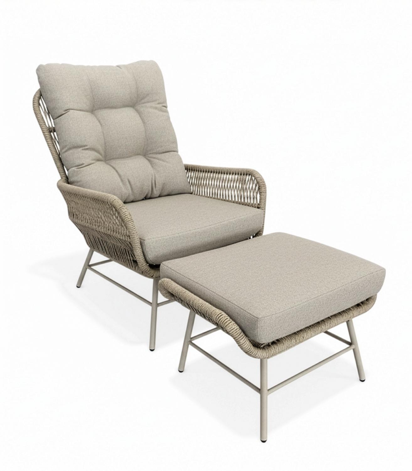 Das 2-teilige Gartenmöbel-Set LEVANTE besteht aus einem Gartensessel und einem Gartenhocker, die jeweils über ein Gestell aus Aluminium verfügen. Die Sitz- und Rückenbespannung dieser Outdoor-Möbel ist aus beigefarbenen Seilen gefertigt. Zum Lieferumfang gehören champagnerfarbene Sitzkissen, deren Bezüge abnehmbar und waschbar sind. Durch die Kombination von Aluminiumgestell und Seilbespannung ist dieses Set für die Verwendung im Außenbereich vorgesehen. Die beige- und champagnerfarbene Gestaltung kennzeichnet die optische Erscheinung dieses Garten-Arrangements.