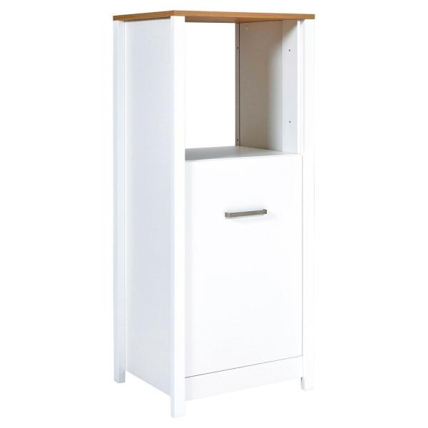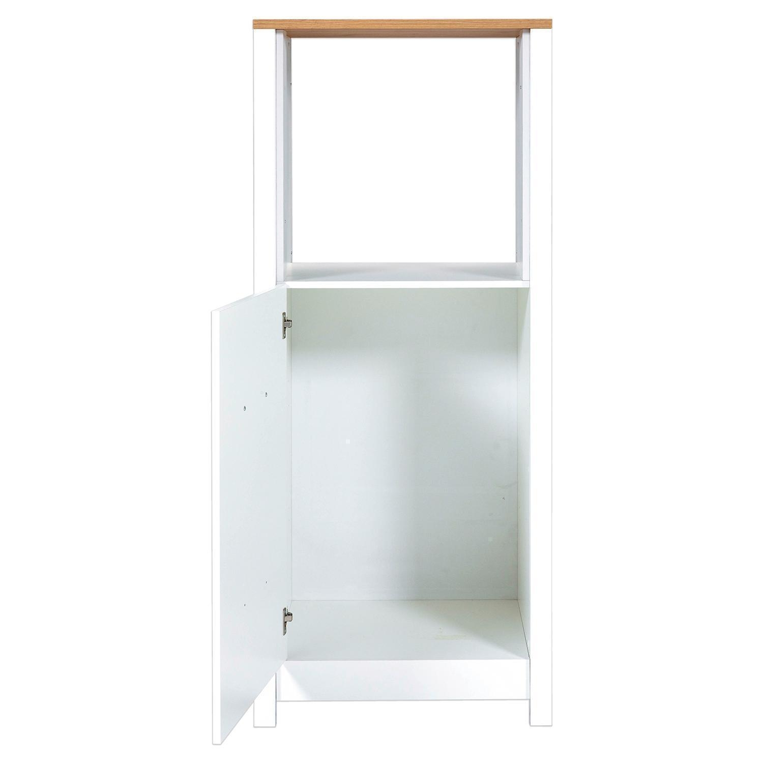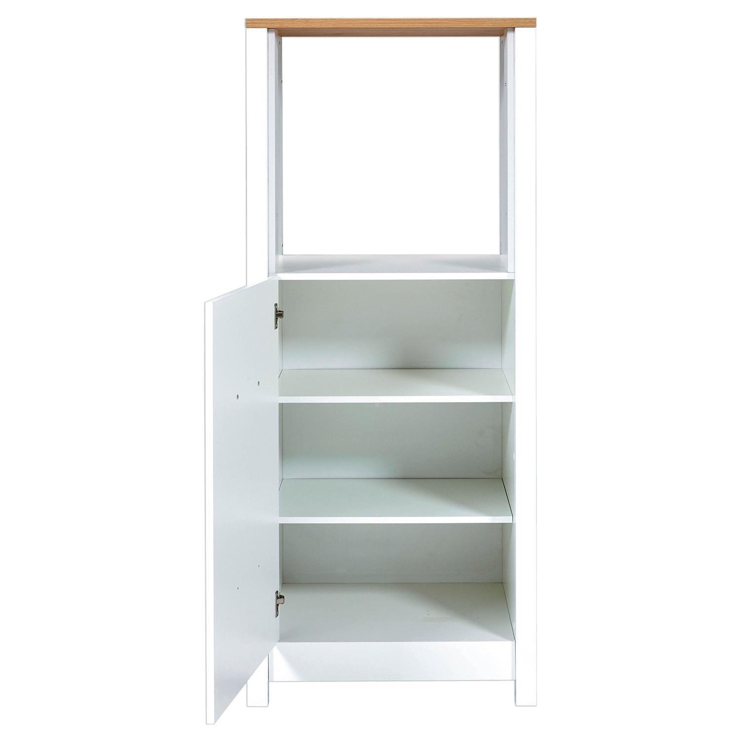 Der Geräteschrank SILVANO ist in Weiß gehalten und mit einer Oberplatte in Artisan Eiche Dekor ausgestattet. Er verfügt über eine Tür mit Soft-Close-Funktion sowie zwei dreifach höhenverstellbare Einlegeböden. Ein offenes Fach bietet Platz für Einbaugeräte. Der Griff besteht aus pulverbeschichtetem Aluminium. Höhenverstellbare Füße ermöglichen eine individuelle Anpassung. Die Abmessungen betragen 70 cm in der Breite, 167 cm in der Höhe und 60 cm in der Tiefe.