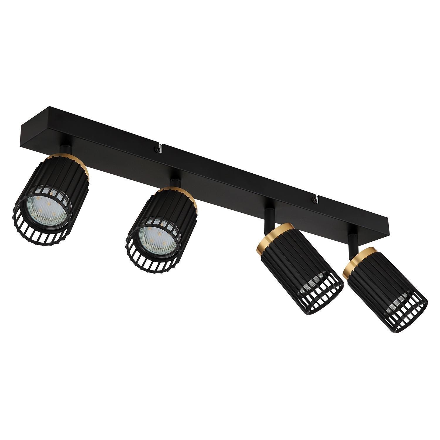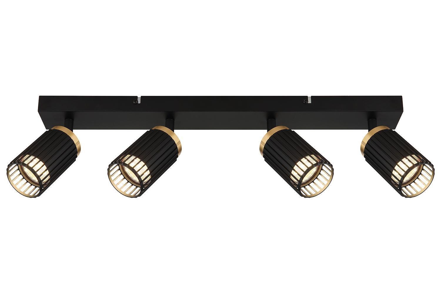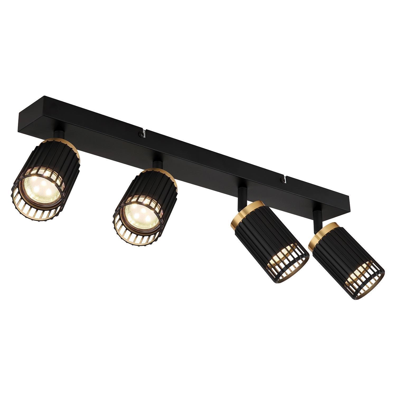 Der Strahler KORBEN der Marke Globo Lighting besteht aus Aluminium in Schwarz mit goldgelben Absetzungen. Die Breite beträgt 53 cm, die Höhe 15,5 cm und die Tiefe 12,5 cm. Der Strahler ist für vier Leuchtmittel der Fassung GU10 geeignet, die im Lieferumfang nicht enthalten sind. Die Leuchtmittel sind austauschbar und benötigen eine Gesamtleistung von je maximal 5 Watt.