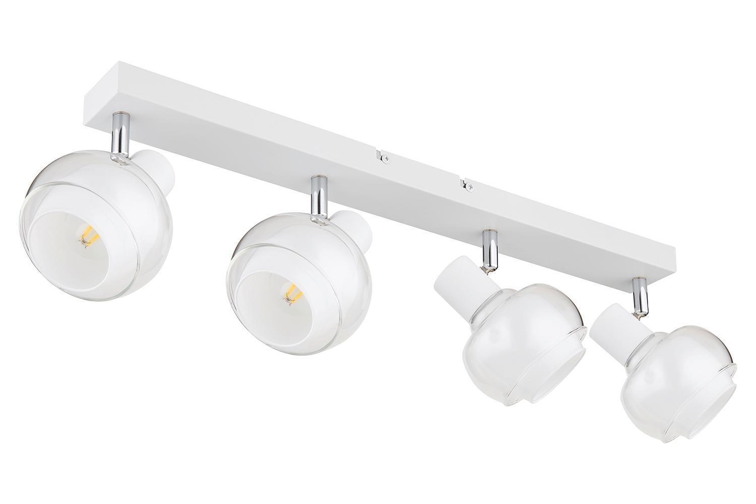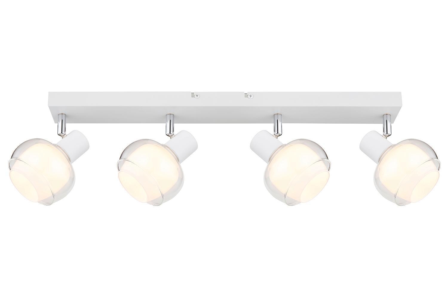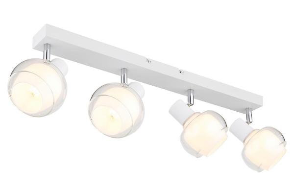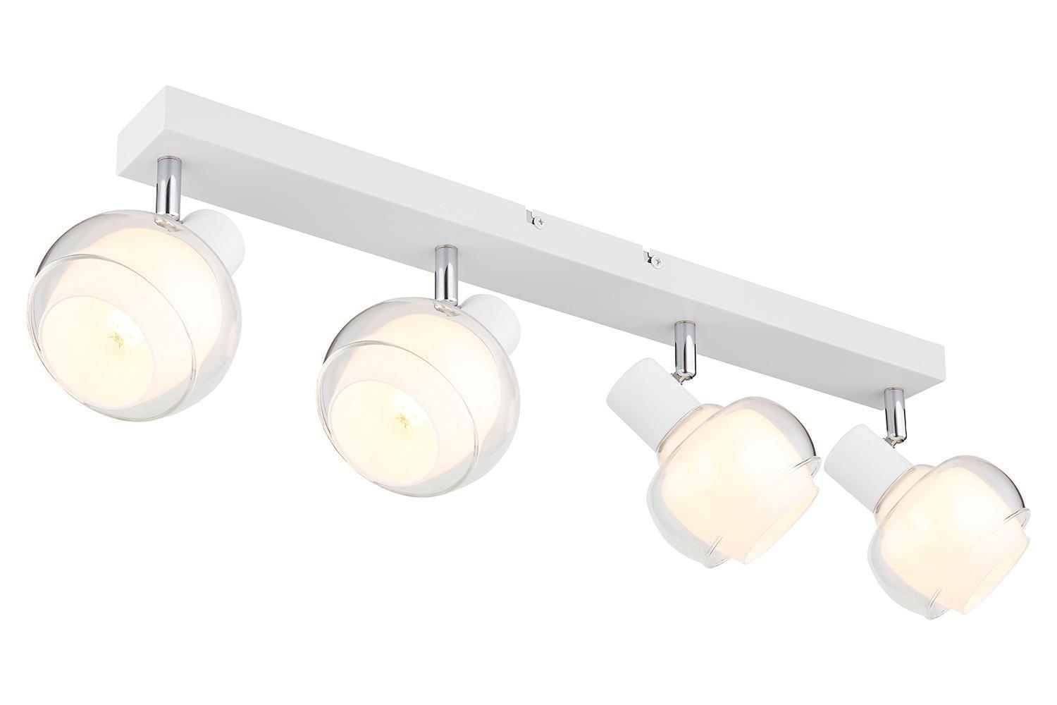 Der Strahler TOKKI der Marke Globo Lighting verfügt über eine Deckenhalterung aus weißem Metall sowie transparente Lampenschirme aus Glas. Chromfarbene Absetzungen ergänzen das Design. Die Maße betragen 56 cm in der Breite, 13,5 cm in der Höhe und 10,5 cm in der Tiefe. Der Strahler ist für vier E14-Leuchtmittel geeignet, die nicht im Lieferumfang enthalten sind. Die Leuchtmittel sind austauschbar und können eine maximale Leistung von bis zu 40 Watt pro Leuchtmittel haben.