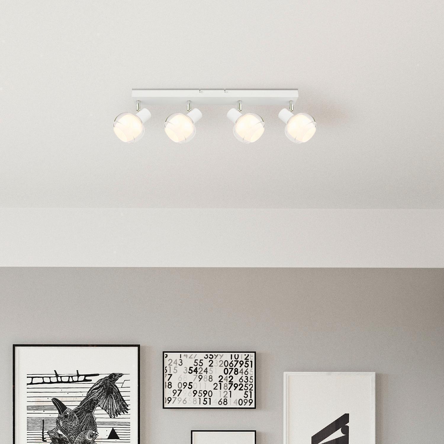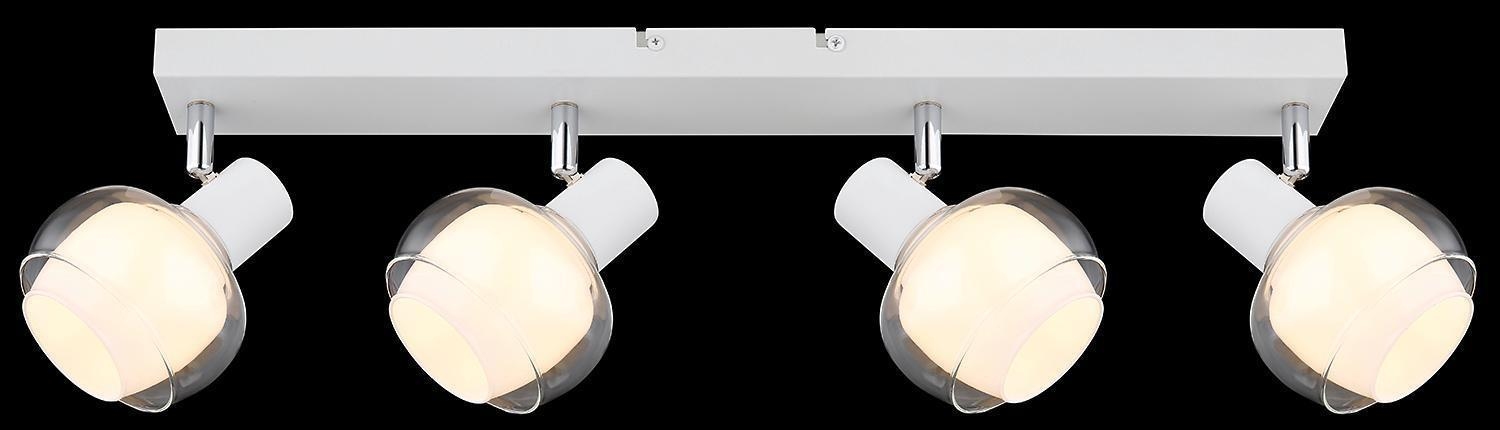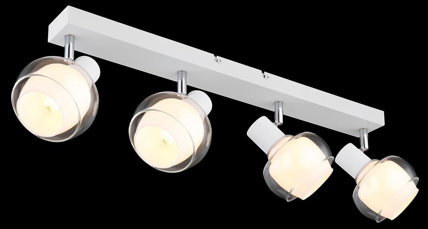 Der Strahler TOKKI der Marke Globo Lighting verfügt über eine Deckenhalterung aus weißem Metall sowie transparente Lampenschirme aus Glas. Chromfarbene Absetzungen ergänzen das Design. Die Maße betragen 56 cm in der Breite, 13,5 cm in der Höhe und 10,5 cm in der Tiefe. Der Strahler ist für vier E14-Leuchtmittel geeignet, die nicht im Lieferumfang enthalten sind. Die Leuchtmittel sind austauschbar und können eine maximale Leistung von bis zu 40 Watt pro Leuchtmittel haben.
