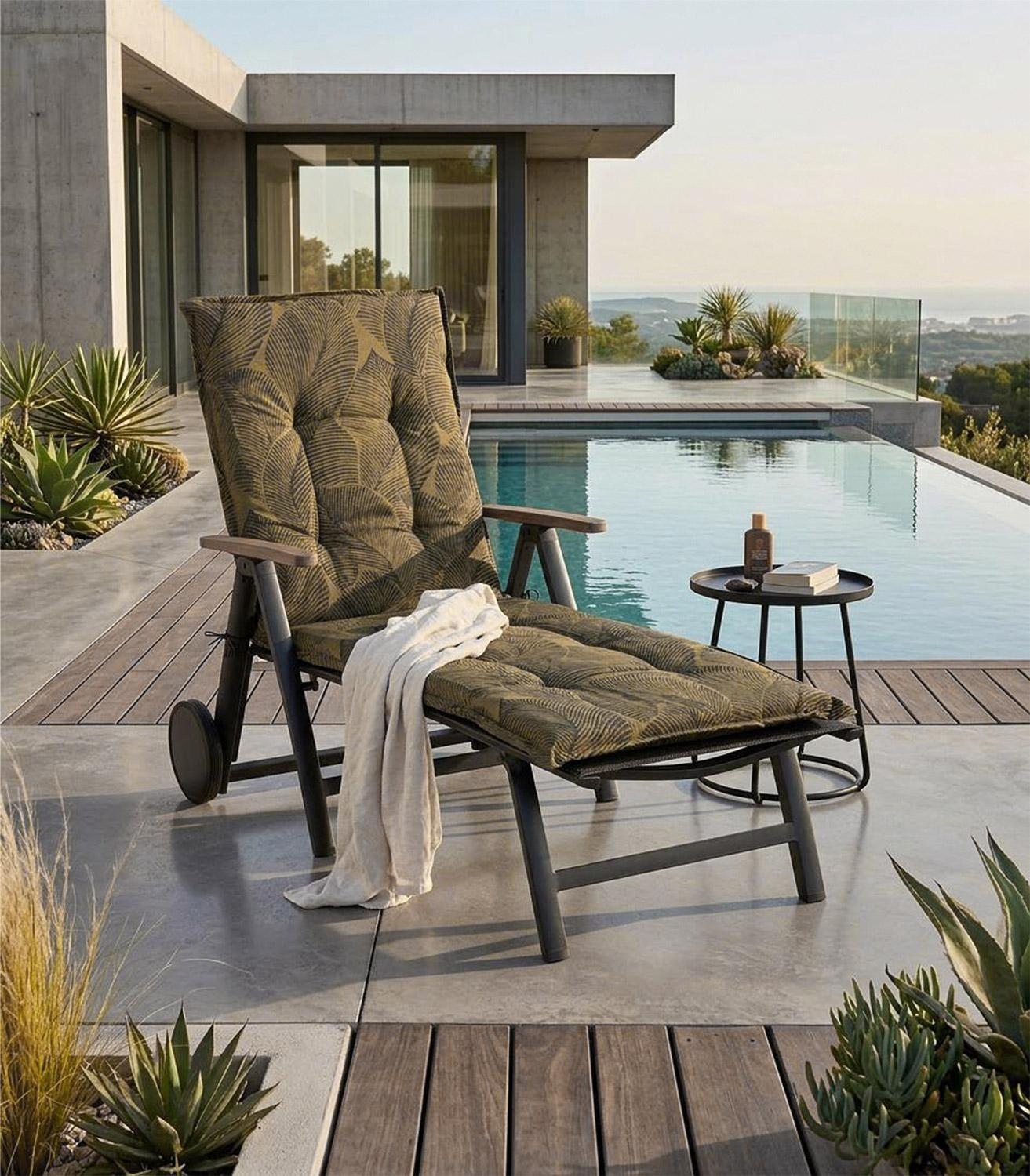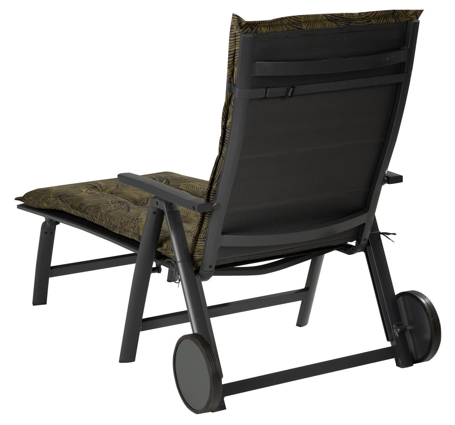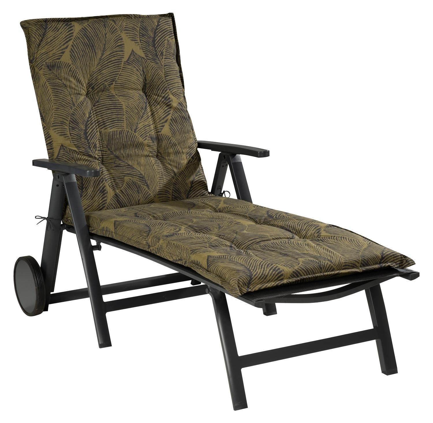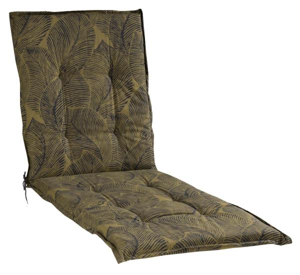 Die dunkelgrüne Liegenauflage FARANI von der Marke GO-de ist 190 cm lang und 60 cm breit. Mit Blättermotiven in Schwarz verleiht sie Ihrem Garten eine natürliche Note. Die Kreissteppungen im Lehnenrücken und die seitlichen Bindekordeln mit verstellbarem Gurtband gewährleisten eine sichere Befestigung.