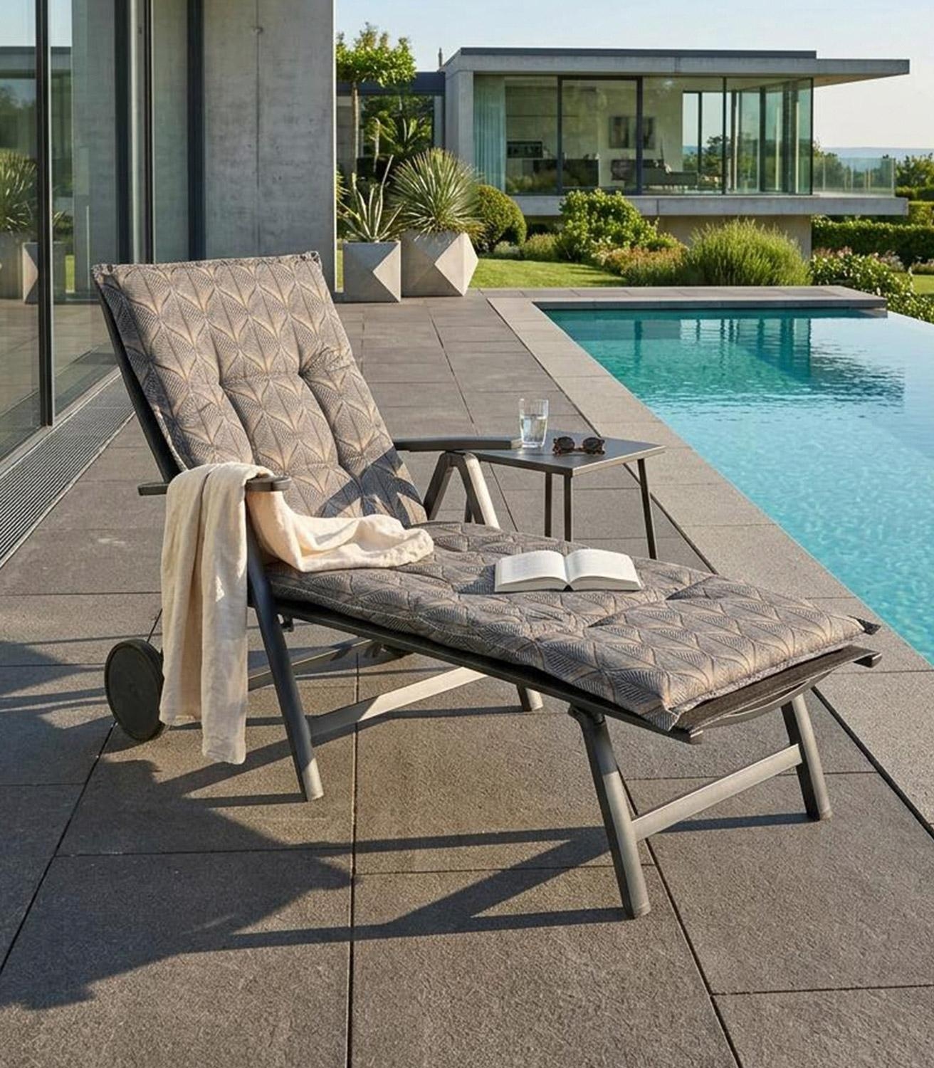 Die Liegenauflage SALTA der Marke GO-DE ist in Grau gehalten und mit tollen Musterungen verziert. Sie ist geeignet für Sonnen- und Gartenliegen und ausgestattet mit einem verstellbaren Gurtband sowie seitlichen Bindekordeln. Die Maße betragen 190 cm in der Länge, 60 cm in der Breite und 7 cm in der Höhe. Die Materialzusammensetzung besteht aus 25 % Baumwolle und 75 % Polyester. Die Polsterauflage wird in Deutschland hergestellt.