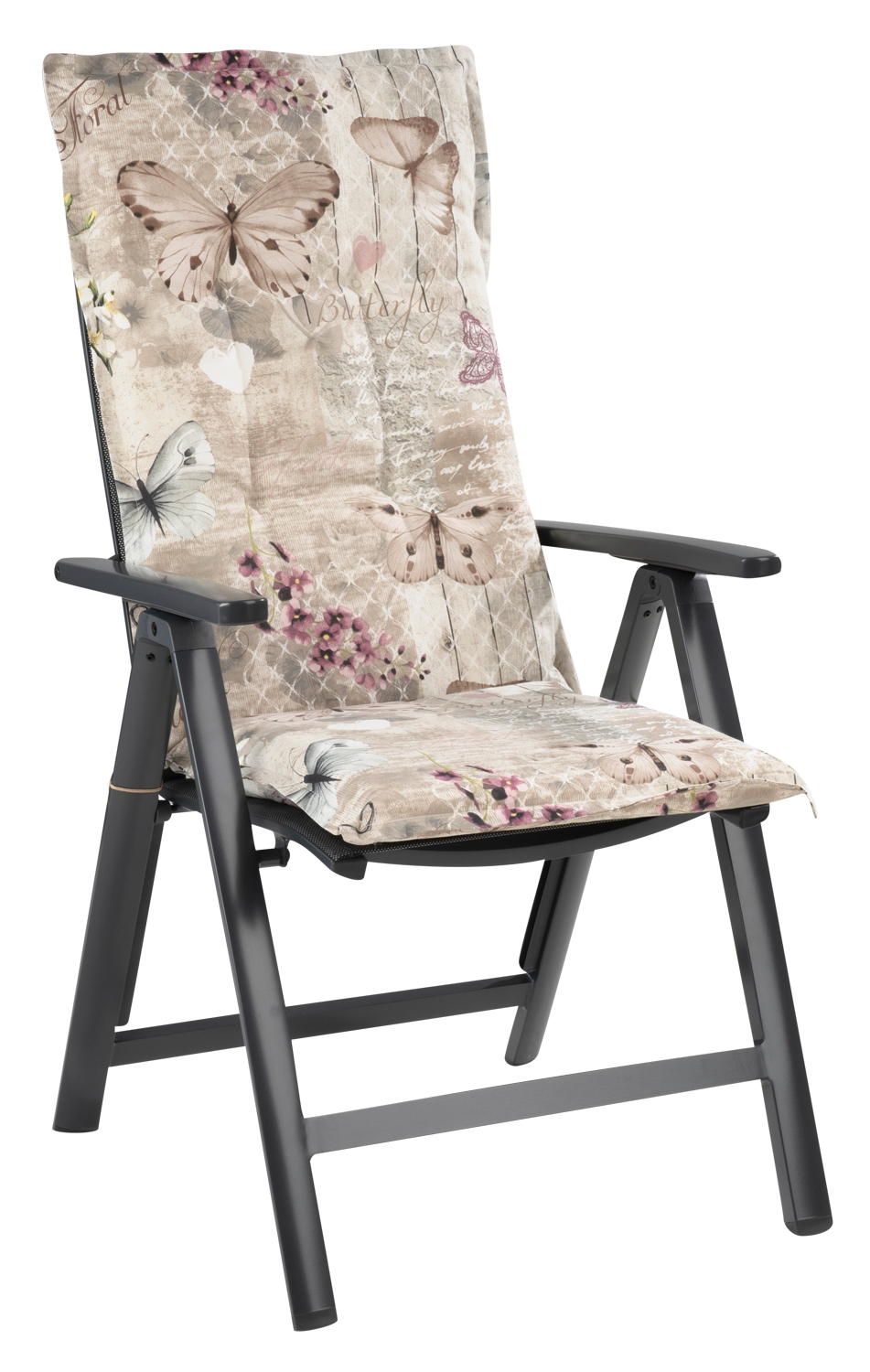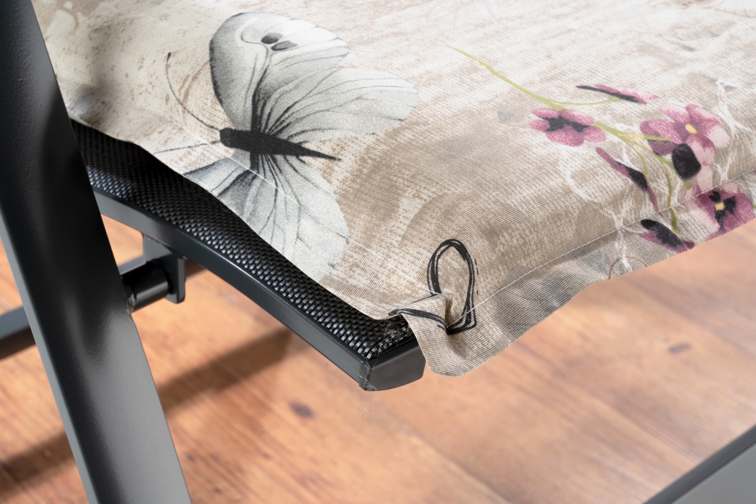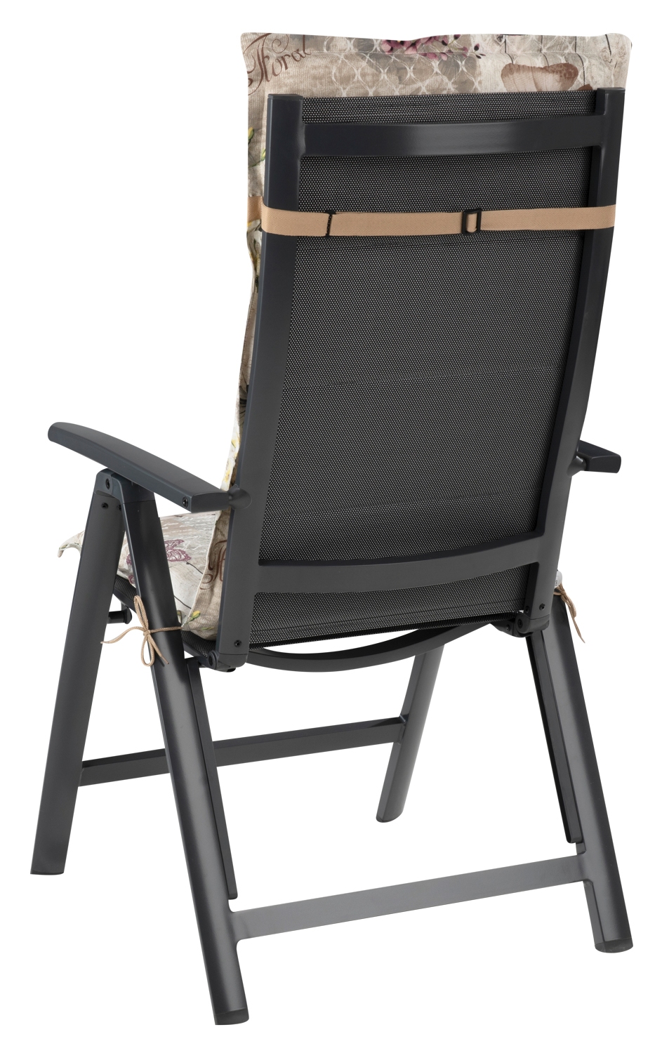 | Lieferumfang: | 1 Gartenstuhlauflage für Hochlehnstühle mit verstellbarem Gurtband und seitlichen Bindekordeln |