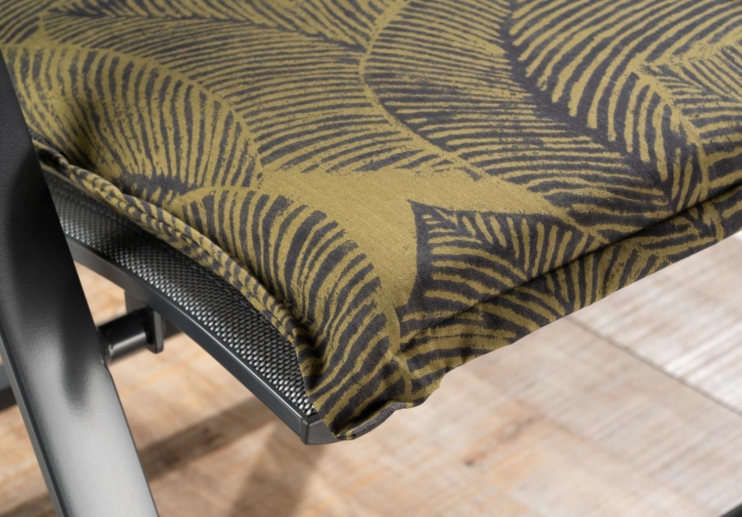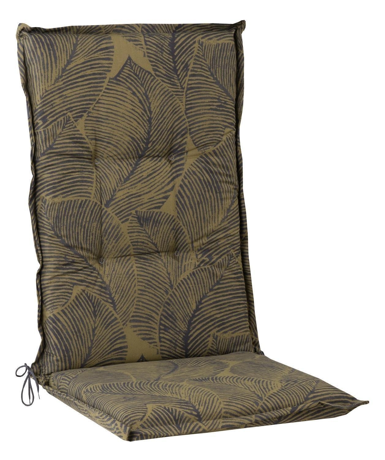 Die dunkelgrüne Gartenstuhlauflage ist 120 cm lang und 50 cm breit. Mit Blättermotiven in Schwarz verleiht sie Ihrem Garten eine natürliche Note. Die Kreissteppungen im Lehnenrücken und die seitlichen Bindekordeln mit verstellbarem Gurtband gewährleisten eine sichere Befestigung.