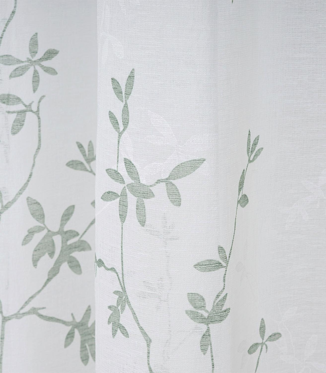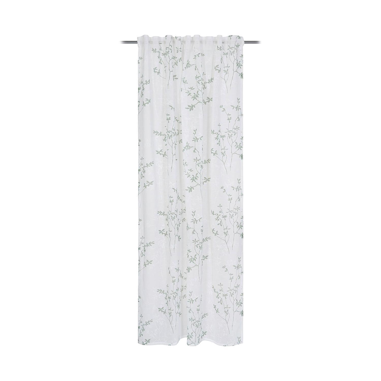Der verdeckte Schlaufenschal VICTORIA der Marke Gözze besteht aus Polyester und ist in Weiß erhältlich. Er ist mit Zweigmotiven in Salbeigrün gestaltet und verfügt über verdeckte Schlaufen zur Aufhängung. Ein Bügelband ist im Lieferumfang enthalten. Die Abmessungen betragen 245 cm in der Länge und 140 cm in der Breite.