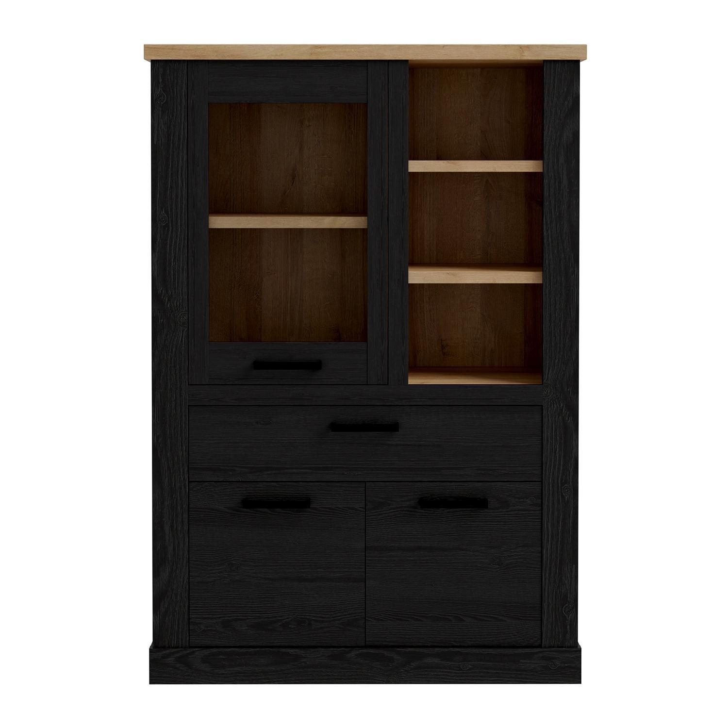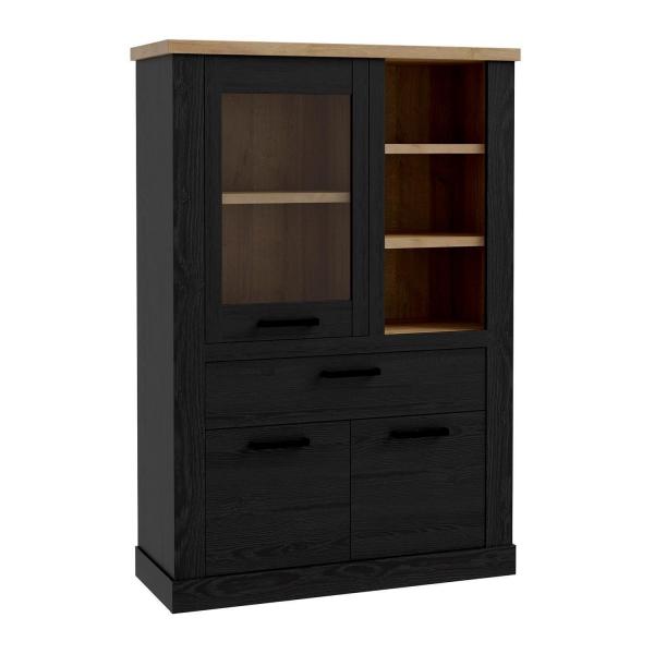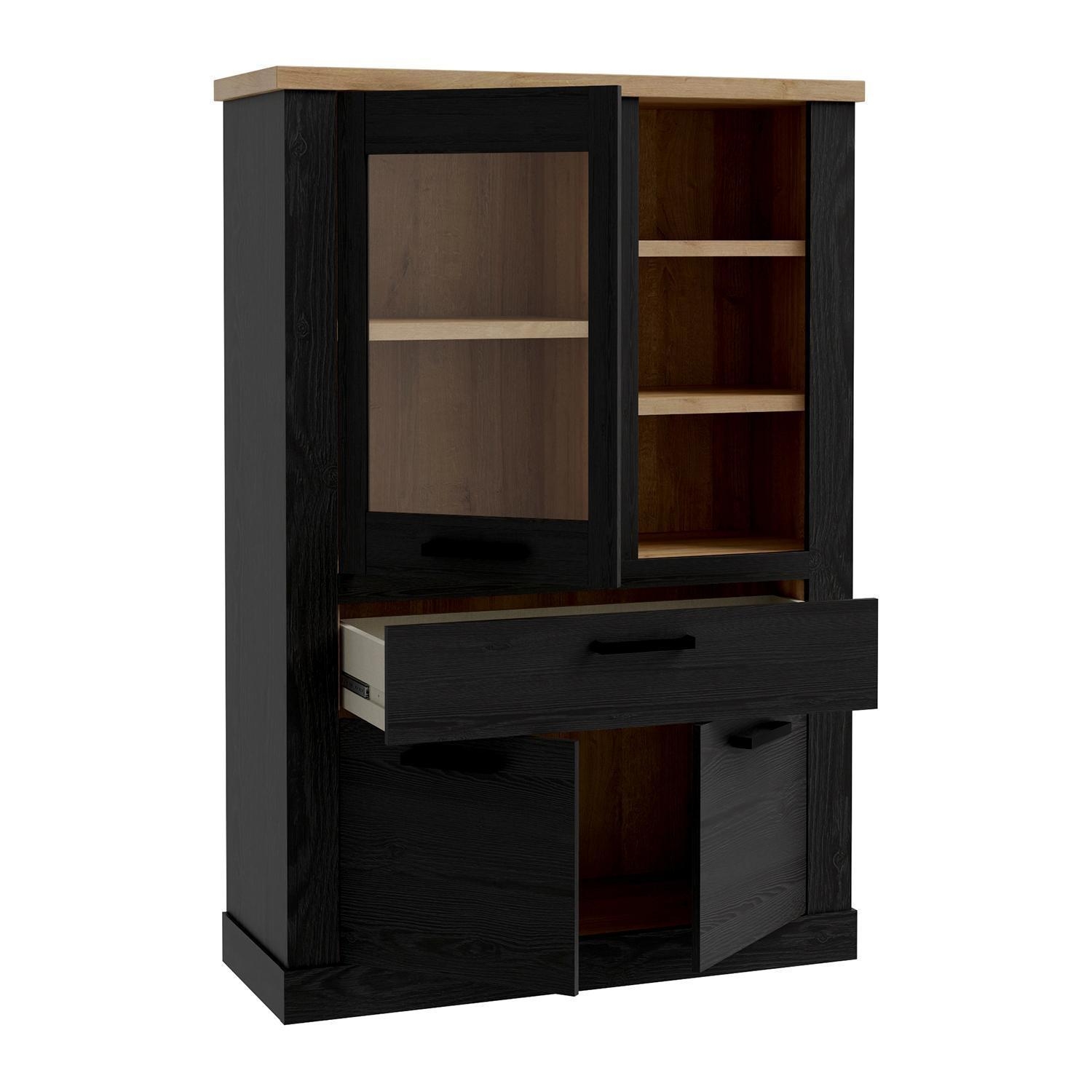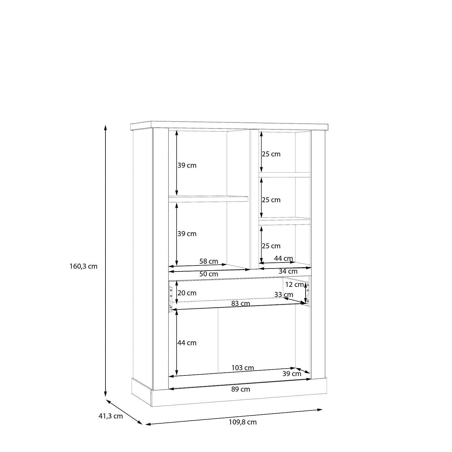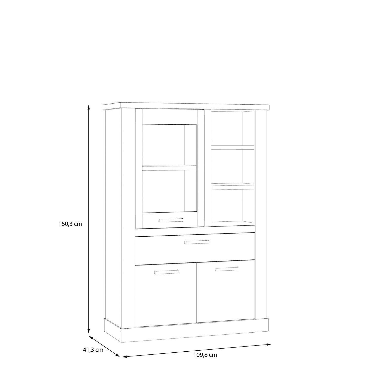 | Lieferumfang: | 1 Highboard mit 2 Türen, 1 Tür mit Glasfront, 1 Schublade, 3 Ablagefächern und 1 Einlegeboden. Eine Beleuchtung ist nicht enthalten |