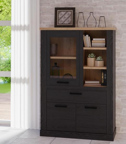 Das Highboard DAISY ist in Cabezone Eiche Dekor gefertigt. Die Oberplatte und das Innendekor sind in Riviera Eiche Dekor ausgeführt. Es verfügt über eine Schublade, drei Ablagefächer, zwei Türen, eine Tür mit Glasfront sowie einen Einlegeboden. Die Maße betragen 110 cm in der Breite, 160 cm in der Höhe und 42 cm in der Tiefe.