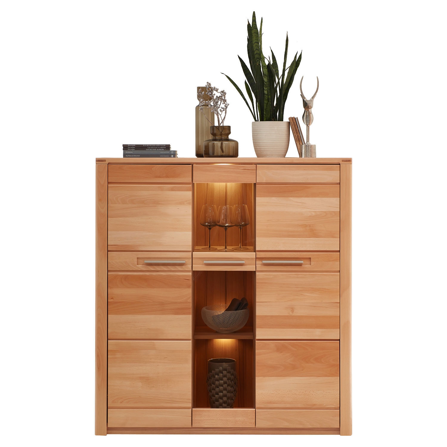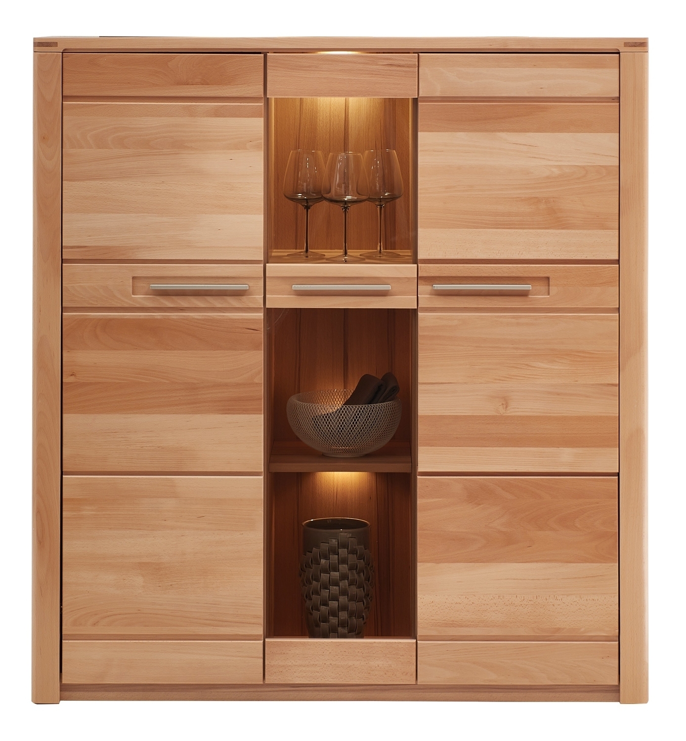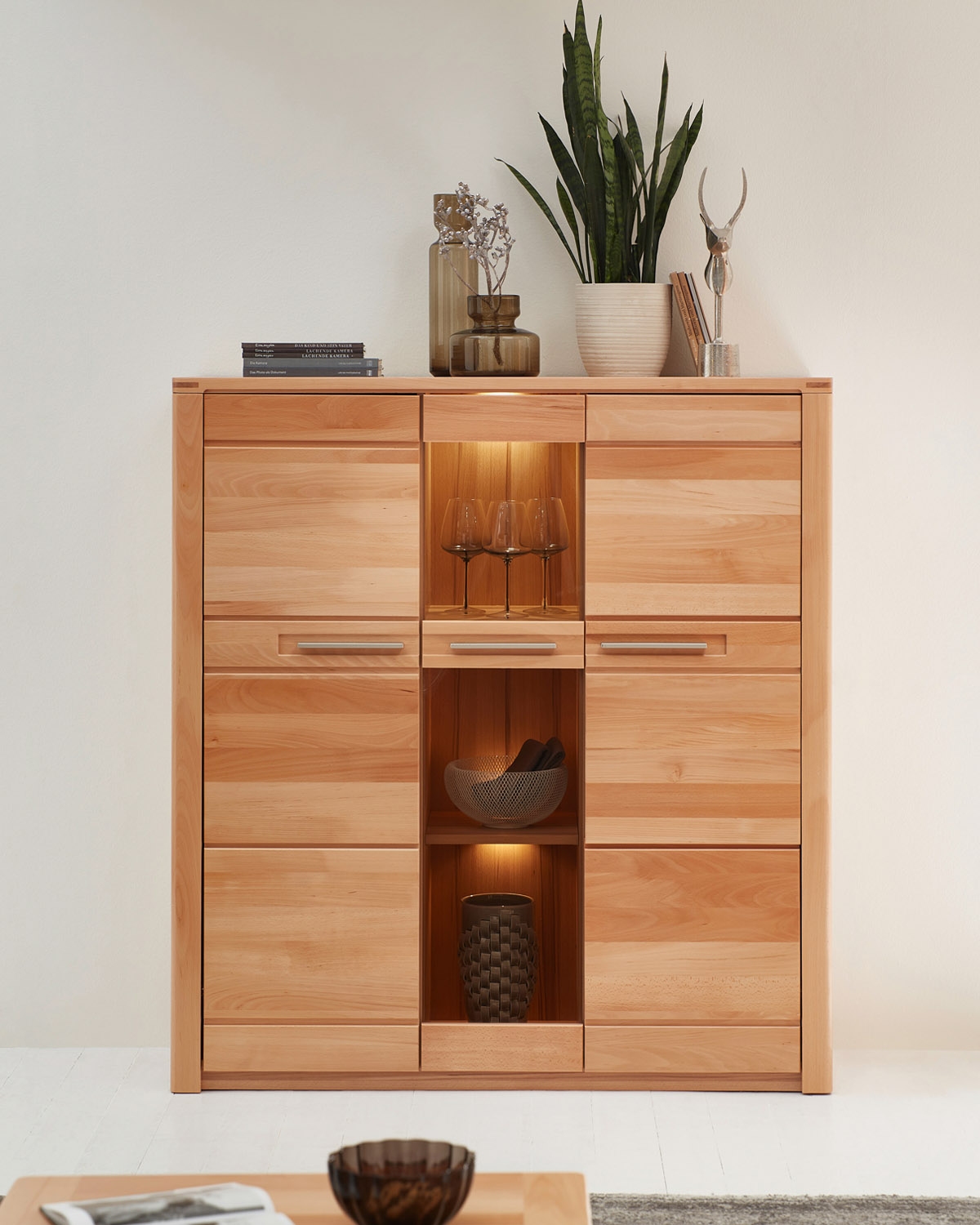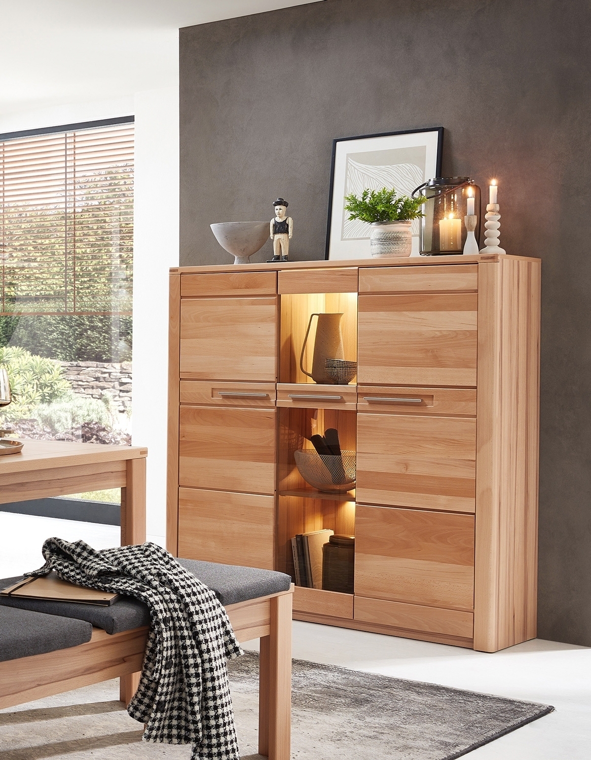 Das Highboard NOVANA ist eine harmonische Kombination aus natürlicher Schönheit und funktionaler Eleganz. Der Korpus ist mit einem attraktiven Kernbuche Dekor versehen, während die Fronten aus massivem Kernbuchenholz gefertigt sind. Durch die integrierte LED-Beleuchtung werden Ihre Ausstellungsstücke stilvoll hervorgehoben. Mit zwei Holztüren, einer Glastür und insgesamt acht Holzböden bietet dieses Highboard ausreichend Stauraum für verschiedenste Gegenstände. Mit einer Breite von 127 cm, einer Höhe von 137 cm und einer Tiefe von 40 cm ist es ein eindrucksvolles Möbelstück, das sich perfekt in Ihr Wohnambiente einfügt.