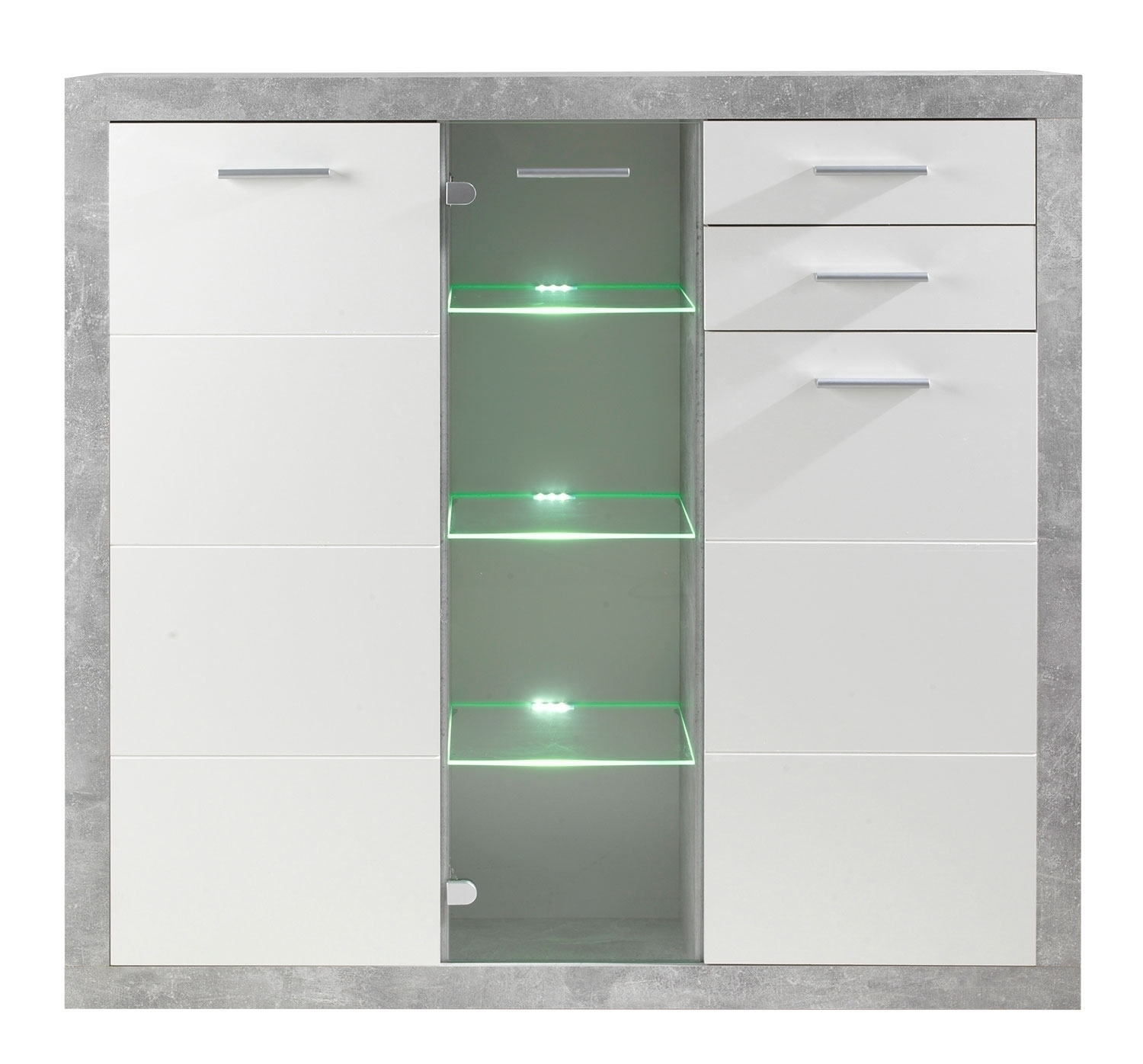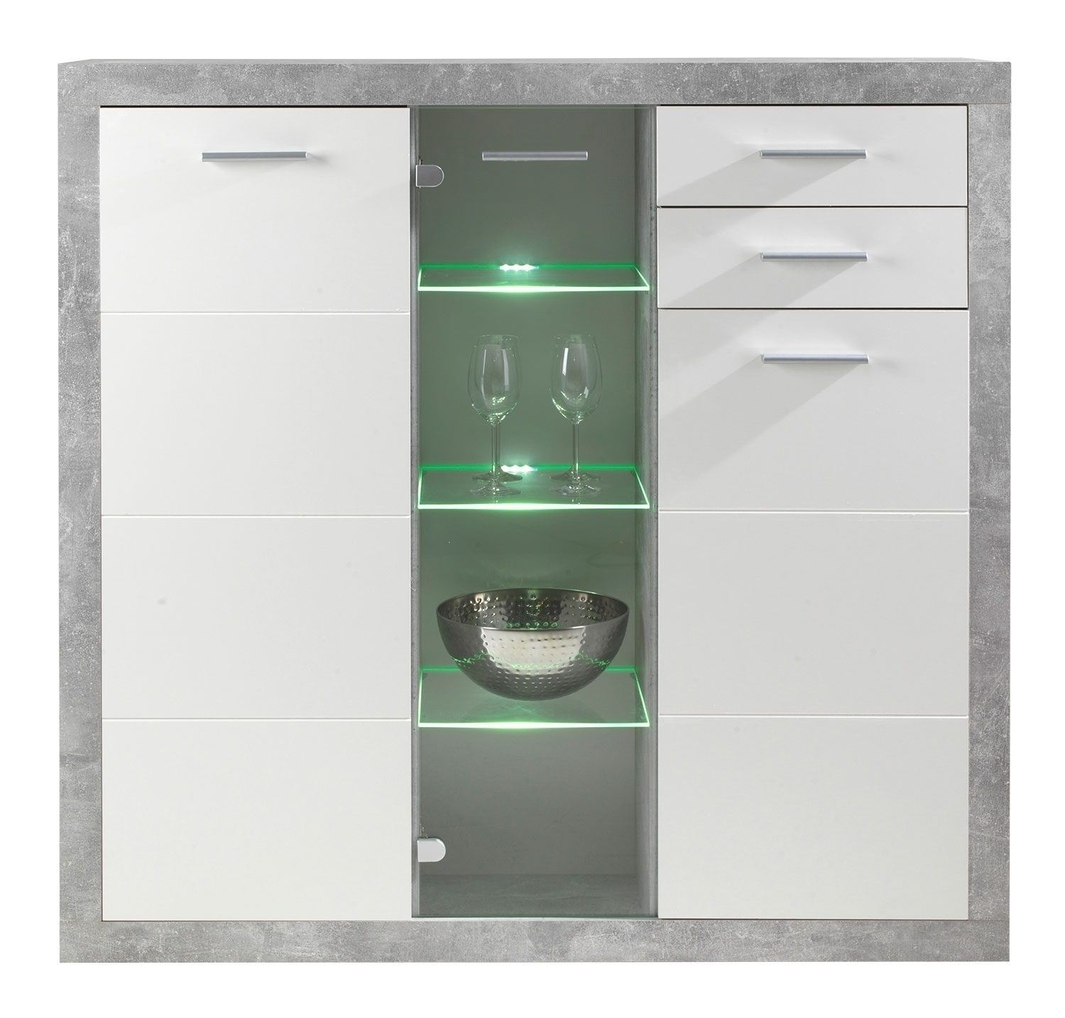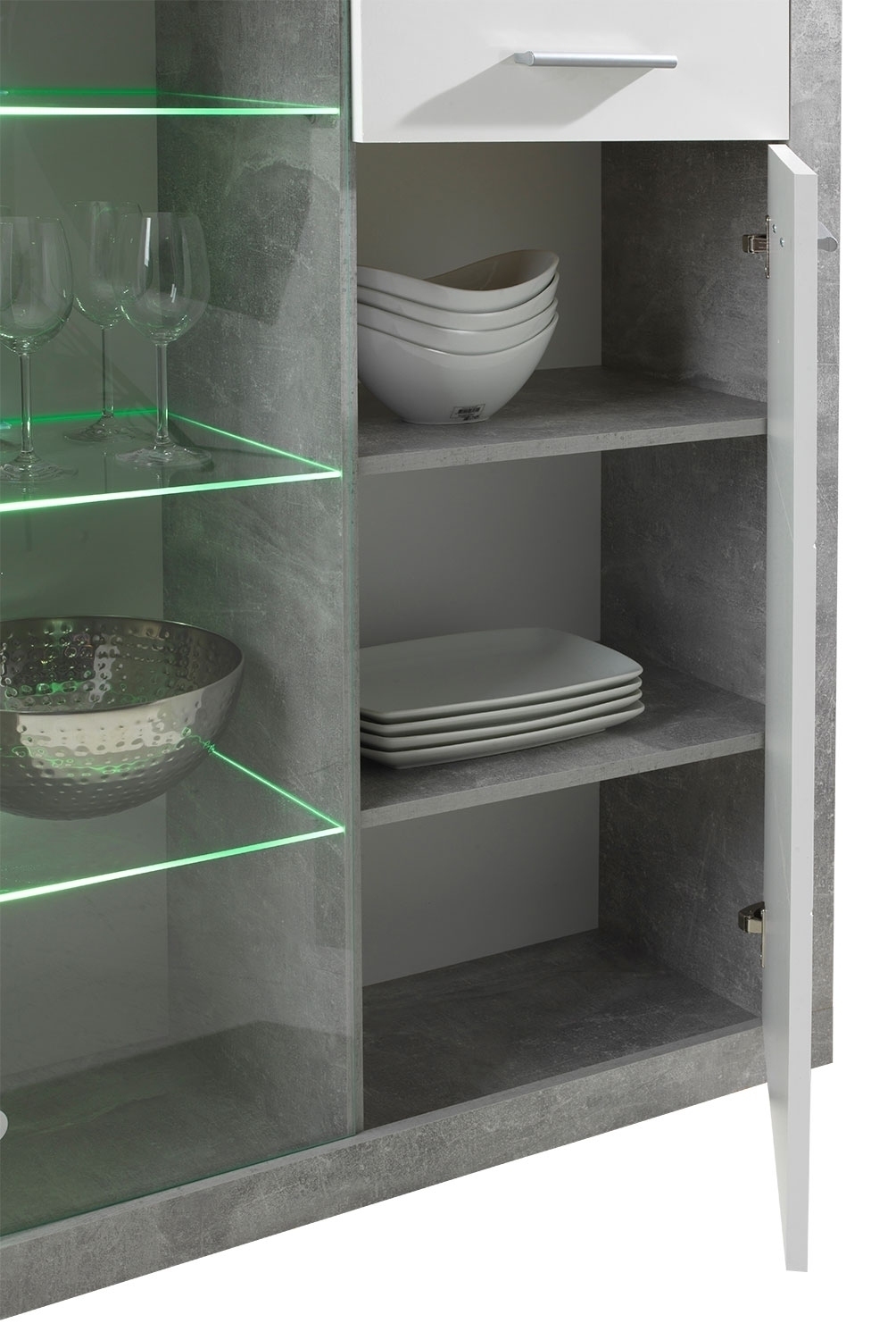 | Lieferumfang: | 1 Highboard mit 2 Türen, 1 Glastür und 2 Schubladen. Die LED-Beleuchtung ist enthalten |