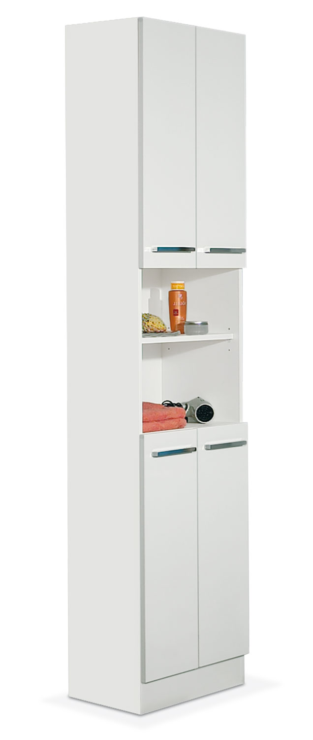 Der Hochschrank mit einer Front in leicht glänzendem weiß ist mit vier Türen und zwei offenen Fächern ausgestattet. Der Korpus und das Innere des Schranks sind weiß matt. Die chromfarbenen Griffe bestehen aus Kunststoff.