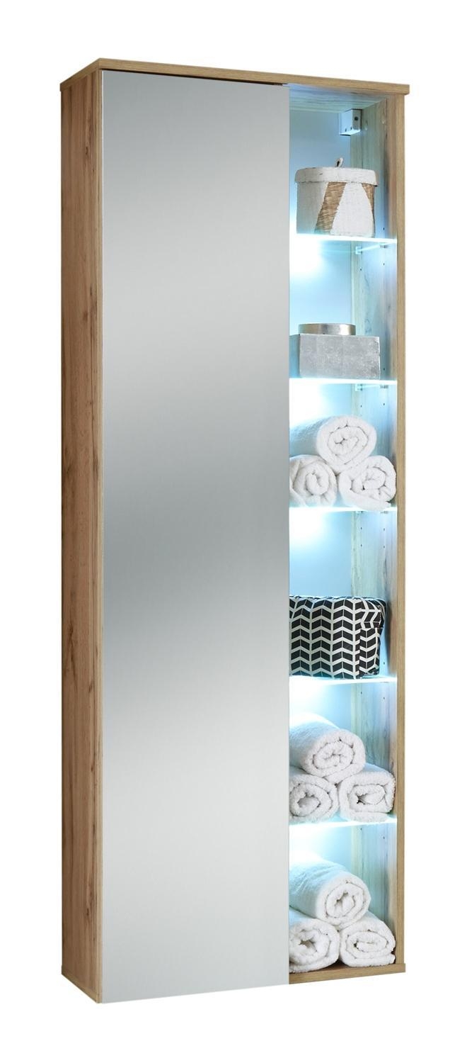 Der Hochschrank BERTA ist in Wildeiche Dekor gehalten und zur wandhängenden Montage vorgesehen. Er verfügt über eine Spiegeltür, die beidseitig montierbar ist, sowie über fünf Einlegeböden im Inneren. Zusätzlich ist der Schrank mit fünf Glasböden ausgestattet, die über LED-Beleuchtungen verfügen. Die Maße des Schranks betragen 55 cm in der Breite, 160 cm in der Höhe und 30 cm in der Tiefe.
