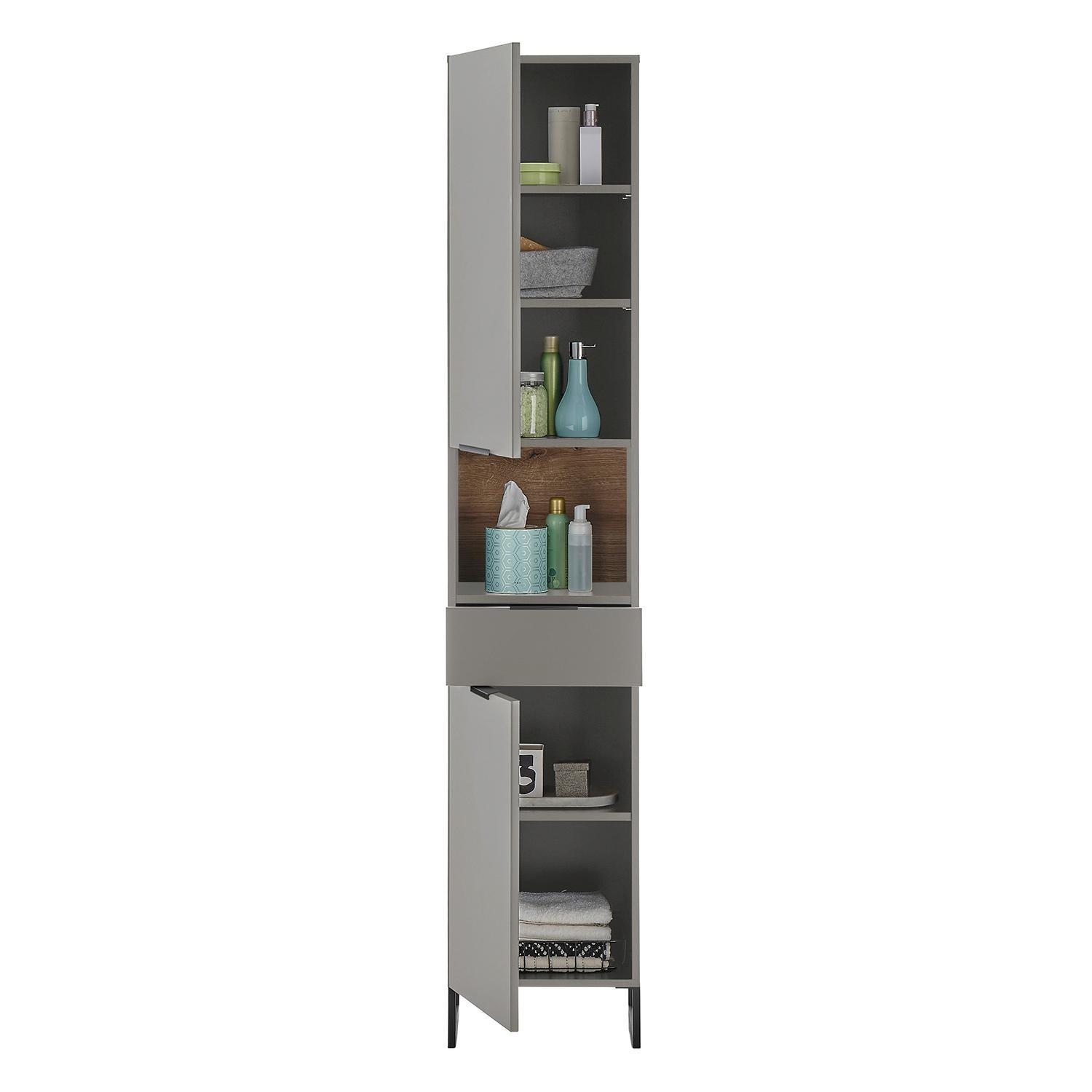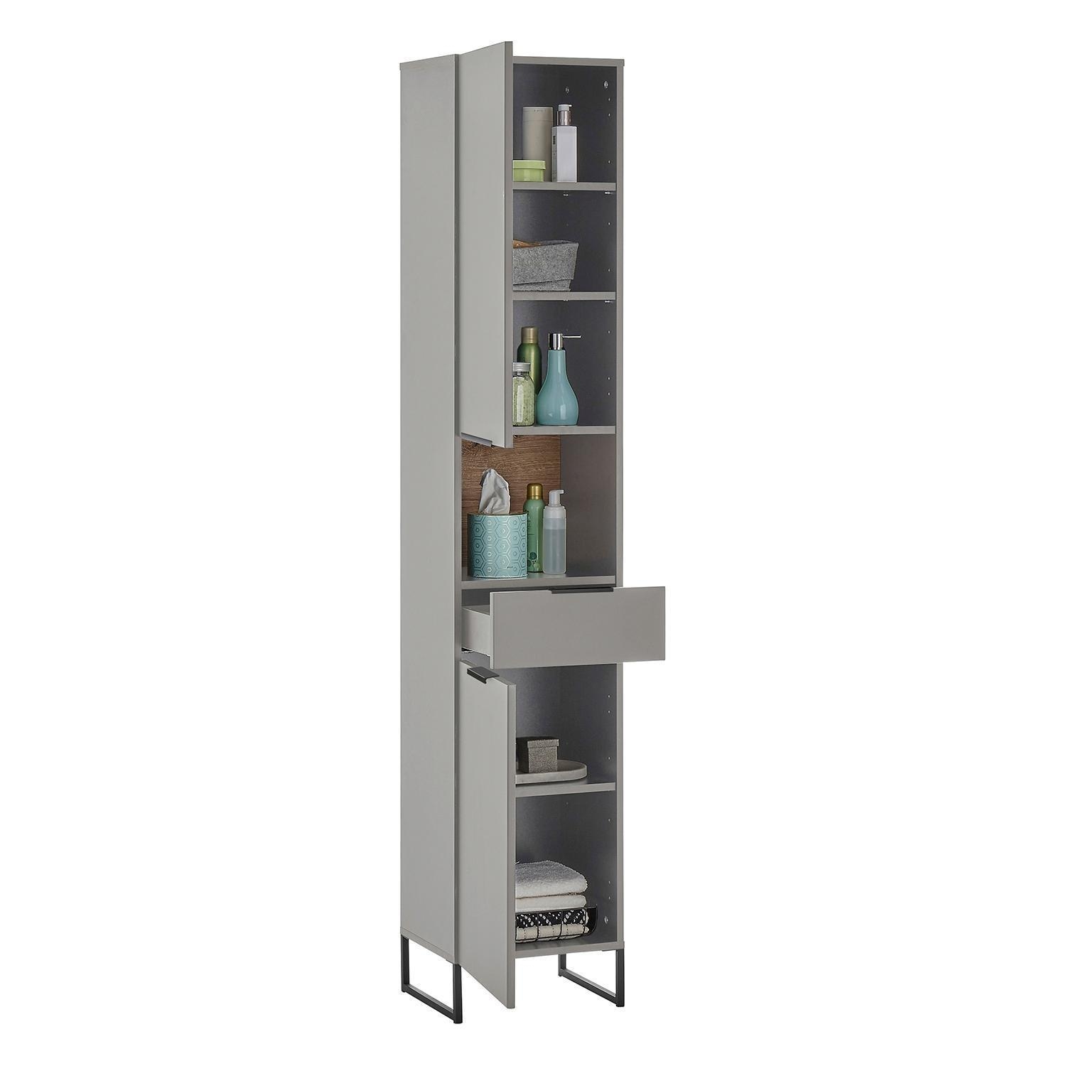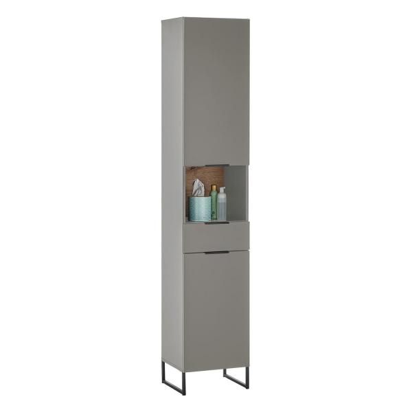 Der Hochschrank DENVER in Grau bietet vielseitigen Stauraum mit einer Breite von 38 cm, einer Höhe von 195 cm und einer Tiefe von 32 cm. Er ist mit zwei Türen, einer Schublade und drei Einlegeböden ausgestattet, die ausreichend Platz für verschiedene Gegenstände schaffen. Zusätzlich verfügt er über ein offenes Ablagefach, das schnellen Zugriff auf häufig genutzte Dinge ermöglicht.
