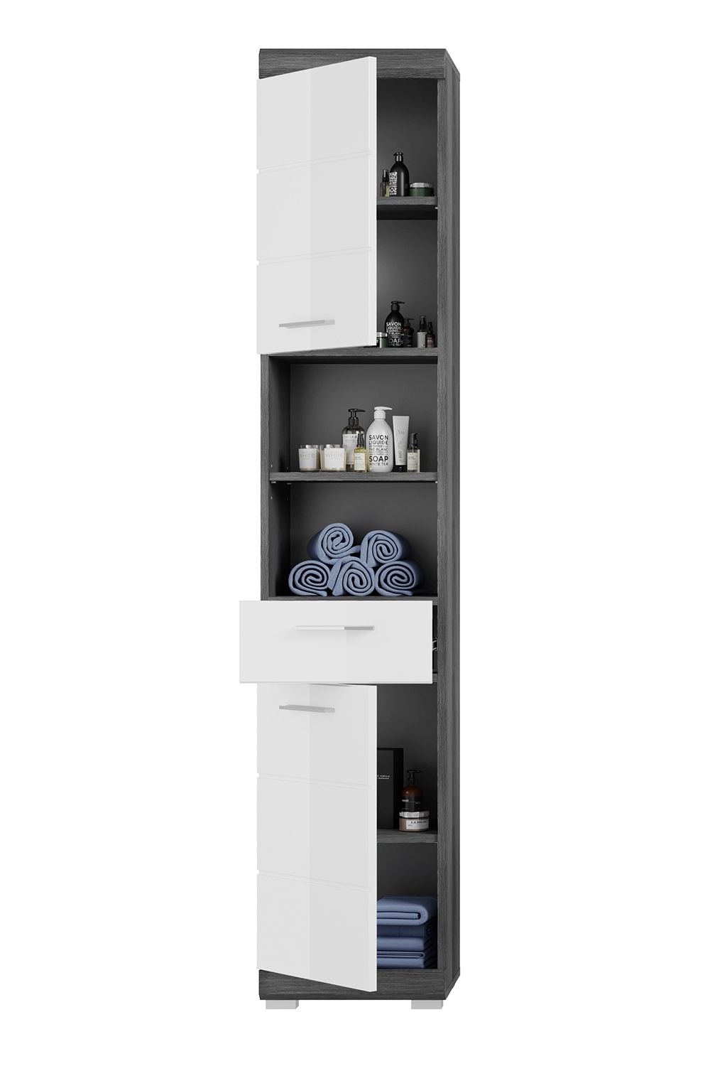 | Lieferumfang: | 1 Hochschrank mit 2 Türen, 1 Schublade, 6 Ablageflächen und 3 höheverstellbaren Einlegeböden |