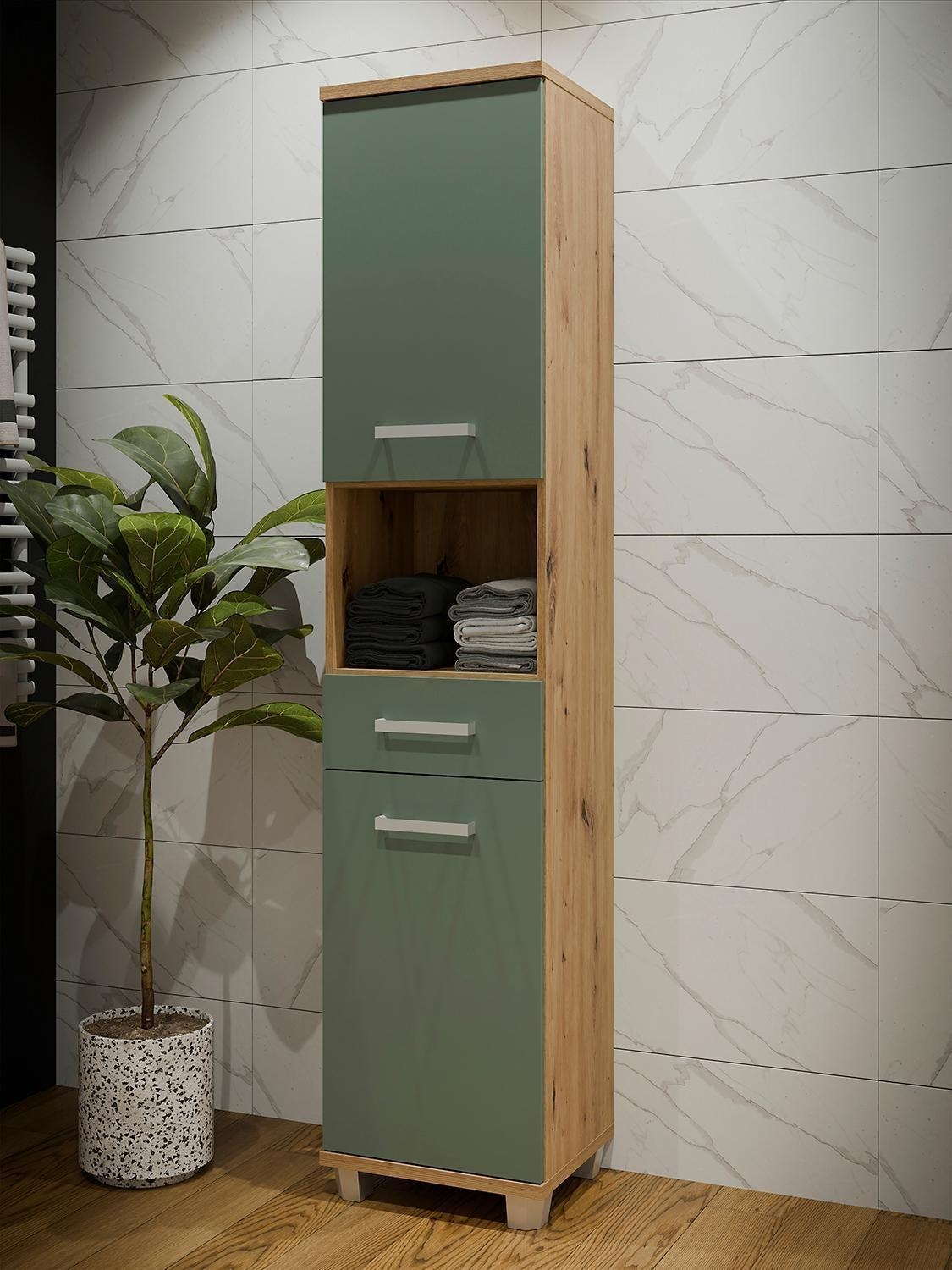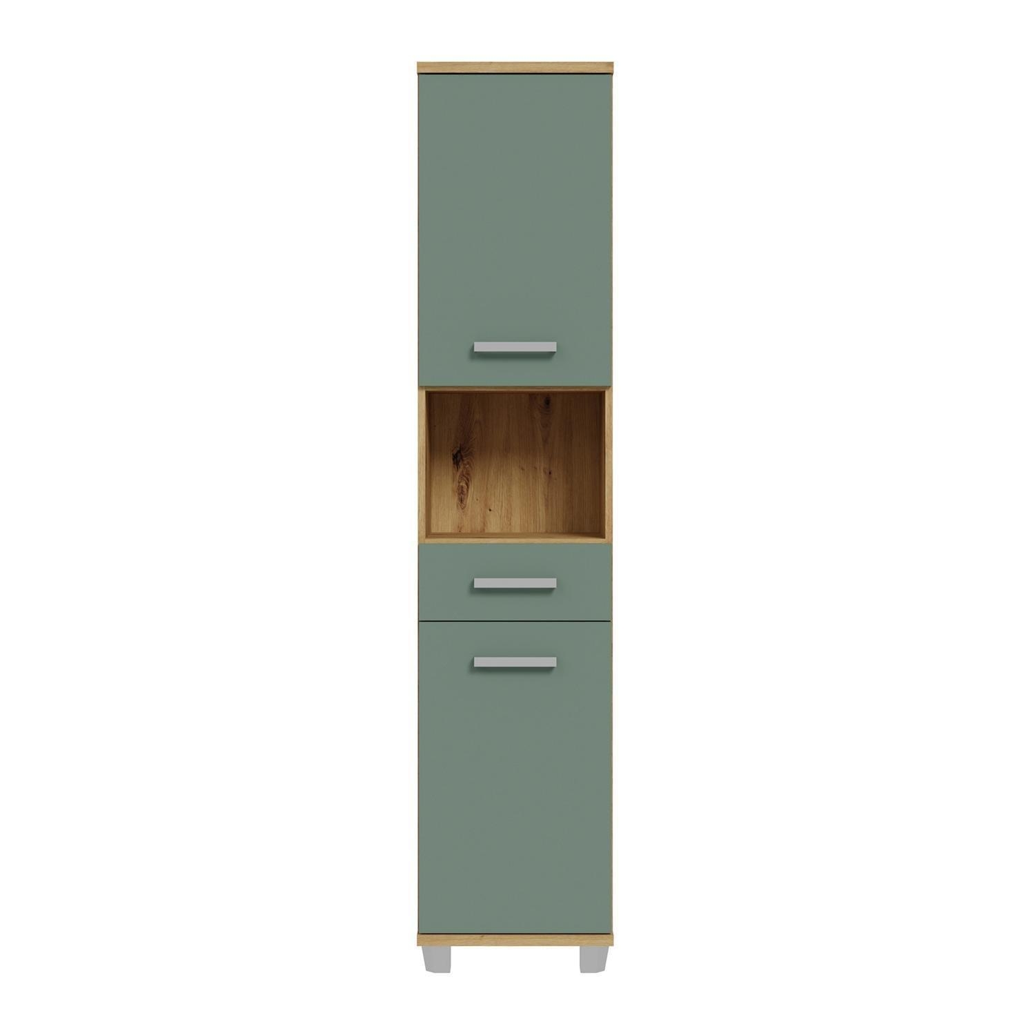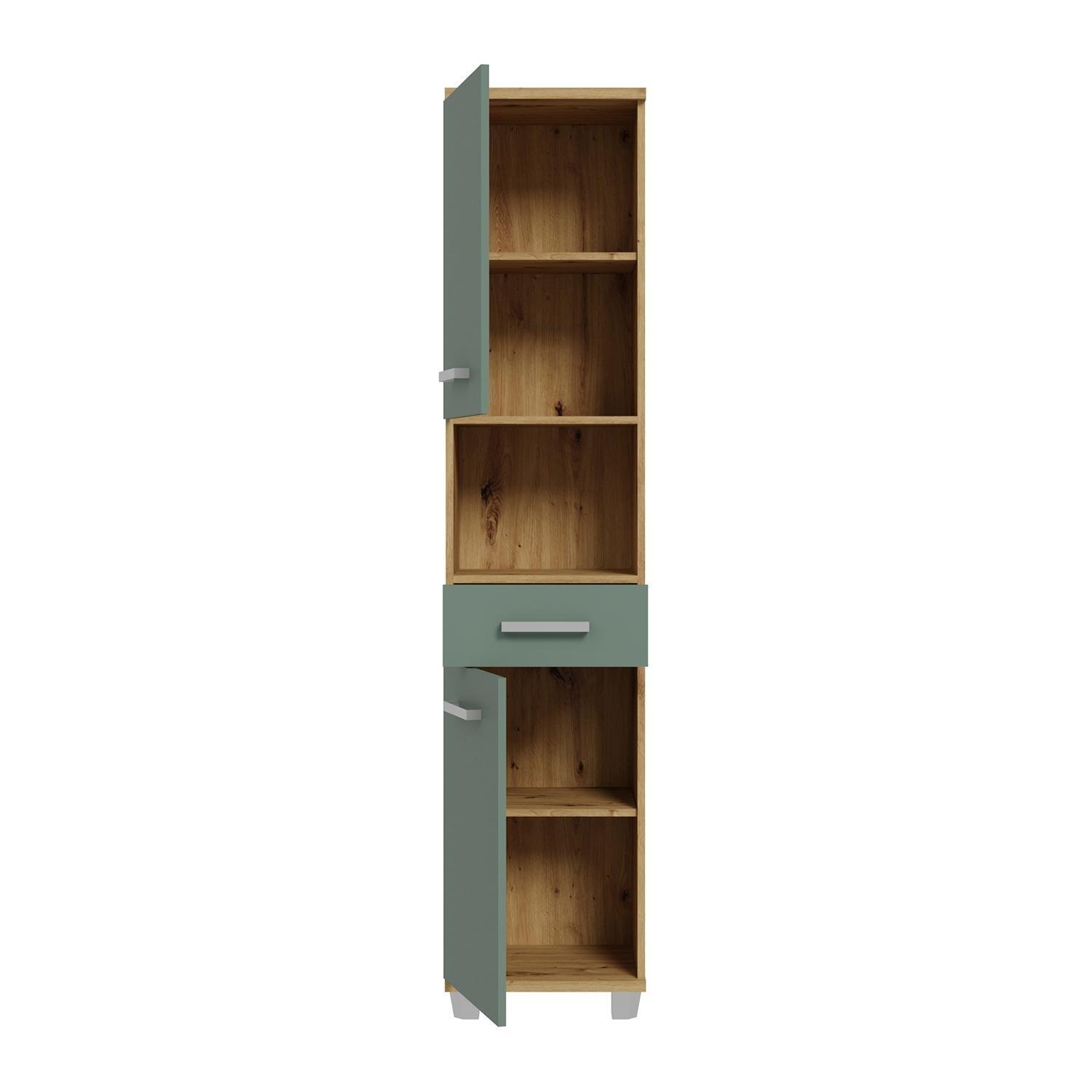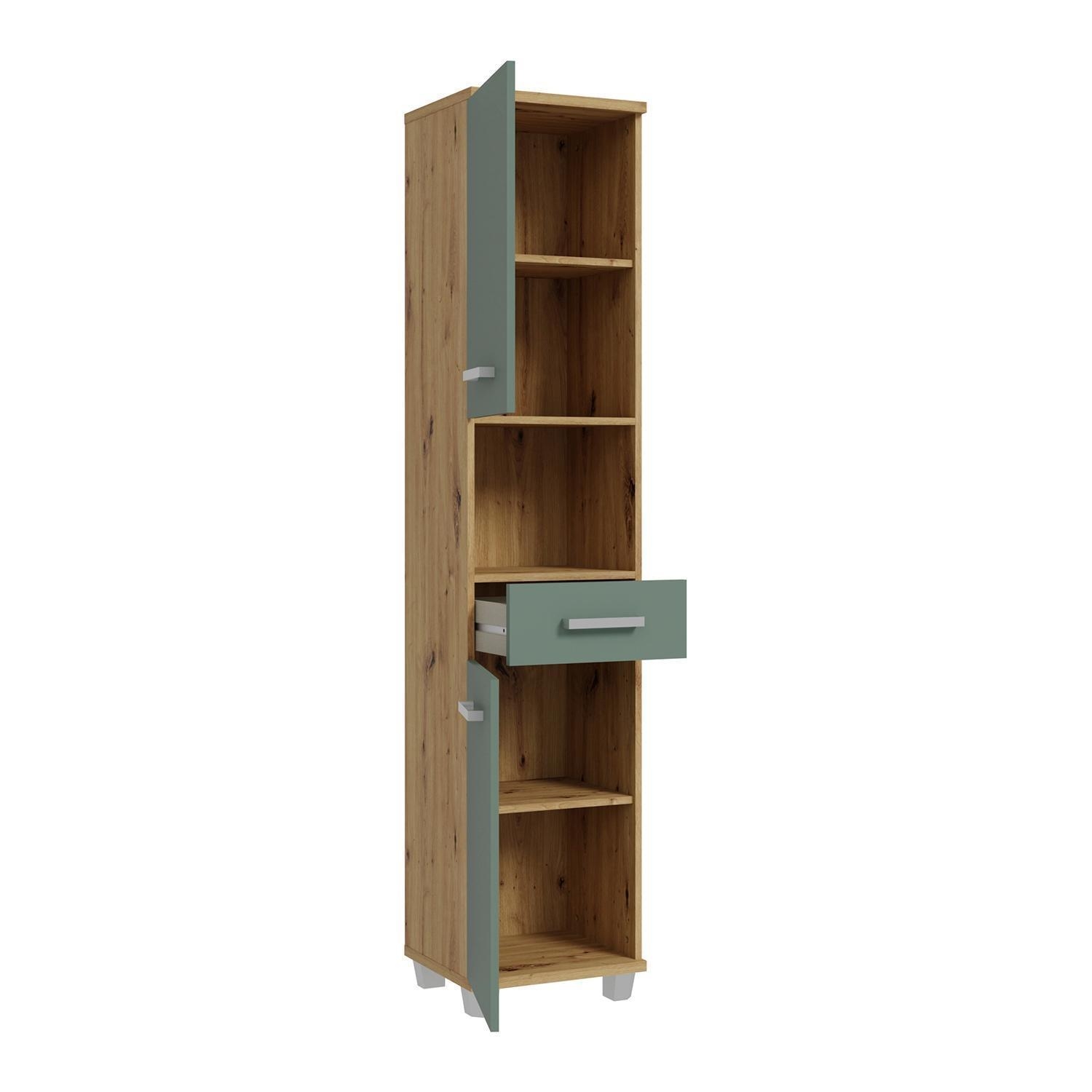 Der Lieferumfang umfasst einen Hochschrank mit 2 Türen, 1 Schublade, 1 Ablagefach und 2 Einlegeböden. Das Artisan Eiche Dekor verleiht dem Schrank eine warme und natürliche Ausstrahlung, während die salbeigrün matte Oberfläche einen modernen Touch hinzufügt.