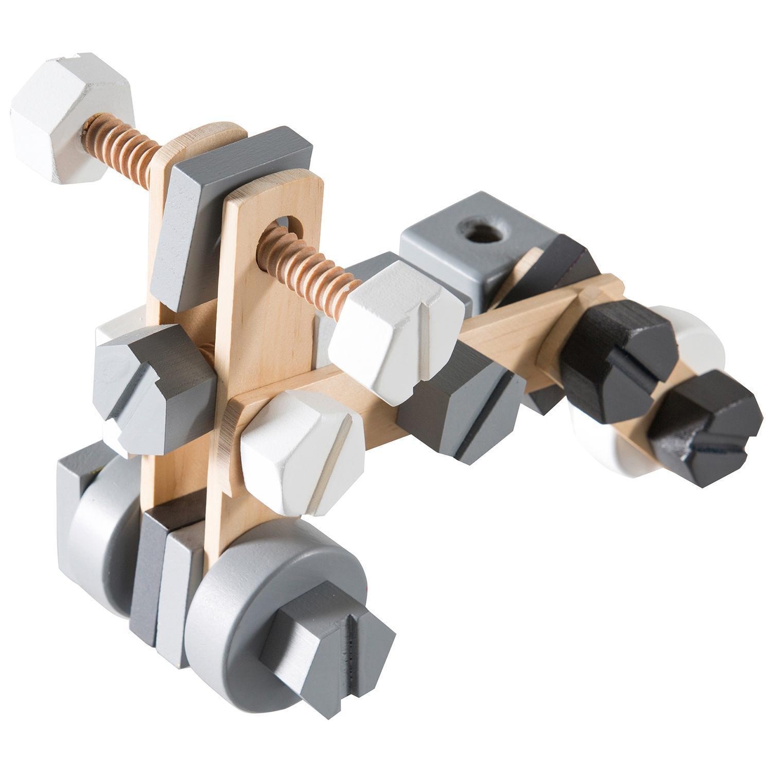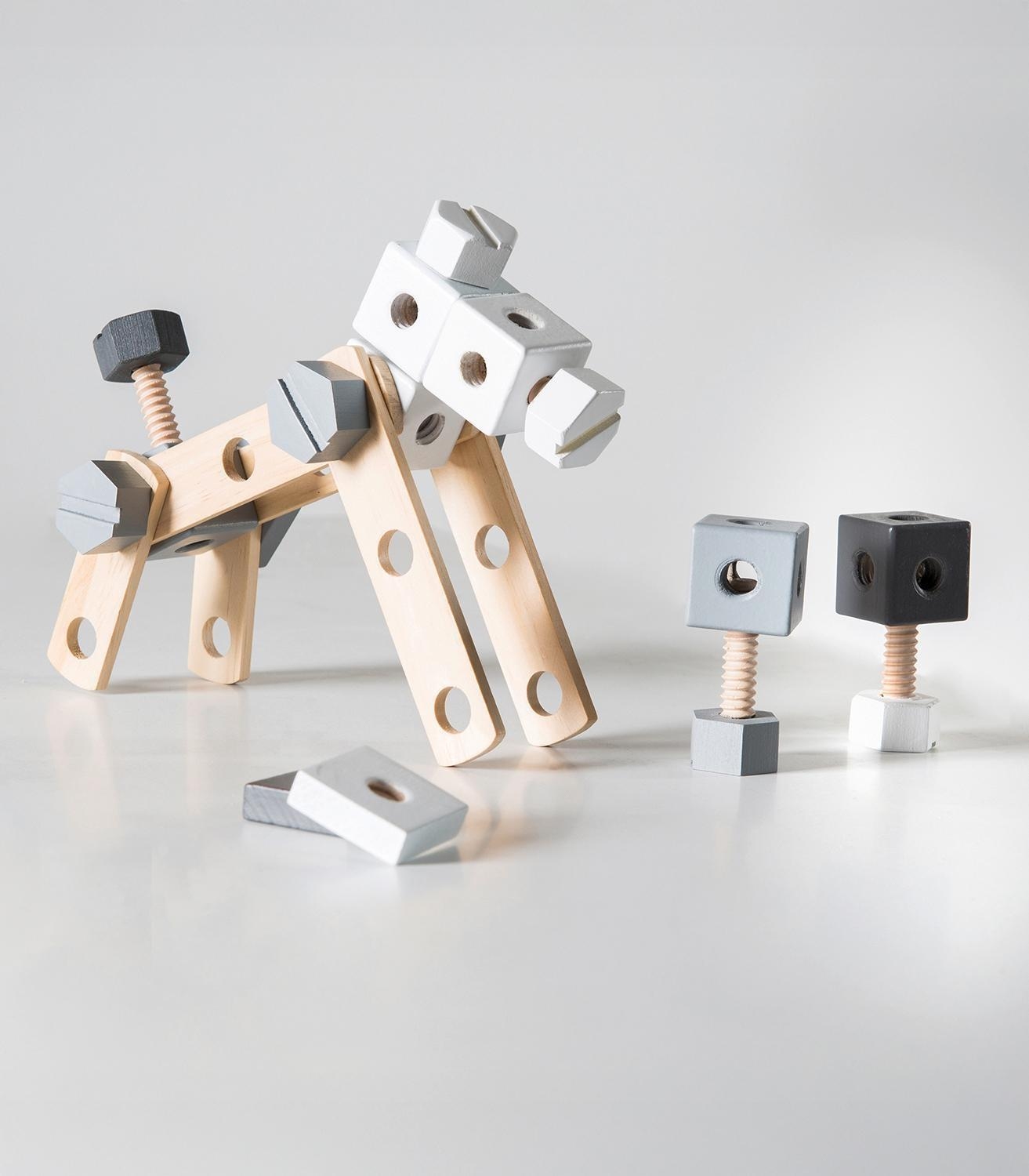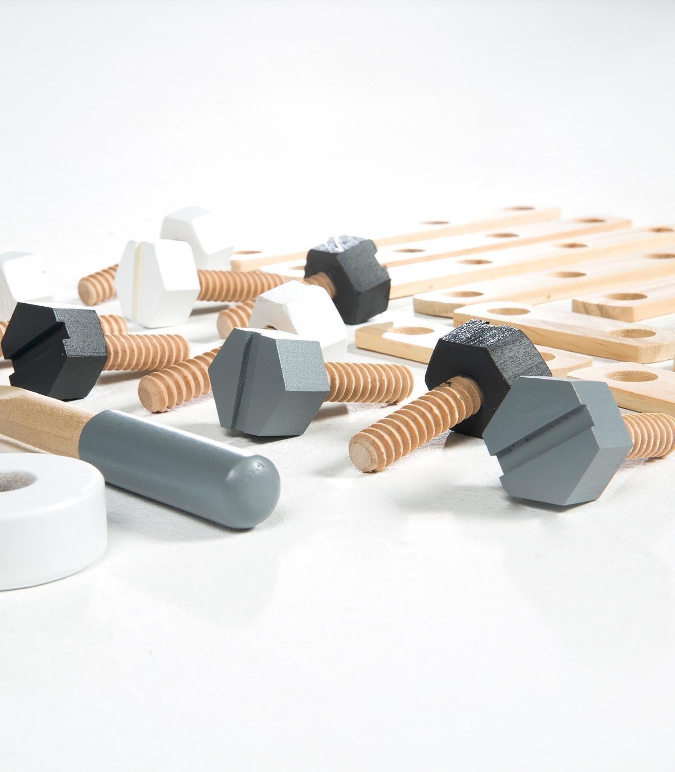 Das Holzbaukasten-Set HORST besteht aus Schichtholz und umfasst 48 Teile. Zum Baukasten gehören eine Werkzeugkiste sowie Werkzeug. Außerdem enthält das Konstruktionsset Schrauben, Schraubwürfel, Scheiben und Schraubplatten. Das Spielset ist für Kinder ab 3 Jahren geeignet und hat eine Breite von 30 cm, eine Höhe von 5 cm sowie eine Tiefe von 25 cm.