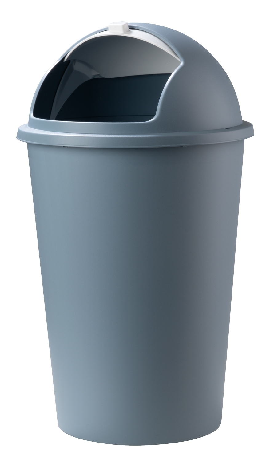 Der pastellblaue Mülleimer mit weißem Deckel besteht aus leichtem Kunststoff und verfügt über ein Fassungsvermögen von 50 Liter.