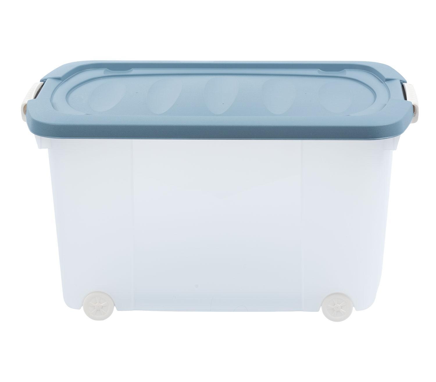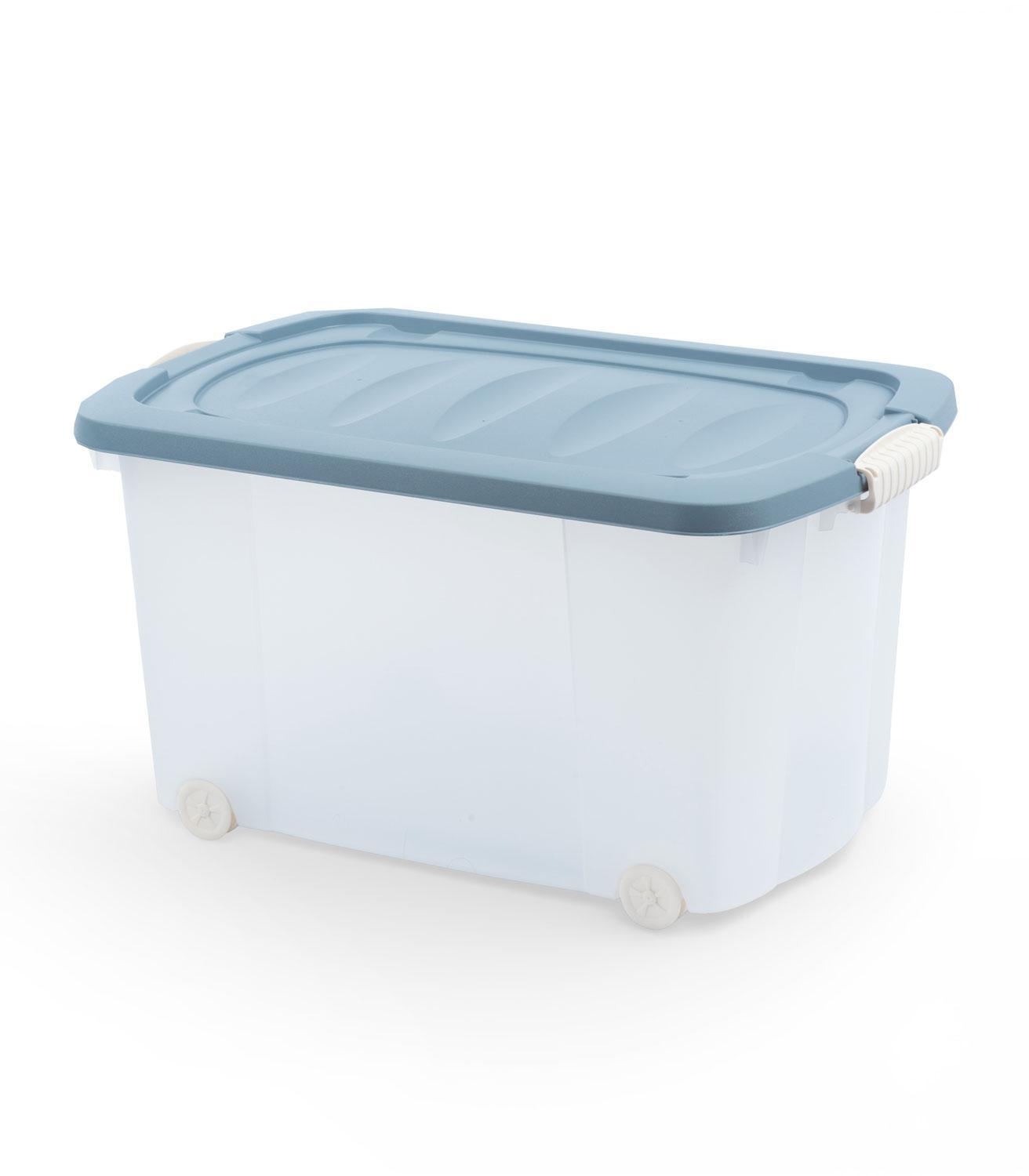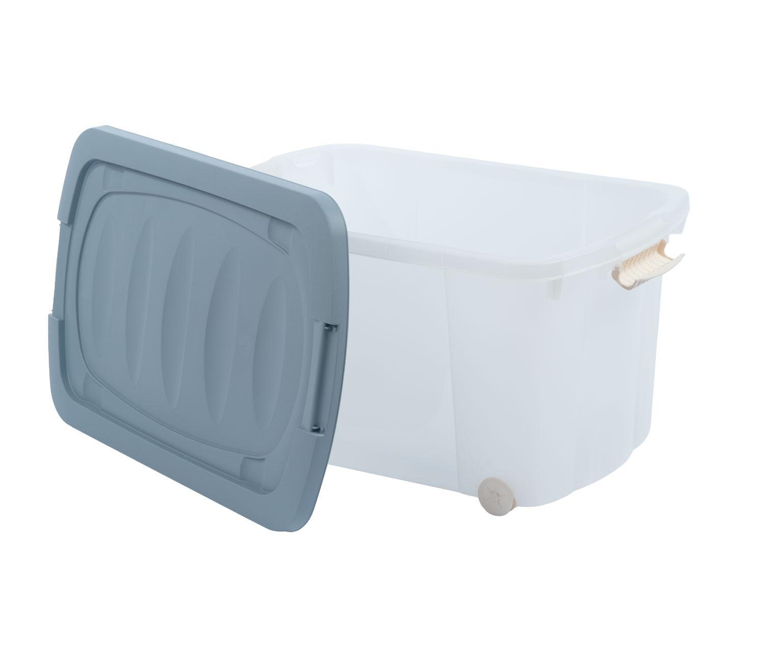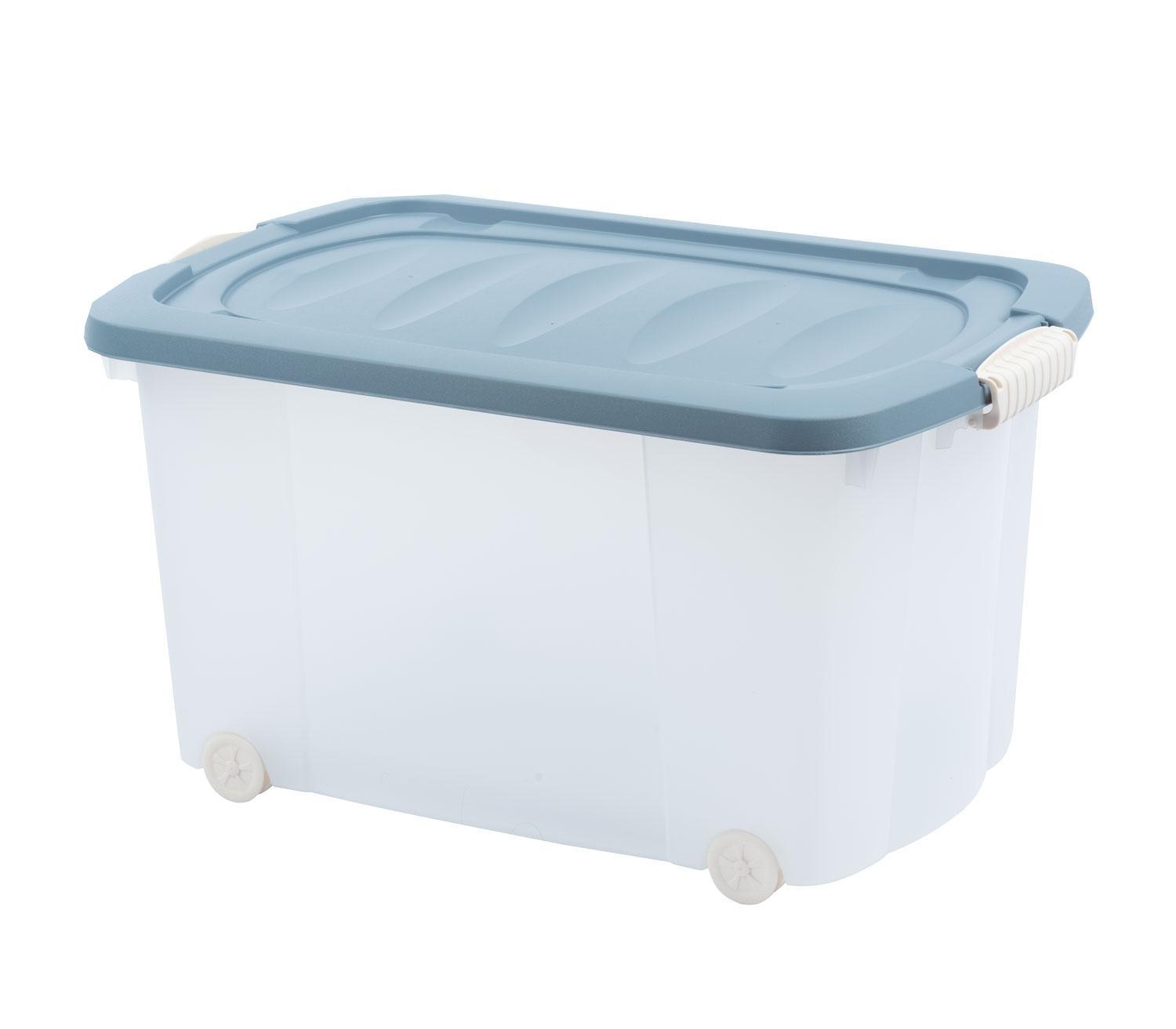 Die Aufbewahrungsbox von Home4You überzeugt mit ihrem praktischen Design in Transparent und Pastellblau. Mit einer Größe von B 60 x H 40 x T 32 cm bietet sie viel Stauraum für verschiedene Gegenstände. Der stabile Kunststoffdeckel schützt den Inhalt, während vier Rollen und zwei Tragegriffe den Transport erleichtern. Zudem ist die Box stapelbar und somit ideal für eine platzsparende Aufbewahrung geeignet.