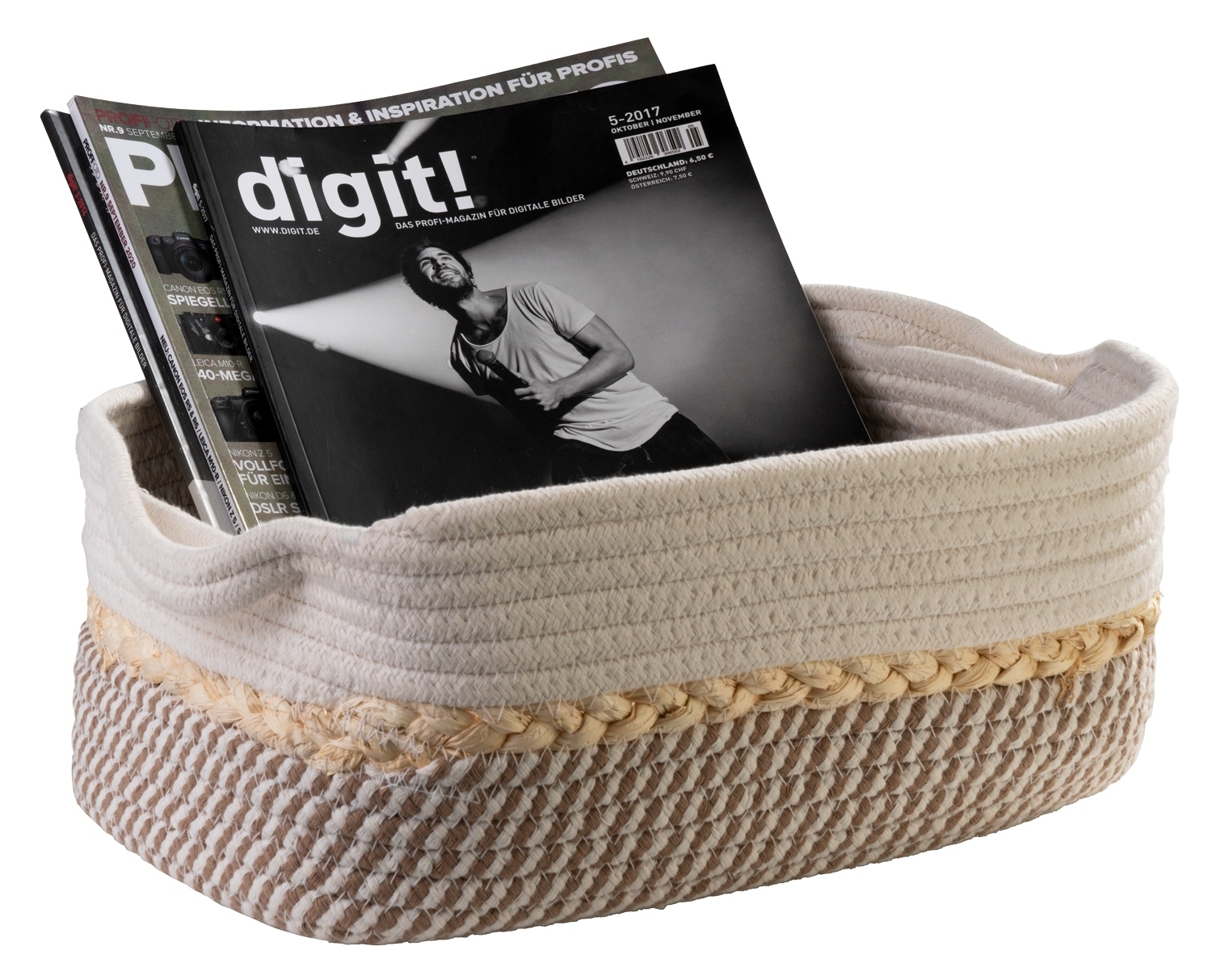 Der Aufbewahrungskorb ARIA von Home4You in beige und weiß besteht aus Baumwolle. Er eignet sich ideal zur Aufbewahrung von Spielzeug, Zeitschriften und vielem mehr. Mit seitlichen Griffen und einer Breite von 33 cm, einer Tiefe von 23 cm und einer Höhe von 13 cm ist er praktisch und platzsparend. Der Aufbewahrungskorb ist nicht für die Waschmaschine geeignet.