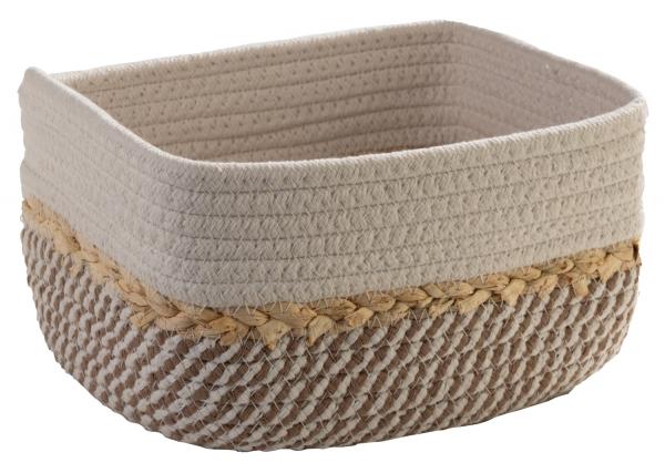 Der Aufbewahrungskorb ARIA von Home4You in beige und weiß besteht aus Baumwolle. Er eignet sich ideal zur Aufbewahrung von Spielzeug, Zeitschriften und vielem mehr. Ohne Griffe, mit einer Breite von 23 cm, einer Tiefe von 18 cm und einer Höhe von 13 cm ist er praktisch und platzsparend. Der Aufbewahrungskorb ist nicht für die Waschmaschine geeignet.