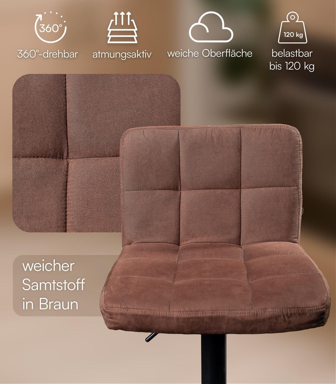 Der Home4You Barhocker ist die perfekte Kombination aus Komfort und Stil für Ihre Bar oder Küchentheke. Mit einem eleganten Braunton und einem samtigen Bezug bietet dieser Barhocker nicht nur eine luxuriöse Optik, sondern auch eine angenehme Sitzfläche. Dieser Barhocker ist höhenverstellbar und verfügt über einen praktischen Gaslift, mit dem Sie die Höhe ganz nach Ihren Wünschen einstellen können. Dies ermöglicht Ihnen eine optimale Anpassung an die Höhe Ihrer Theke oder Ihres Tresens.