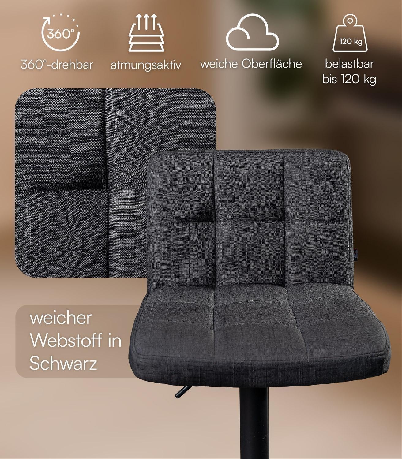 Der Home4You Barhocker JIVE ist die perfekte Kombination aus Komfort und Stil für Ihre Bar oder Küchentheke. Mit einem Webstoffbezug in Schwarz bietet dieser Barhocker nicht nur eine tolle Optik, sondern auch eine angenehme Sitzfläche. Dieser Barhocker ist höhenverstellbar und verfügt über einen praktischen Gaslift, mit dem Sie die Höhe ganz nach Ihren Wünschen einstellen können. Dies ermöglicht Ihnen eine optimale Anpassung an die Höhe Ihrer Theke oder Ihres Tresens.