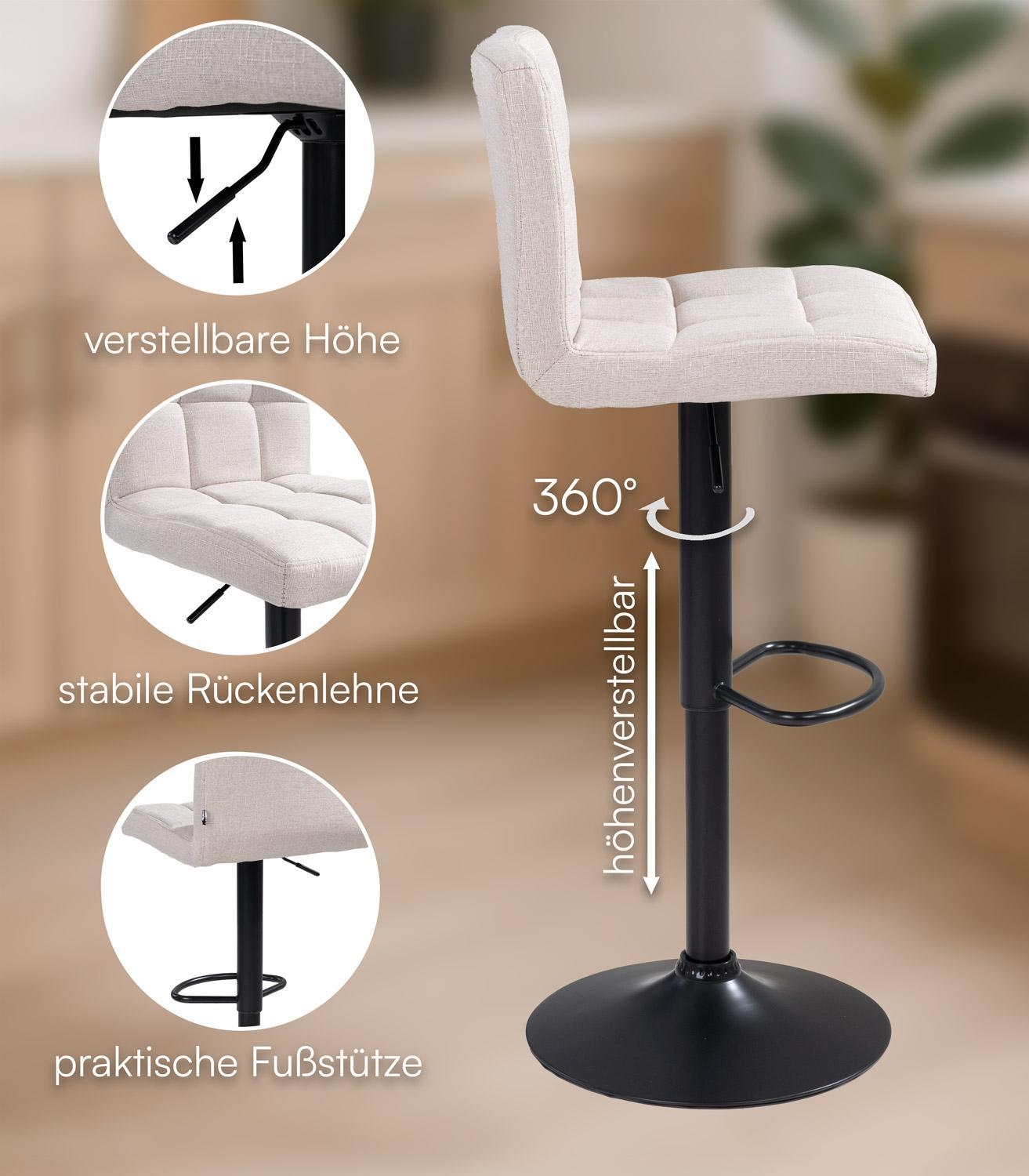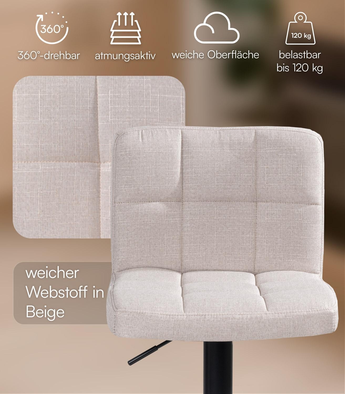 Der Home4You Barhocker JIVE ist die perfekte Kombination aus Komfort und Stil für Ihre Bar oder Küchentheke. Mit einem Webstoffbezug in Beige bietet dieser Barhocker nicht nur eine tolle Optik, sondern auch eine angenehme Sitzfläche. Dieser Barhocker ist höhenverstellbar und verfügt über einen praktischen Gaslift, mit dem Sie die Höhe ganz nach Ihren Wünschen einstellen können. Dies ermöglicht Ihnen eine optimale Anpassung an die Höhe Ihrer Theke oder Ihres Tresens.