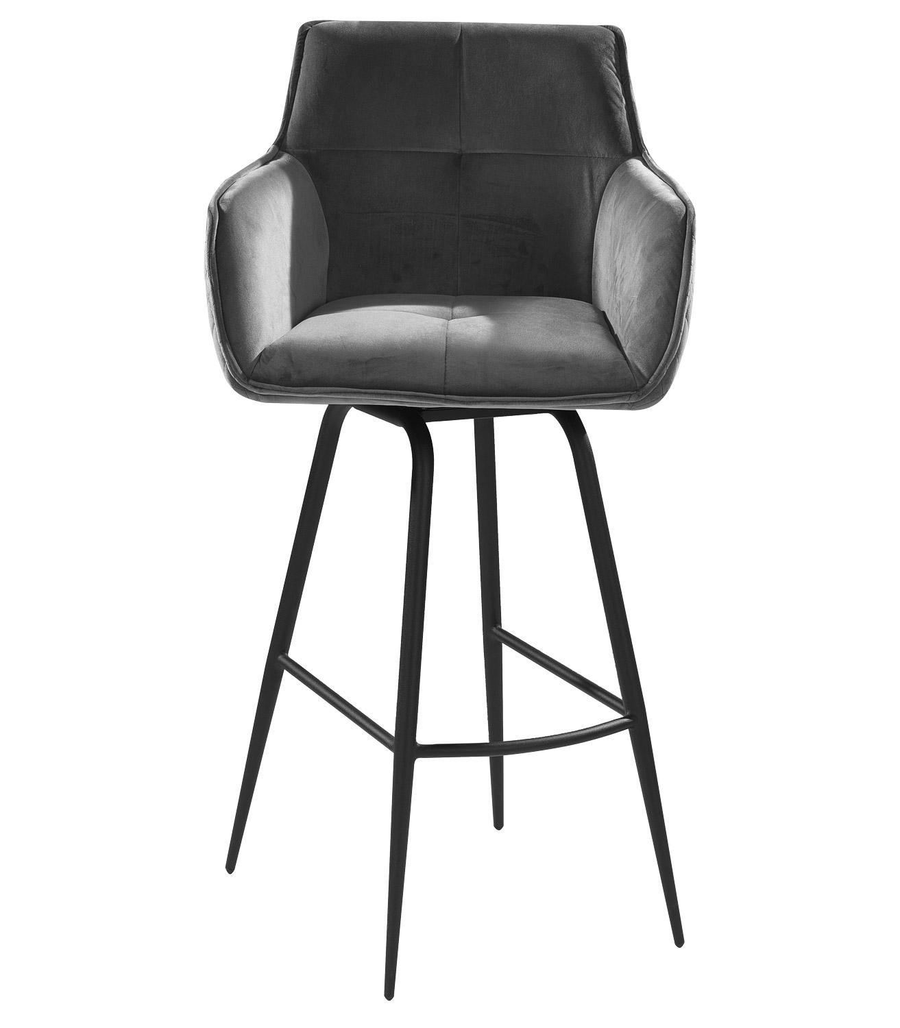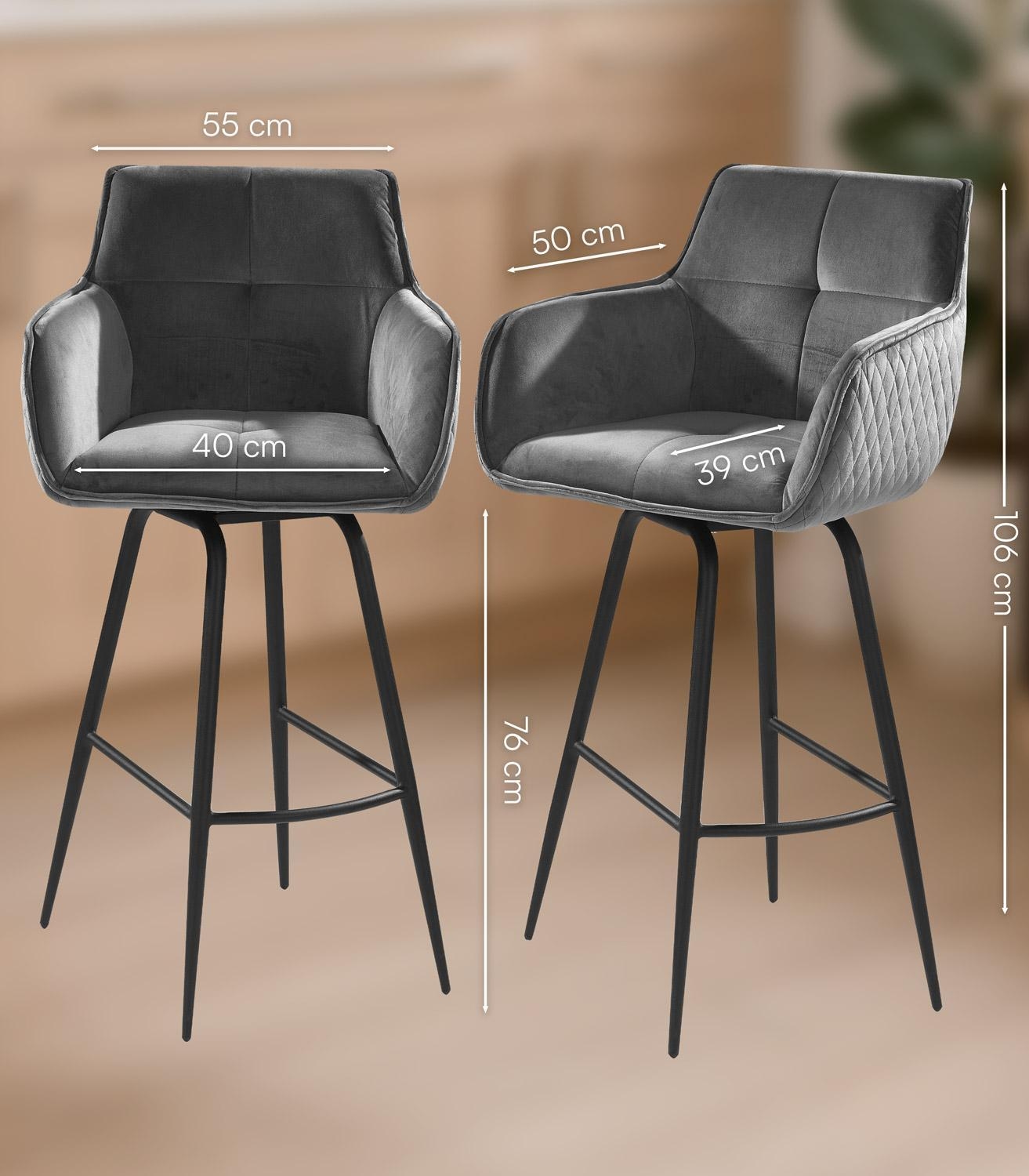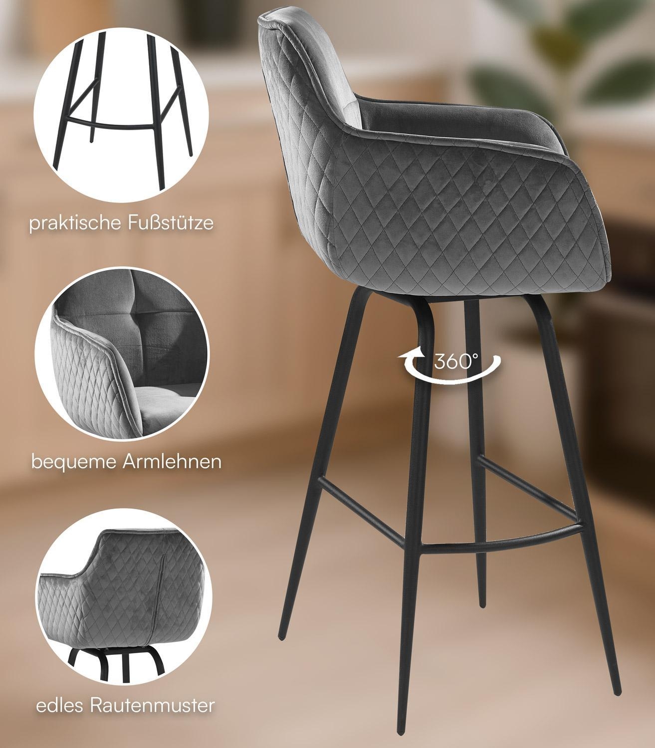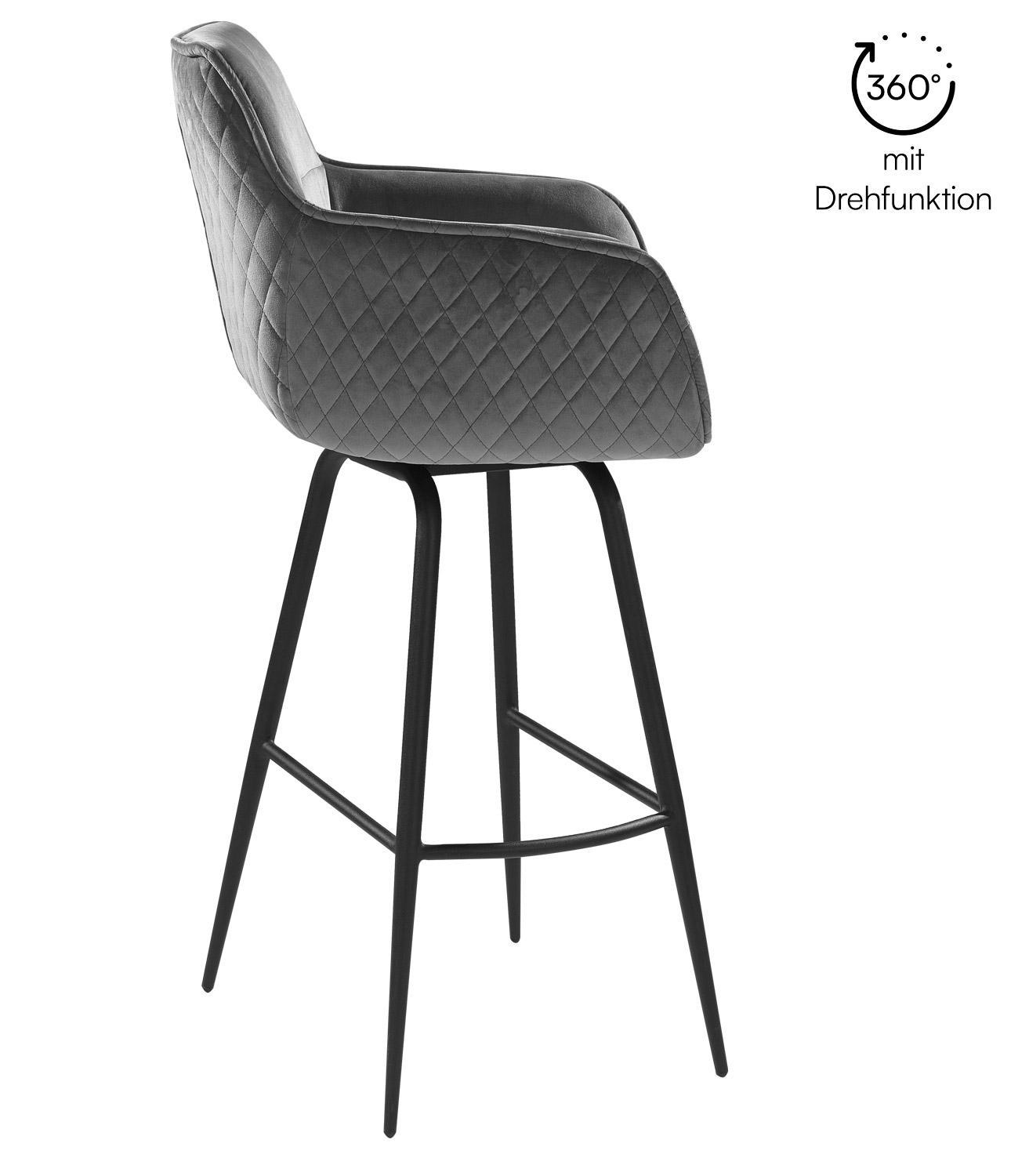 Der Barhocker JORIS von Home4You vereint stilvolles Design und hohen Komfort. Mit seinem eleganten schwarzen Samtbezug und einem stabilen Metallgestell in Schwarz ist er ein echter Hingucker. Die bequemen Armlehnen und die praktische Fußablage sorgen für zusätzlichen Sitzkomfort. Der Hocker ist 360 Grad drehbar ohne Rückstellfunktion, was Flexibilität ermöglicht. Mit einer Breite von 55 cm, einer Höhe von 106 cm und einer Tiefe von 50 cm bietet er ausreichend Platz. Die maximale Belastbarkeit liegt bei 120 kg.