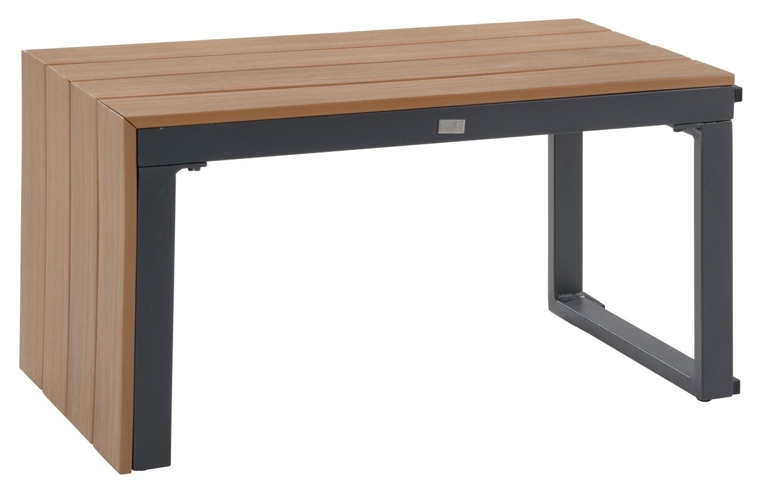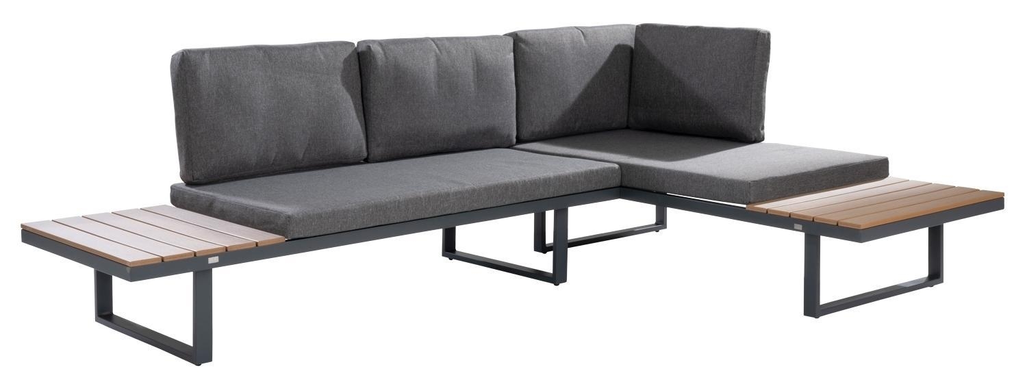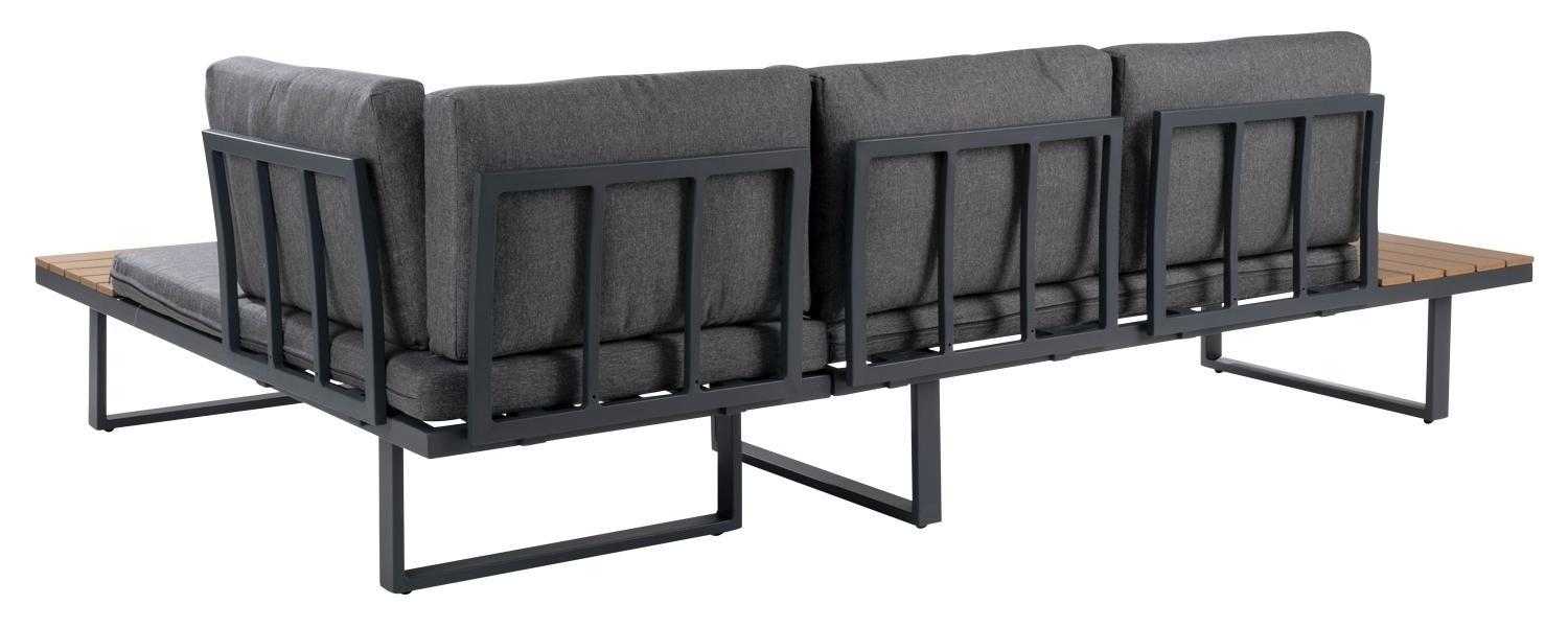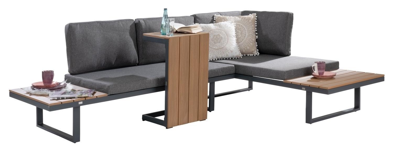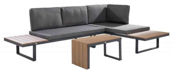 Die Gartenlounge in anthrazit besteht aus pulverbeschichtetem Aluminium, ist somit sehr leicht in der Handhabung und ist durch die hochwertige Beschichtung, leicht zu reinigen und witterungsbeständig. Die Tischplatte und die Seitenteile der Lounge bestehen aus wasserabweisendem Holzimitat auf Kunststoffbasis. Die Rücken- und Armlehnen der Gartenlounge sind variabel einsteckbar. Dadurch kann die Lounge zu zwei Einzelliegen umgebaut werden.