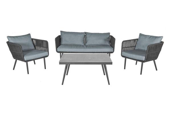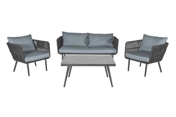 Die Gartenlounge SAIGON der Marke Home4You ist ein vierteiliges Gartenlounge-Set aus Stahl in der Farbe Anthrazit. Es besteht aus einem 2-Sitzer, zwei Gartensesseln und einem niedrigen Loungetisch mit einer Keramikplatte. Die Sitz- und Rückenkissenbezüge sind aus Polyester in Hellgrau gefertigt. Rücken- und Seitenbespannungen bestehen aus Seilen. Die Sitzflächen sind jeweils bis maximal 110 kg belastbar.